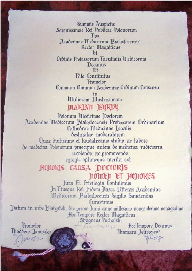 W latach 1962-1966 prof. Maria Byrdy przez dwie kadencje pełniła obowiązki prodziekana ds. bytowych studentów, a w latach 1966-1969 dziekana Wydziału Lekarskiego AM w Białymstoku. W dniu 01.06.1990 r. Prof. dr Maria Byrdy otrzymała tytuł doktora honoris causa Akademii Medycznej w Białymstoku (zdj. 12), a w 1995 r. przyznano jej medal Profesora Kitasato z Japonii za pionierskie prace w dziedzinie medycyny sądowej (zdj. 13).