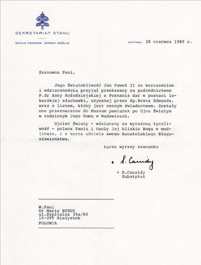 W 1992 roku prof. dr Maria Byrdy ofiarowała Janowi Pawłowi II słuchawki lekarskie, które pozostały po zmarłym na szkarlatynę w 1932 r. młodym lekarzu Edmundzie Wojtyle (starszym bracie Papieża). Za ten dar Jan Paweł II przesłał Profesor serdeczne podziękowania (zdj. 14).