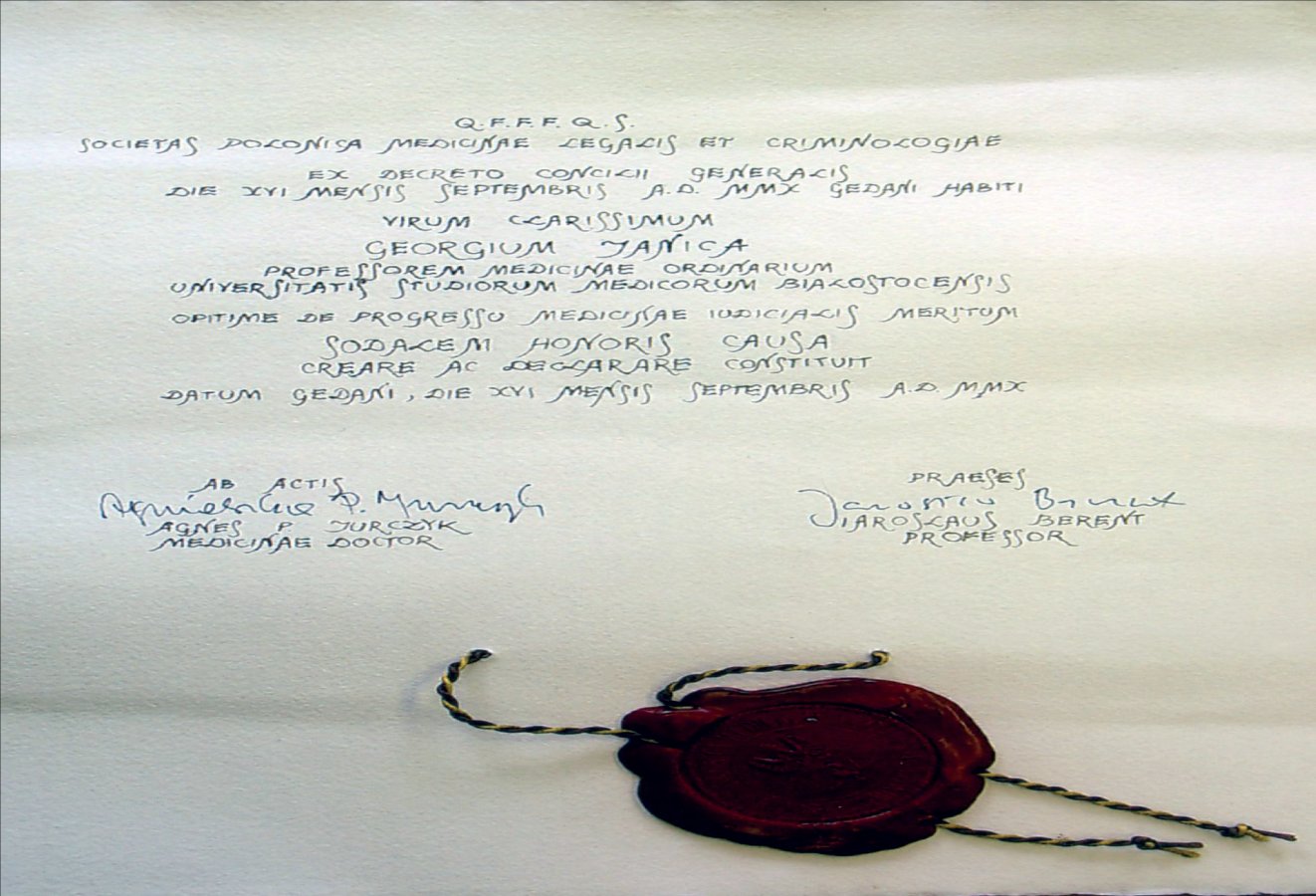 Działalność prof. Jerzego Janicy na rzecz Państwa Polskiego i obywateli, a także wybitne osiągnięcia na polu oświaty i nauki zostały uhonorowane Złotym Krzyżem Zasługi i Krzyżem Kawalerskim Orderu Odrodzenia Polski. W roku 2011 Profesorowi nadano godność Członka Honorowego Towarzystwa Medycyny Sądowej i Kryminologii (zdj. 16).