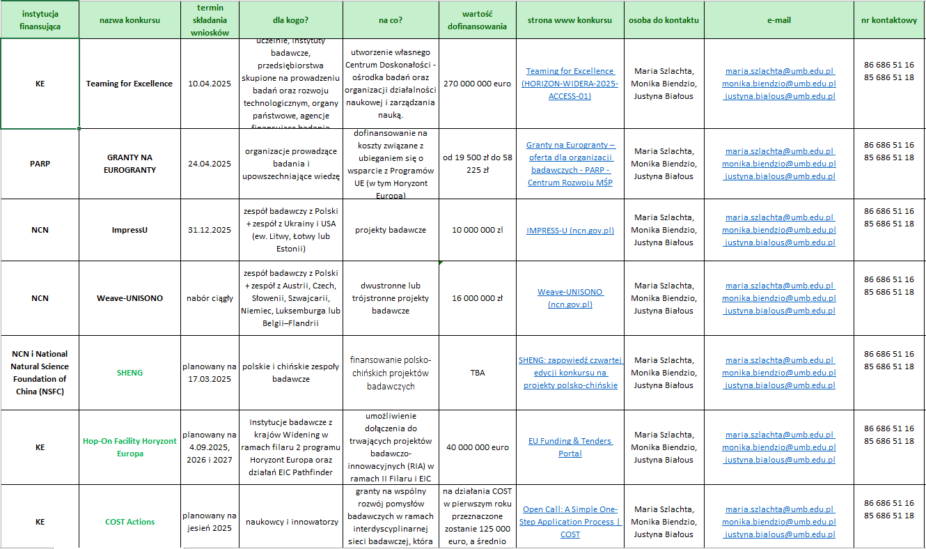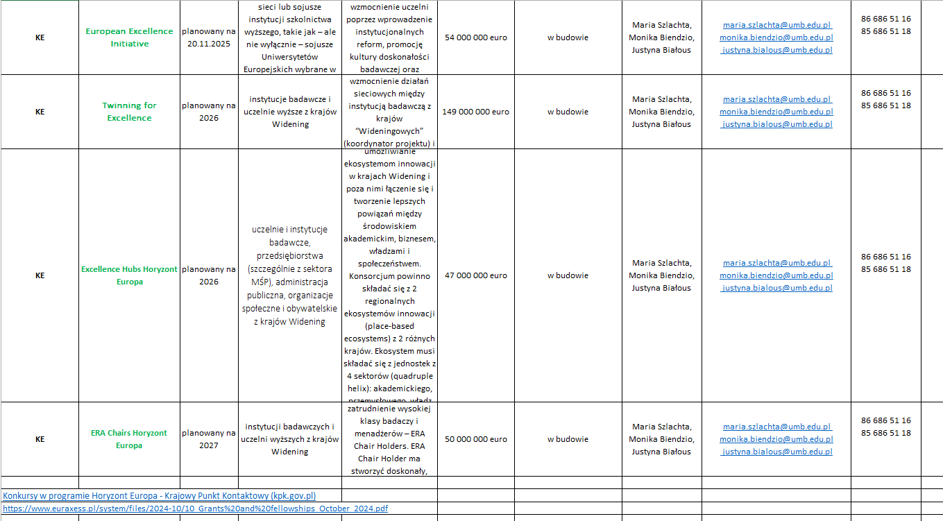 | ERA Chairs Horizon Europe | planowany na 2027 | EU Funding & Tenders Portal | Justyna Białous tel. 85 686 51 18