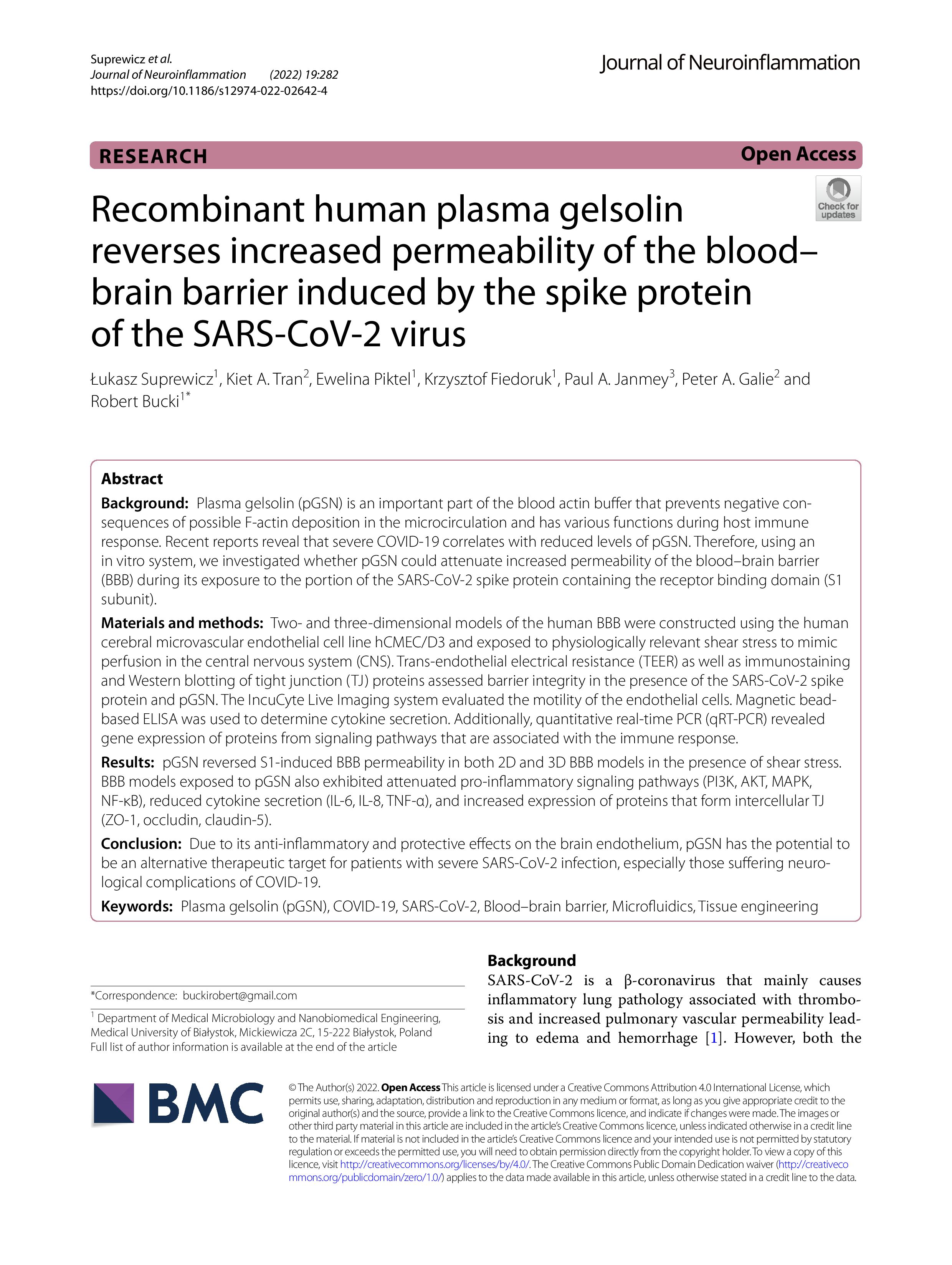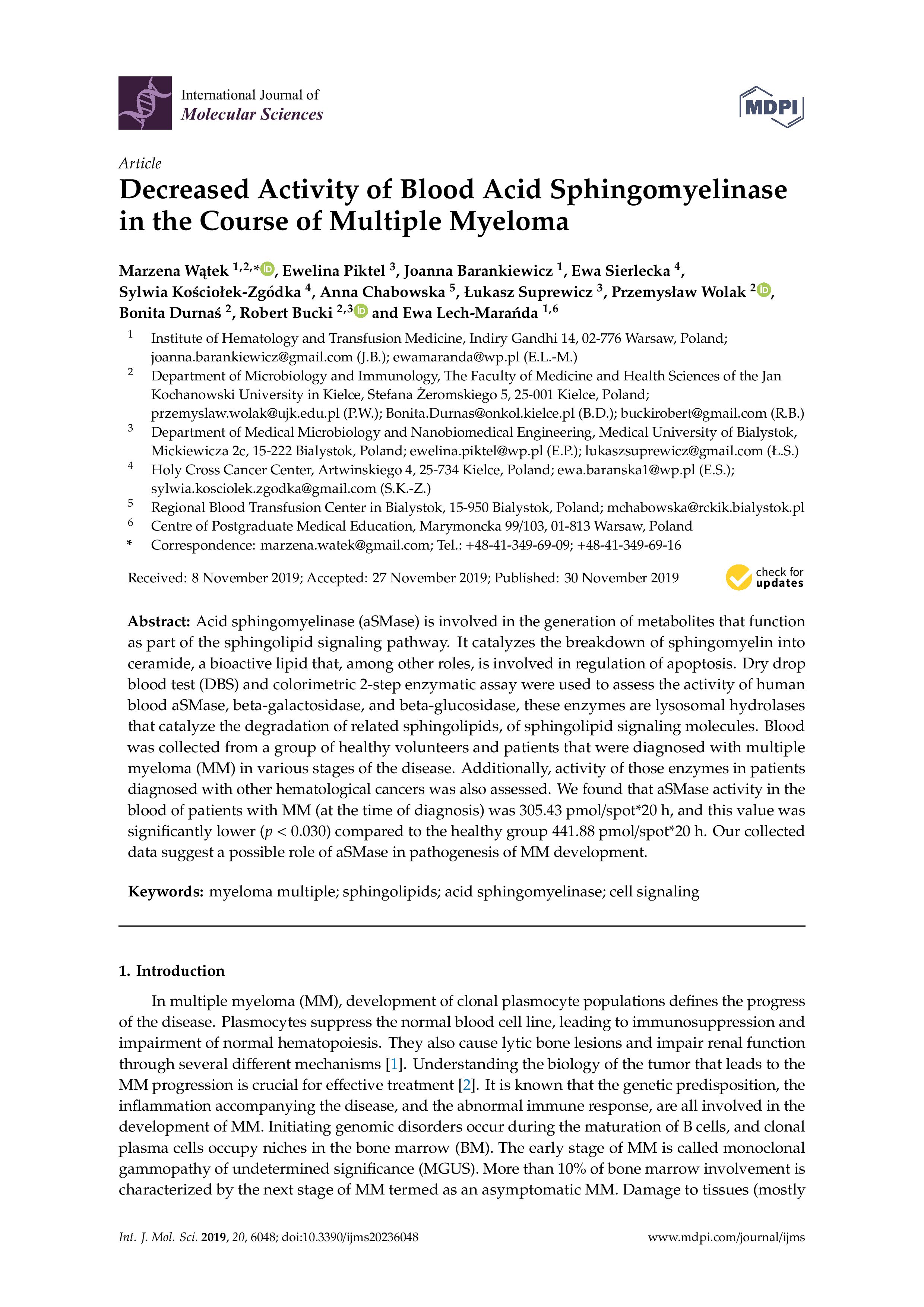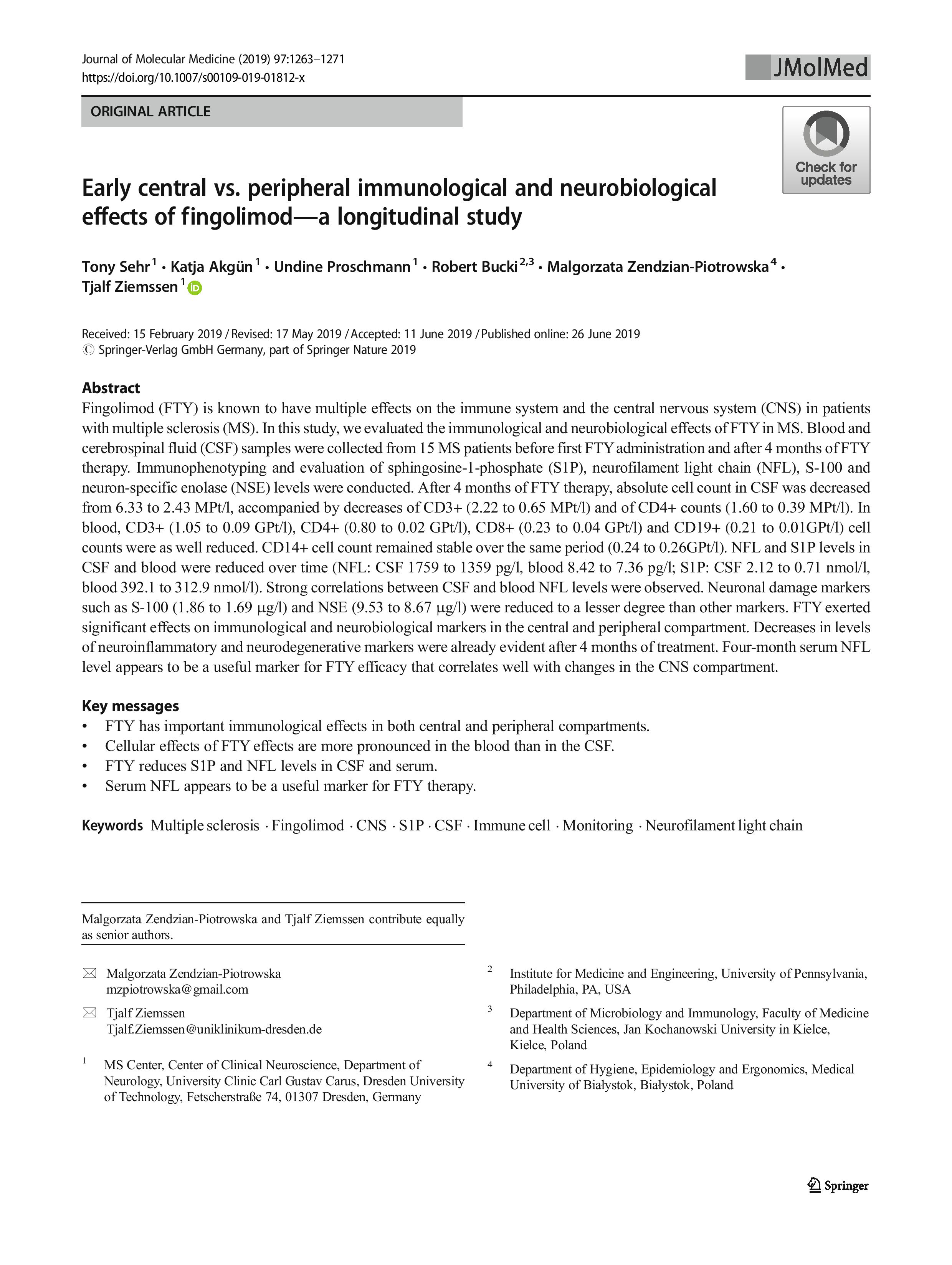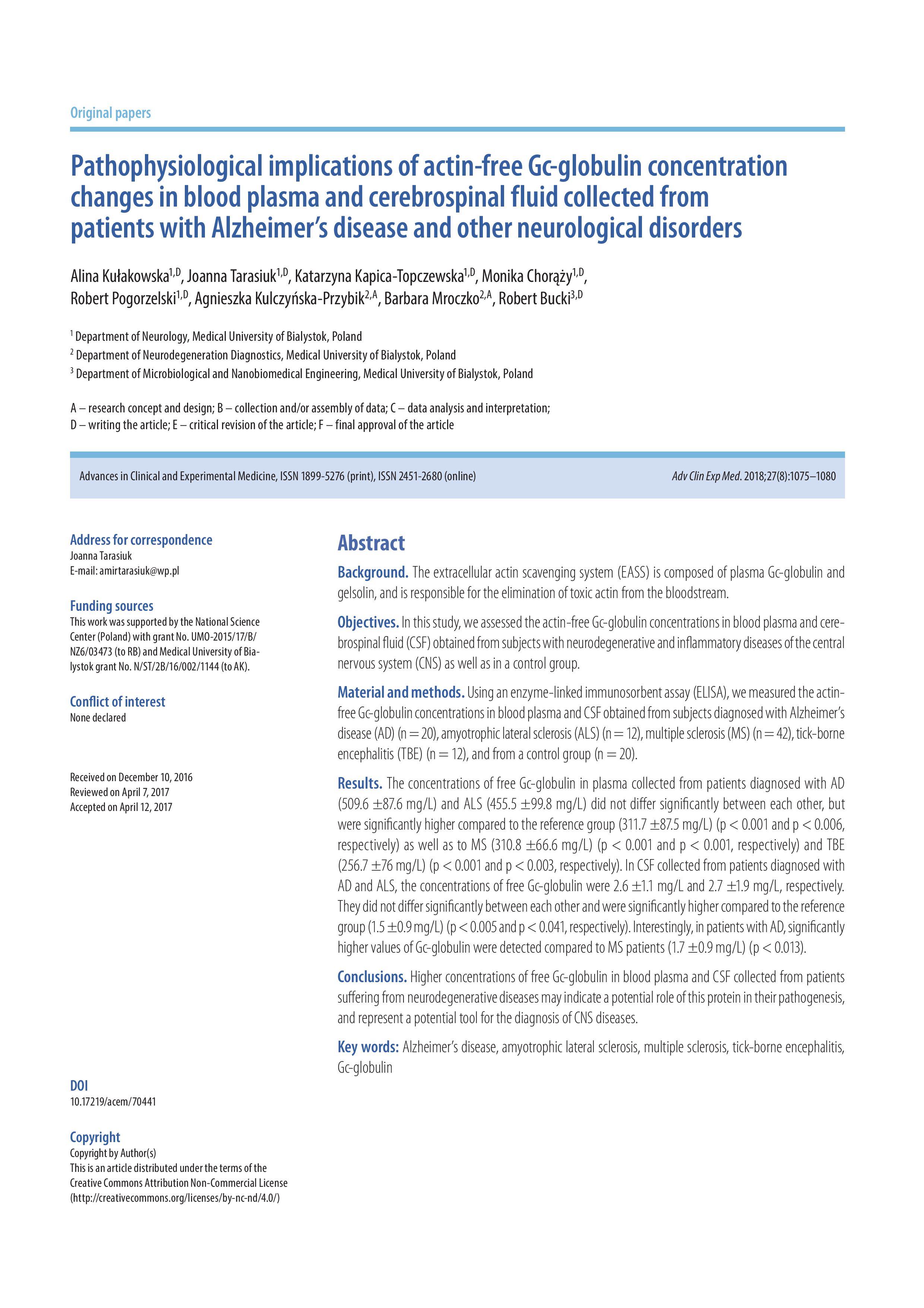 Alina Kułakowska, Fitzroy J. Byfield, Małgorzata Żendzian-Piotrowska, Joanna Maria Zajkowska, Wiesław Drozdowski, Barbara Mroczko, Paul A. Janmey, Robert Bucki. Increased levels of sphingosine-1-phosphate in cerebrospinal fluid of patients diagnosed with tick-borne encephalitis. Journal of Neuroinflammation; 2014 : 11, 193, 9 pp. IF=5.408
