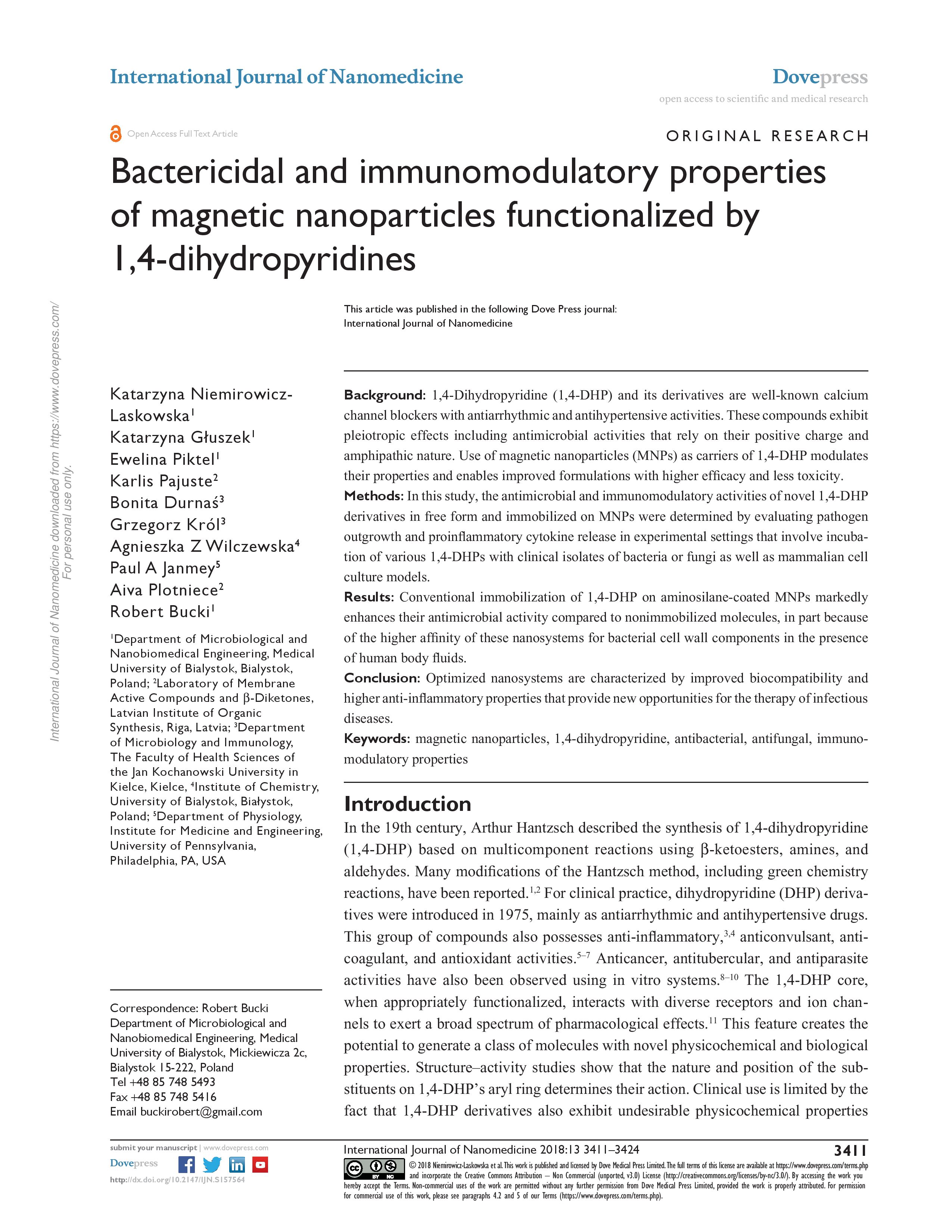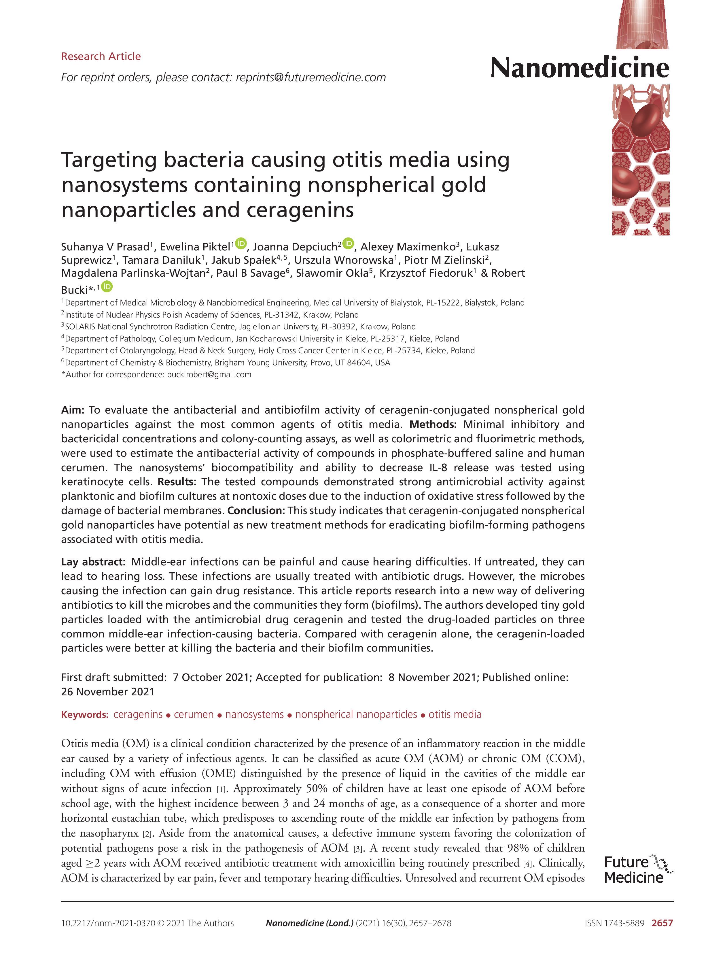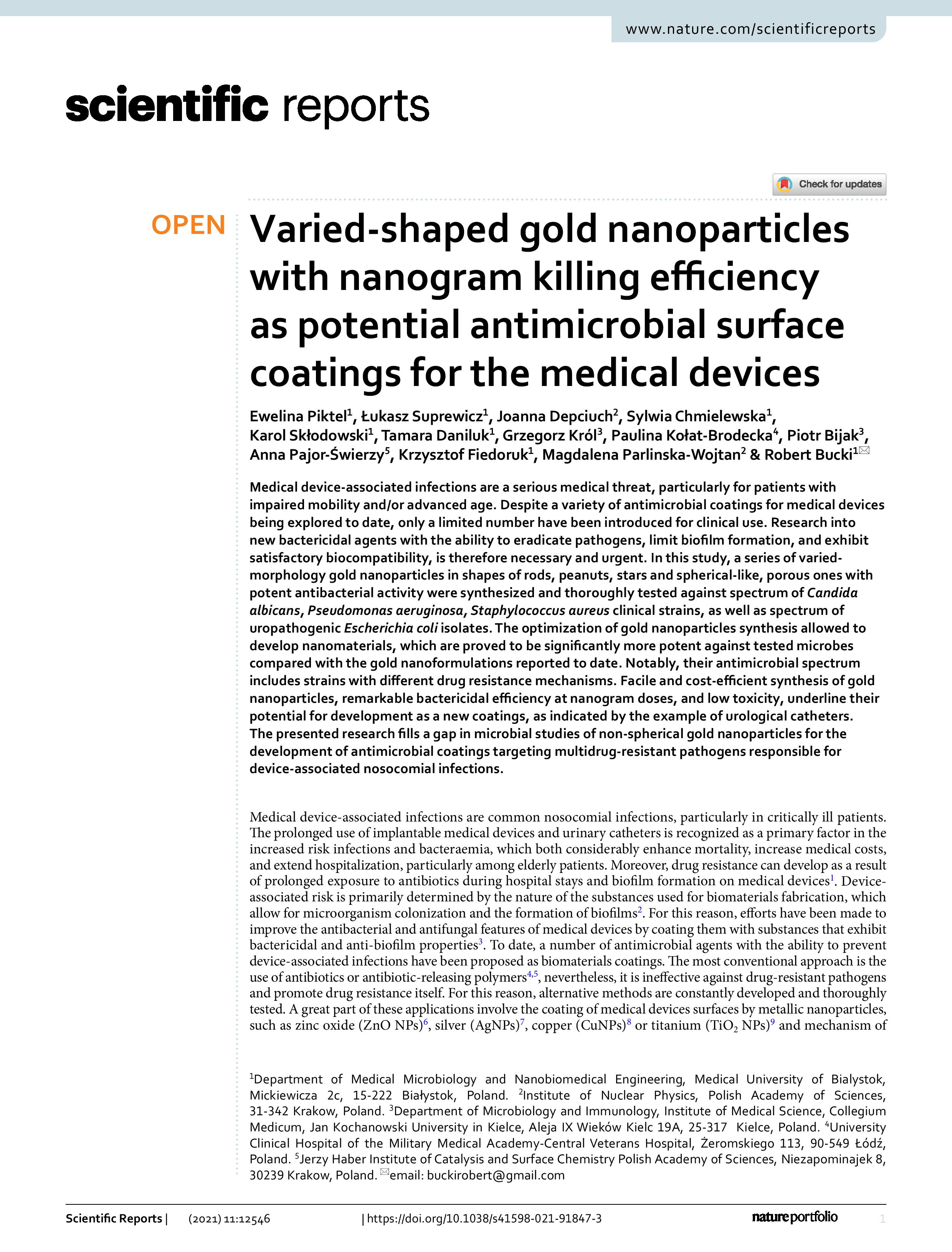 - Grzegorz Michalak, Katarzyna Głuszek, Ewelina Piktel, Piotr Deptuła, Irena Puszkarz, Katarzyna Niemirowicz, Robert Bucki. Polymeric nanoparticles - a novel solution for delivery of antimicrobial agents. Medical Studies /Studia Medyczne; 2016 : 32, 1, s. 56-62