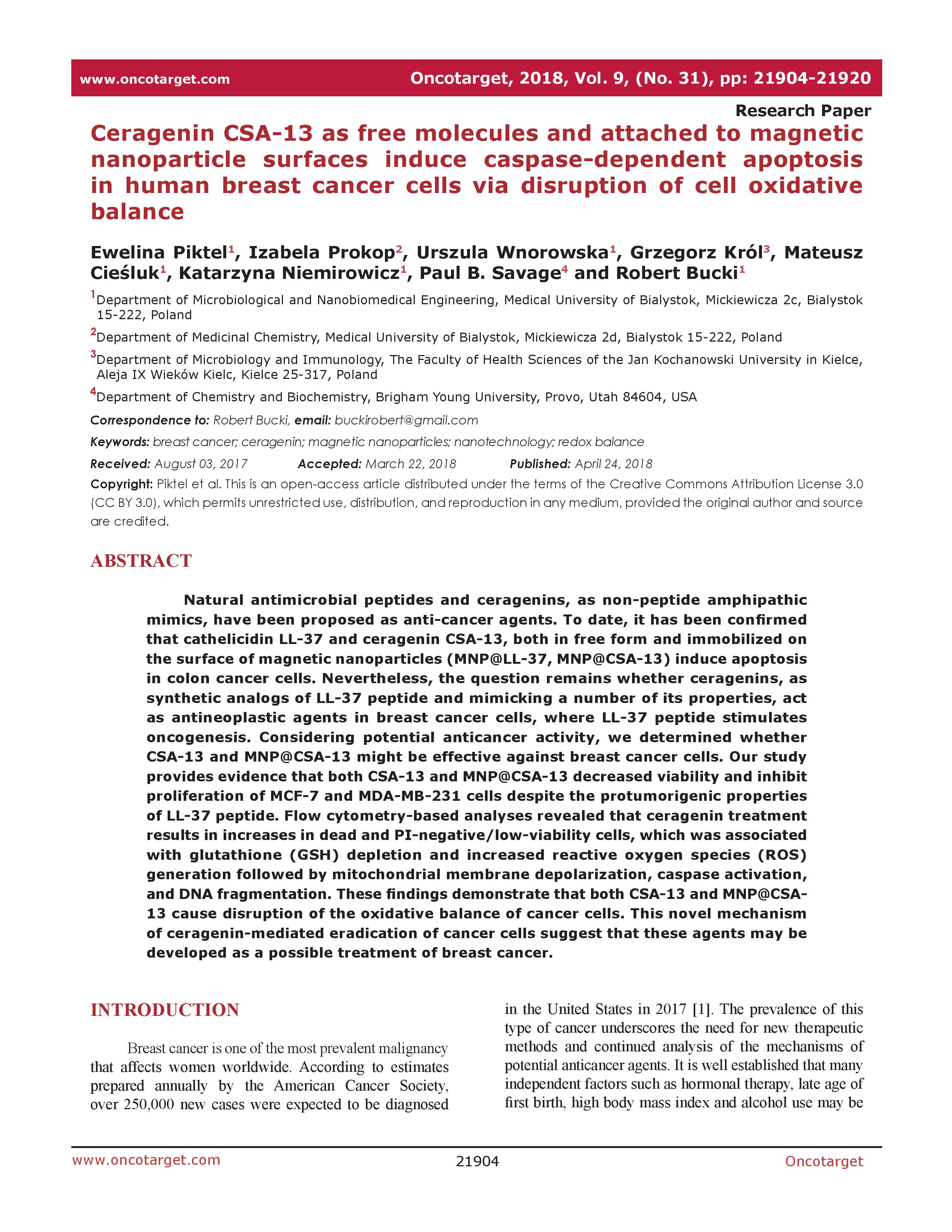 Katarzyna Niemirowicz, Izabela Prokop, Agnieszka Z. Wilczewska, Urszula Wnorowska, Ewelina Piktel, Paul B. Savage, Robert Bucki. Magnetic nanoparticles enhance the anticancer activity of cathelicidin LL-37 peptide against colon cancer cells. International Journal of Nanomedicine; 2015 : 10, s. 3843-3853. IF=4.320