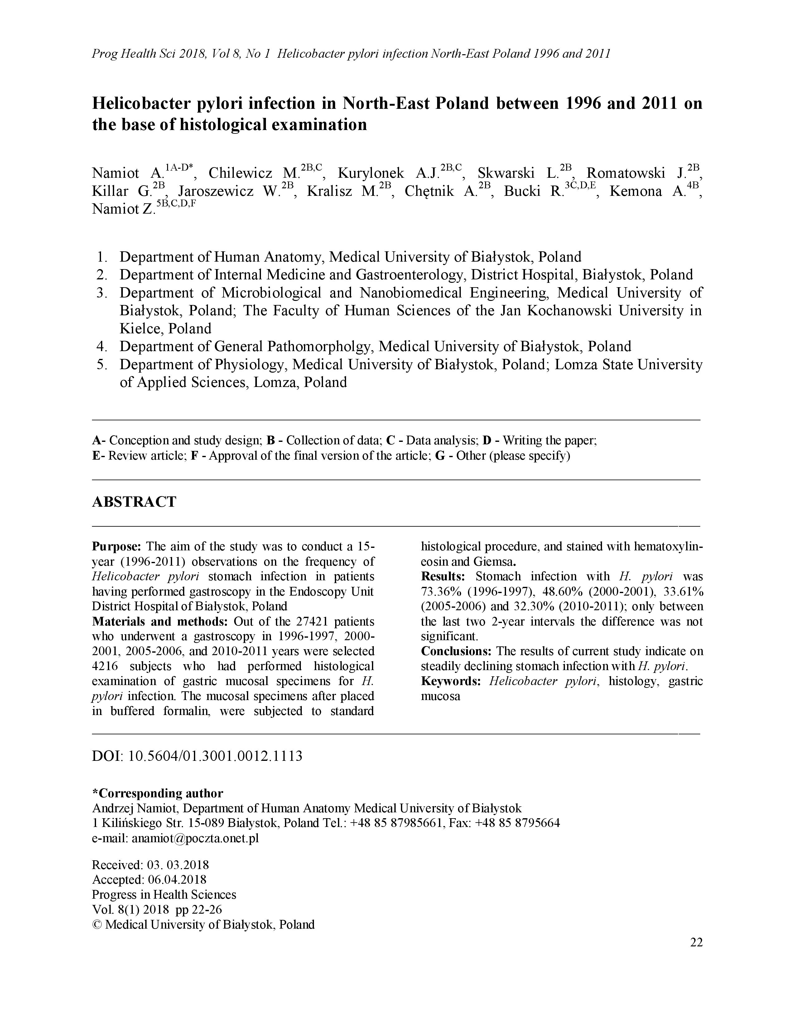 Andrzej Namiot, Katarzyna Leszczyńska, Dorota B. Namiot, Michał Chilewicz, Robert Bucki, Andrzej Kemona, Zbigniew Namiot. Application of Helicobacter pylori antigen test to evaluate gastric mucosa specimens. Progress in Health Sciences; 2014 : 4, 2, s. 52-57.
