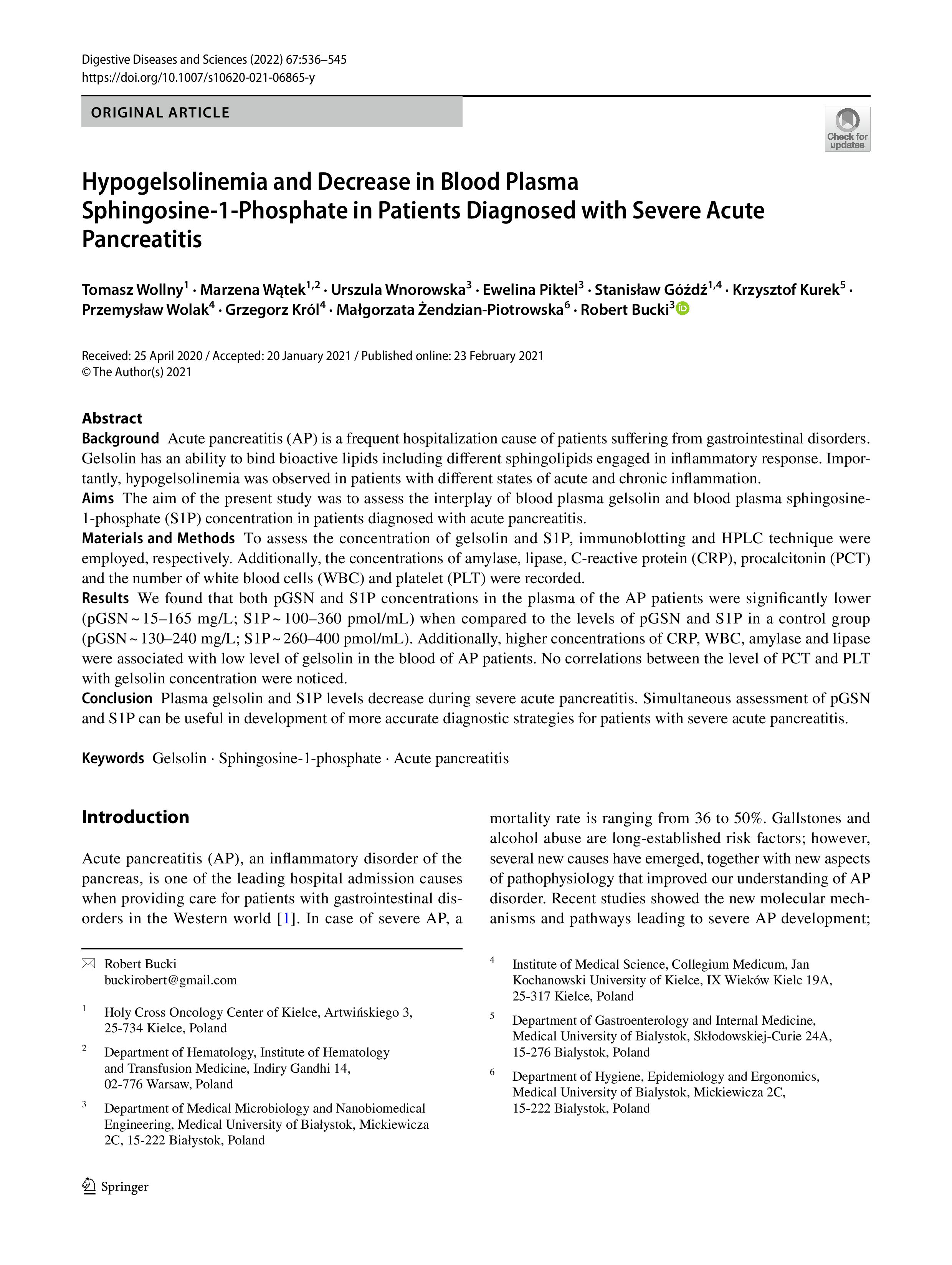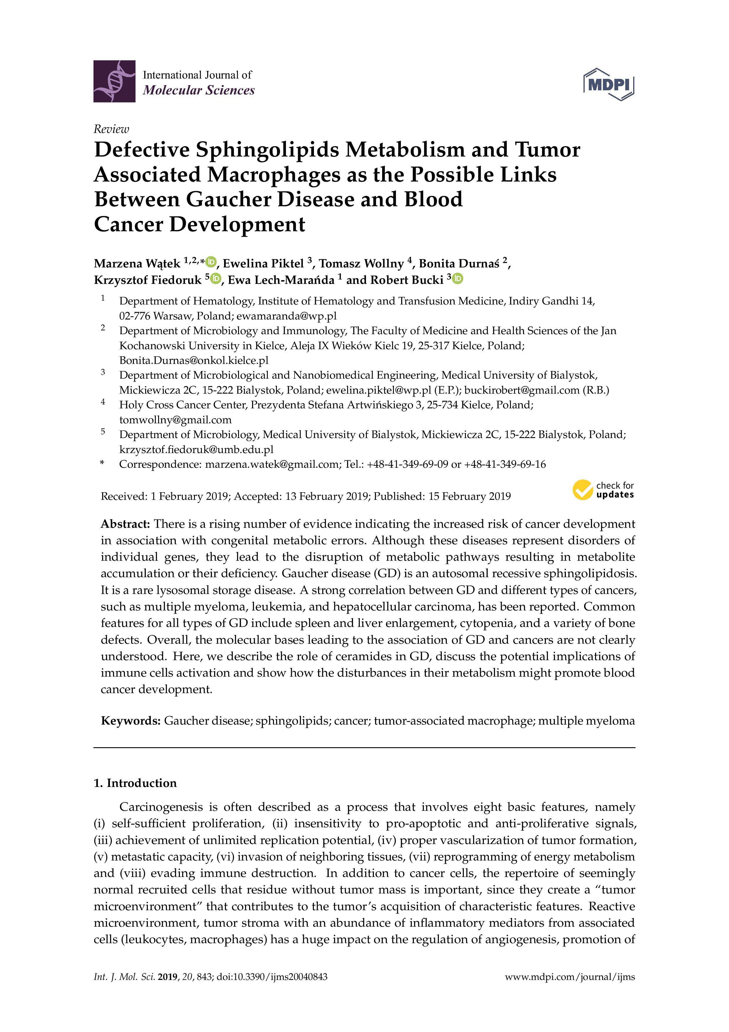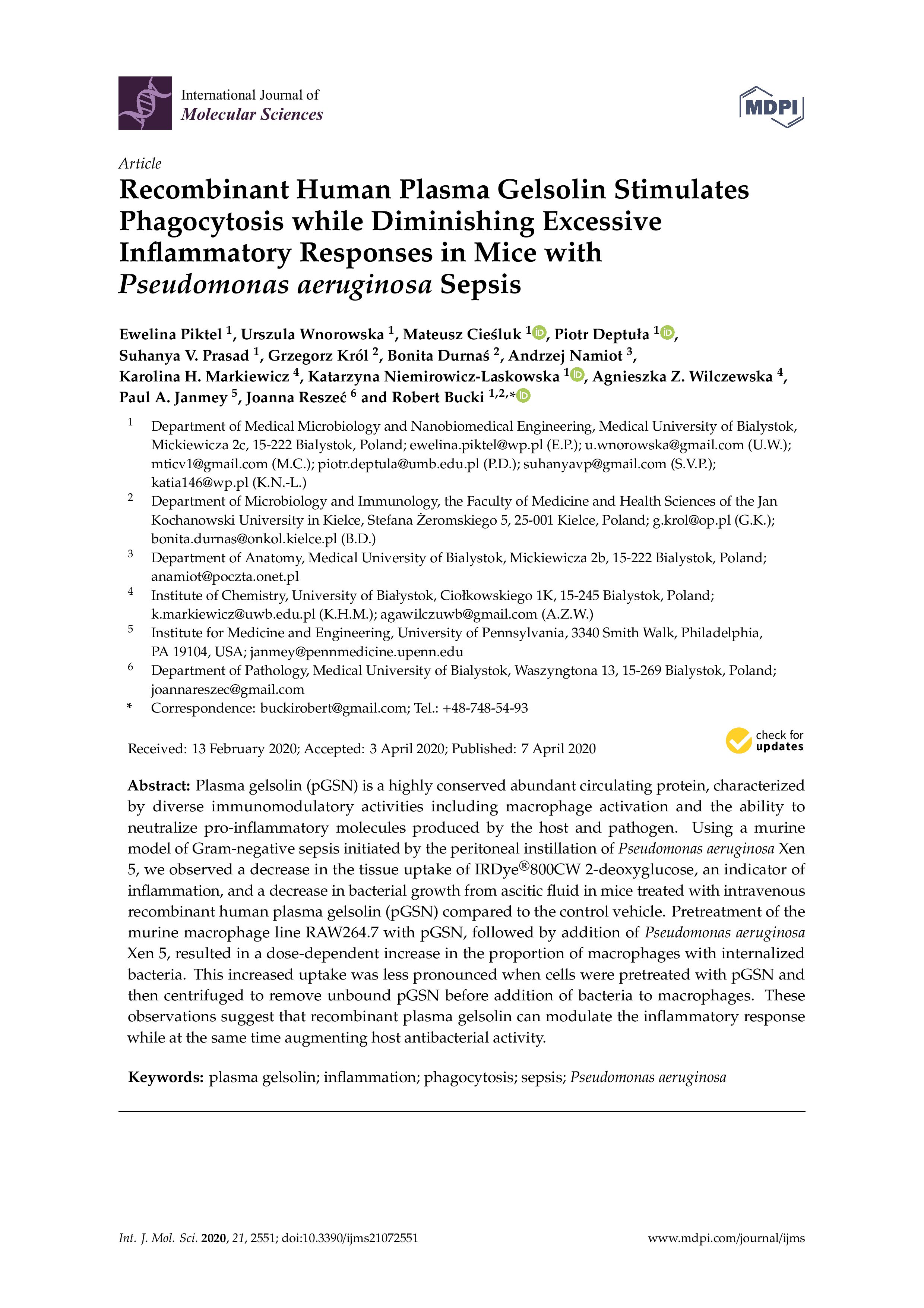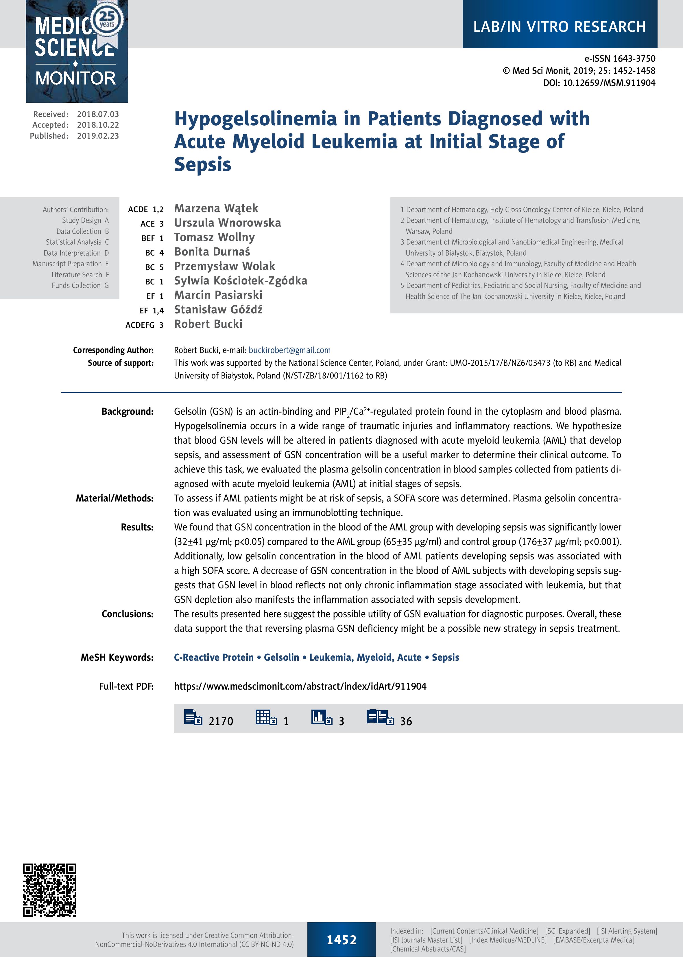 Ewelina Piktel, Katarzyna Niemirowicz, Urszula Wnorowska, Marzena Wątek, Tomasz Wollny, Katarzyna Głuszek, Stanisław Góźdź, Ilya Levental, Robert Bucki. The role of cathelicidin LL-37 in cancer development. Archivum Immunologiae et Therapiae Experimentalis; 2016 : 64, 1, s. 33-46. IF=2.464