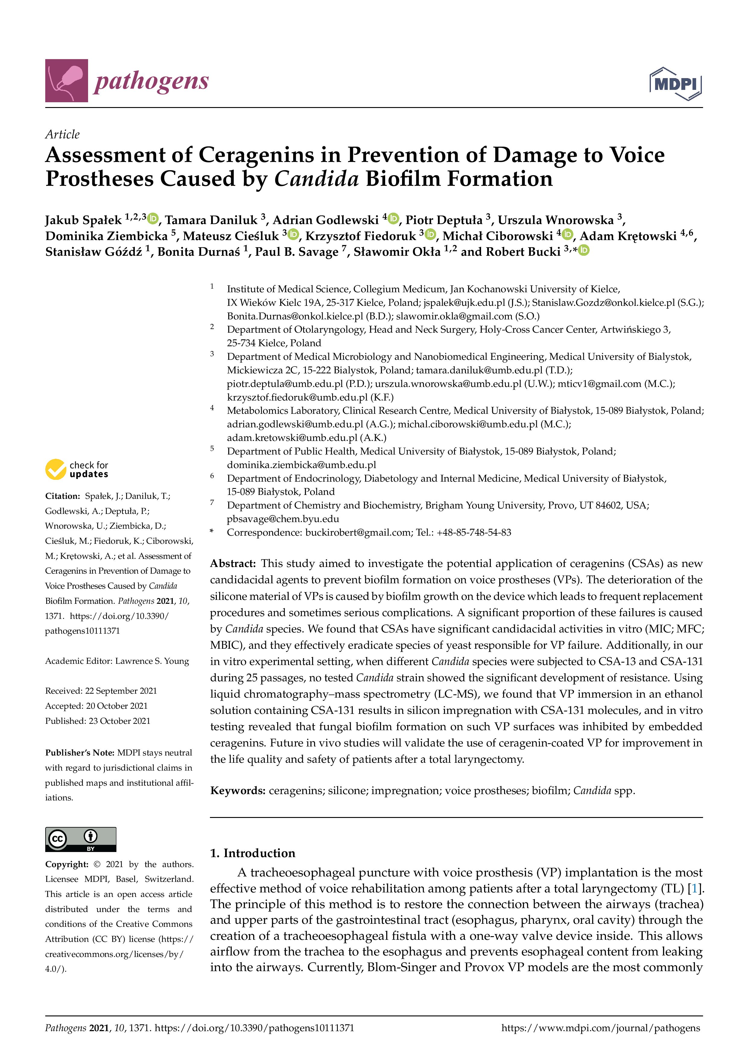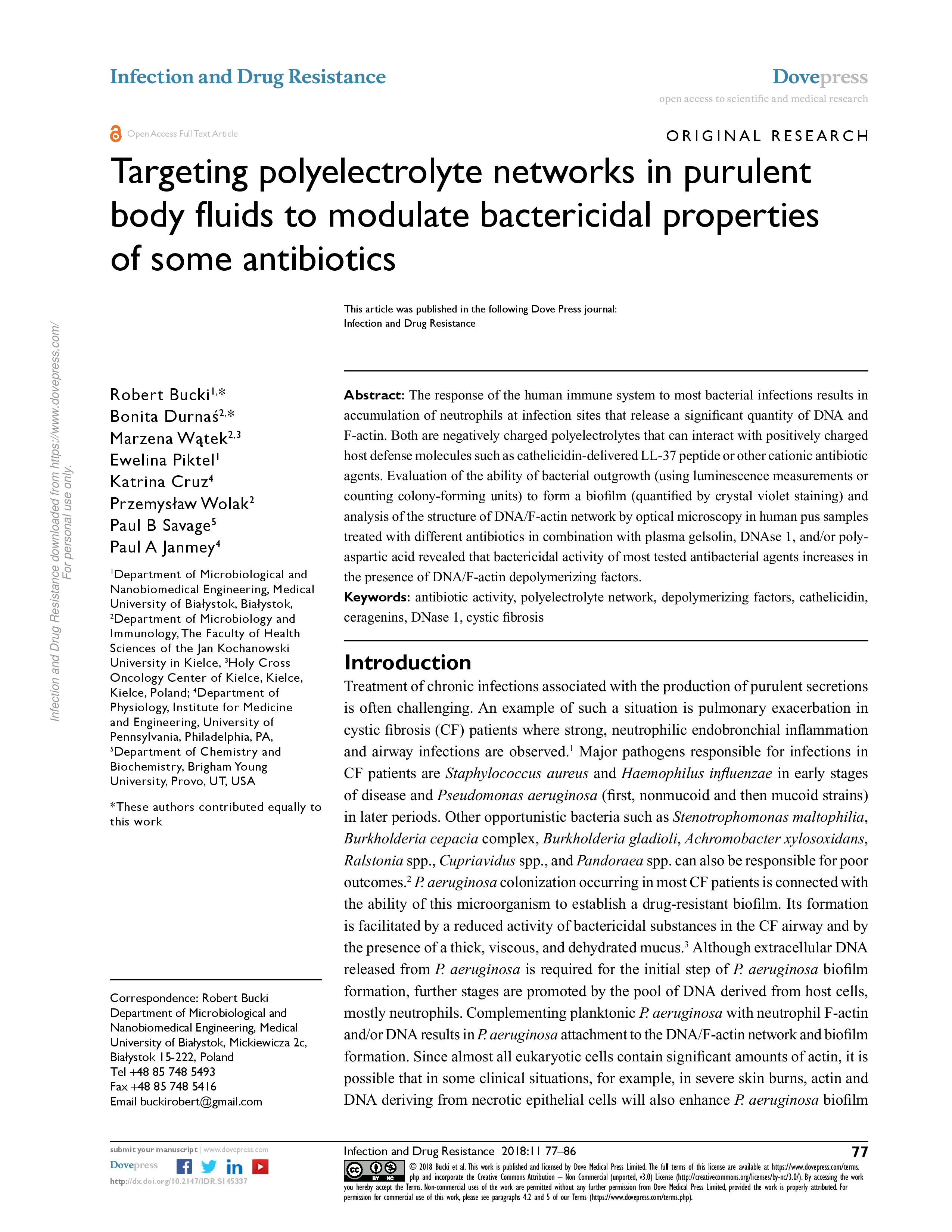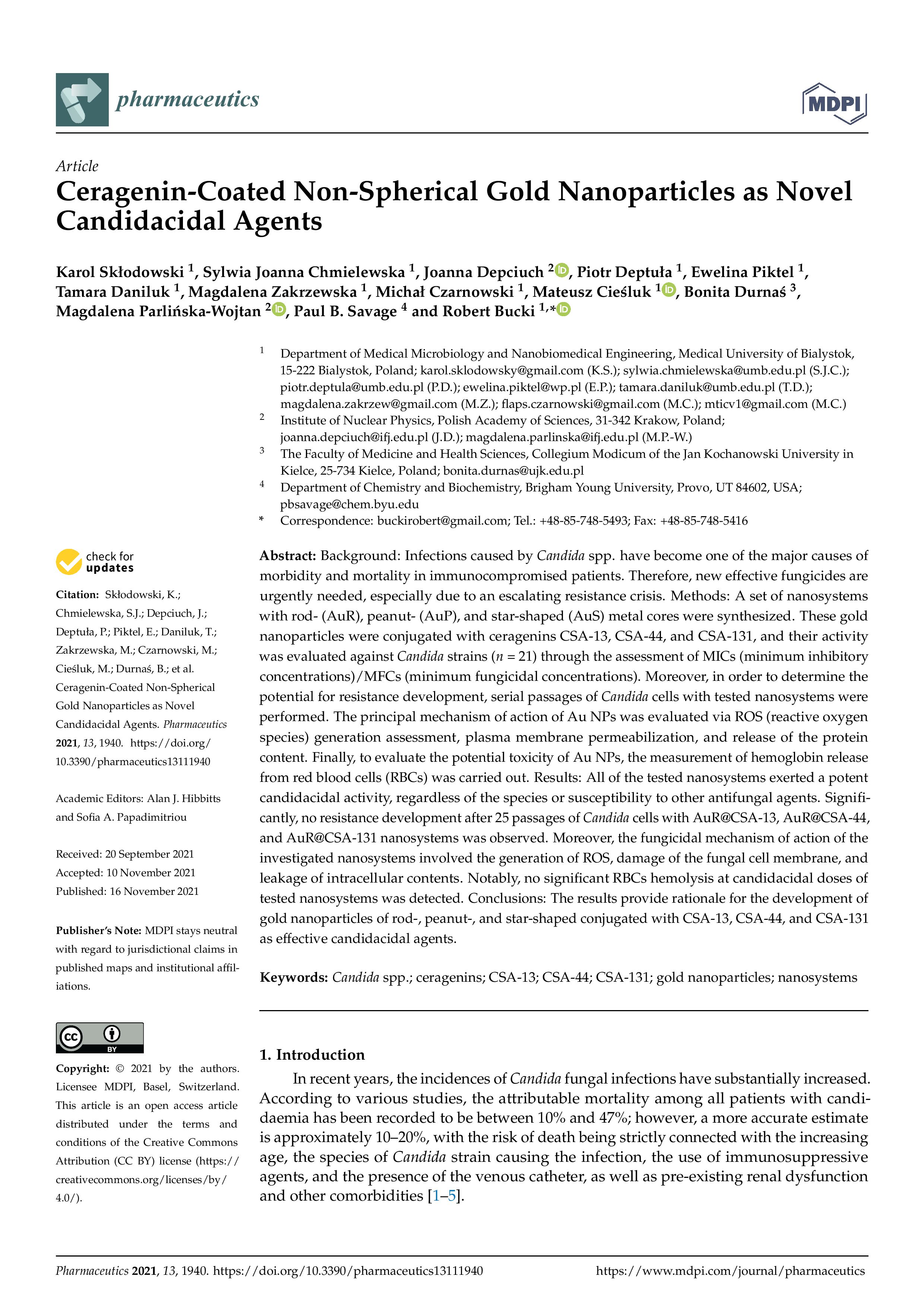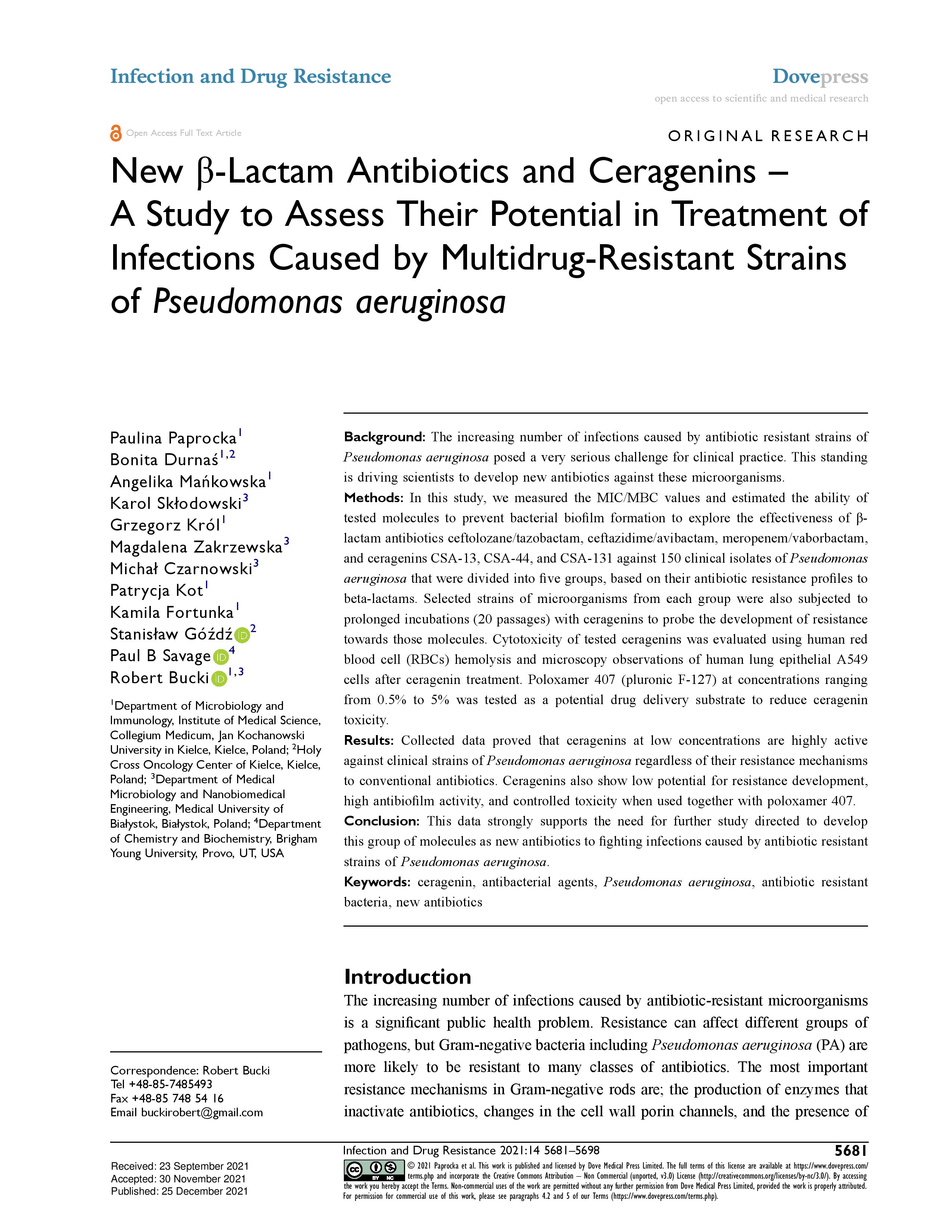- Bonita Durnaś, Urszula Wnorowska, Katarzyna Pogoda, Piotr Deptuła, Marzena Wątek, Ewelina Piktel, Stanisław Głuszek, Xiaobo Gu, Paul B. Savage, Katarzyna Niemirowicz, Robert Bucki. Candidacidal activity of selected ceragenins and human cathelicidin LL-37 in experimental settings mimicking infection sites. PLoS ONE; 2016 : 11, 6, e0157242. IF=3.234