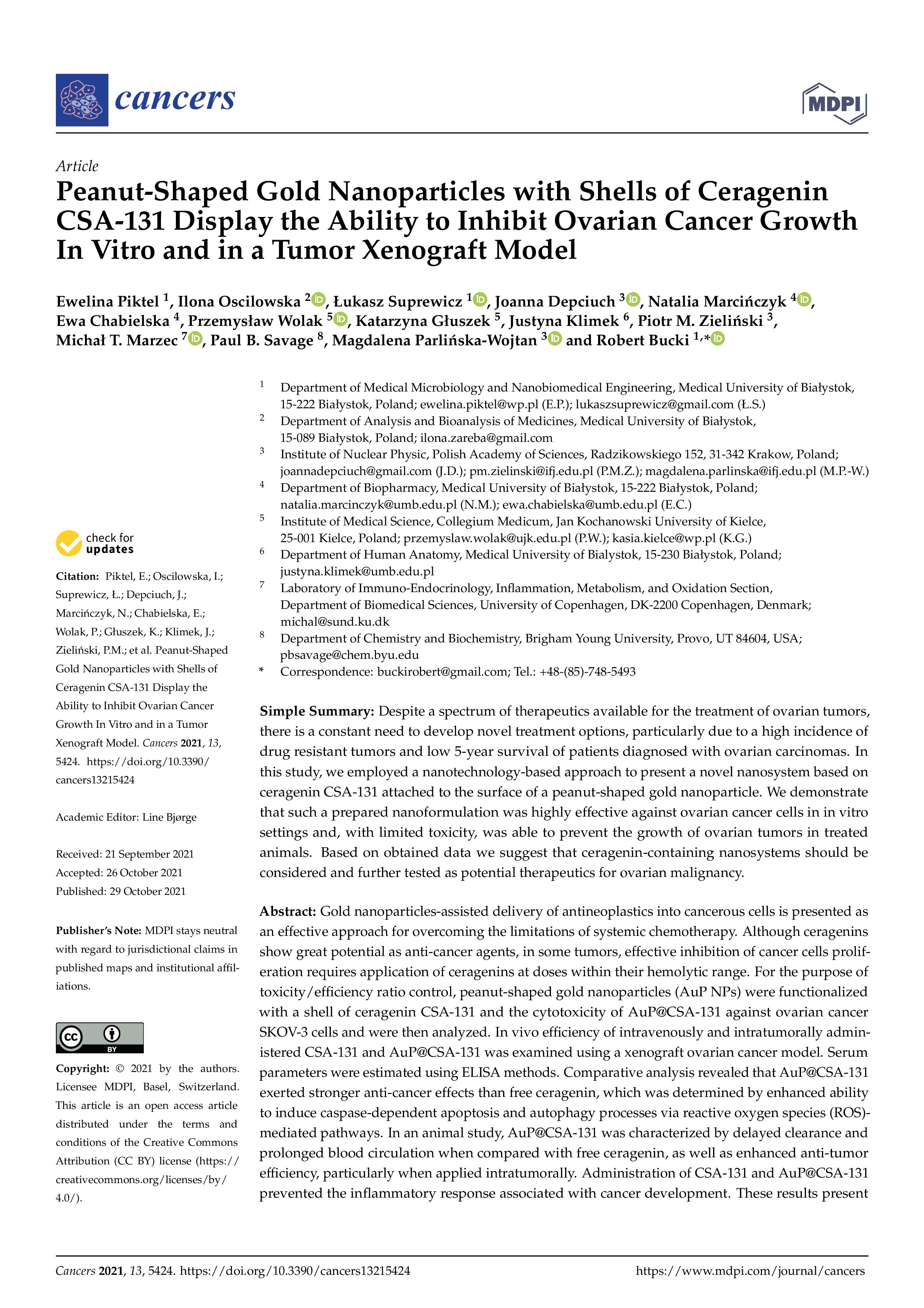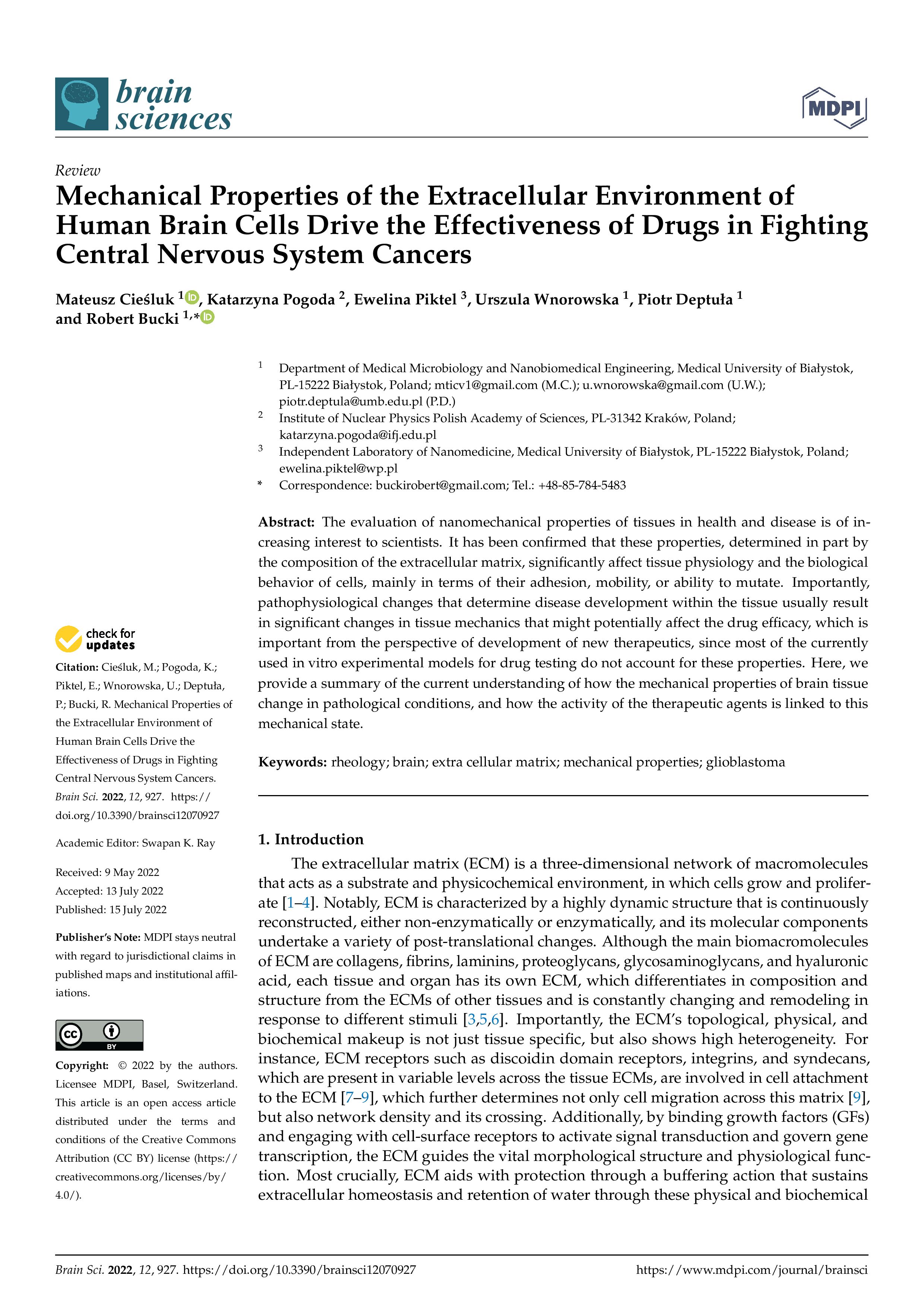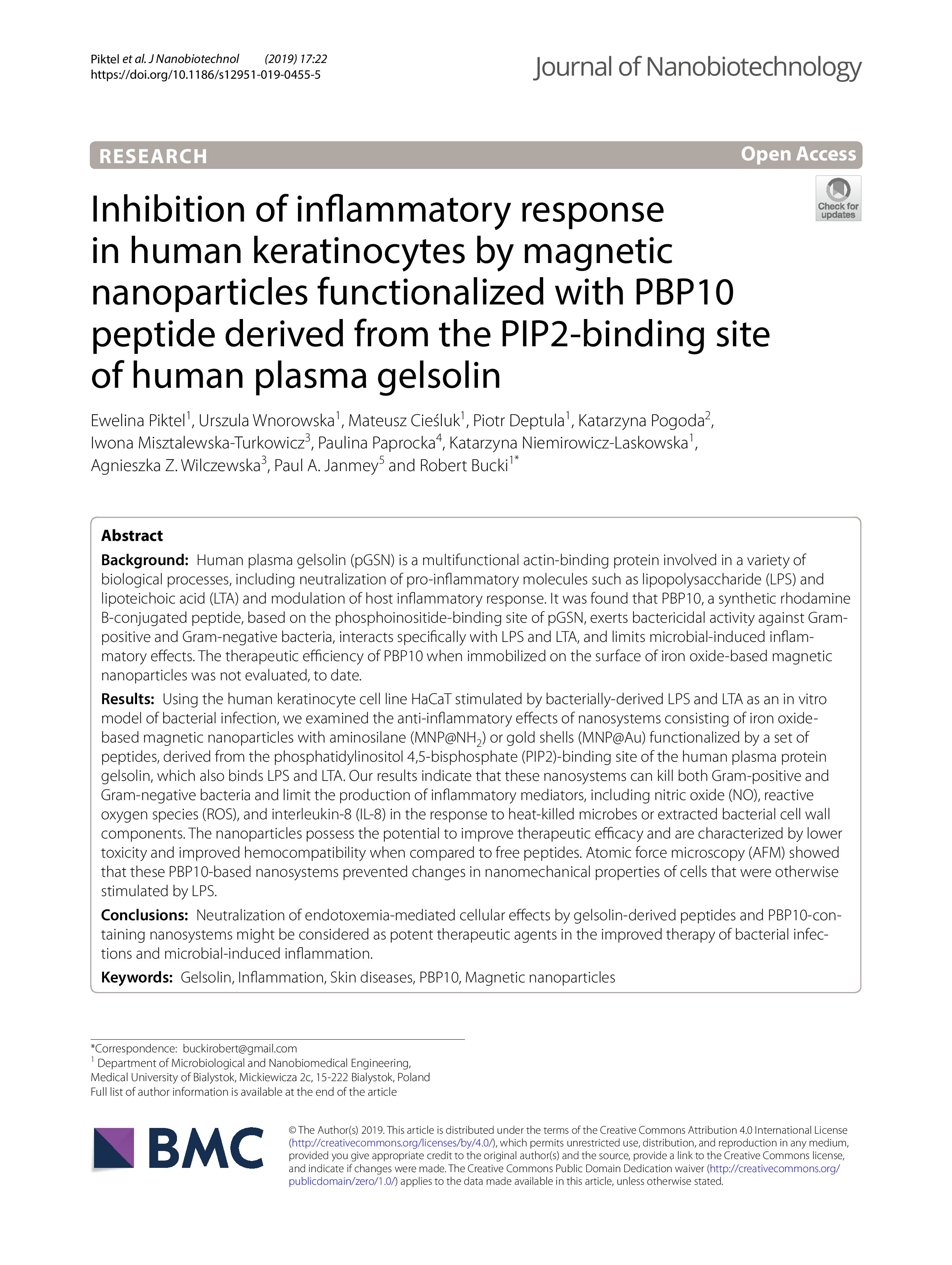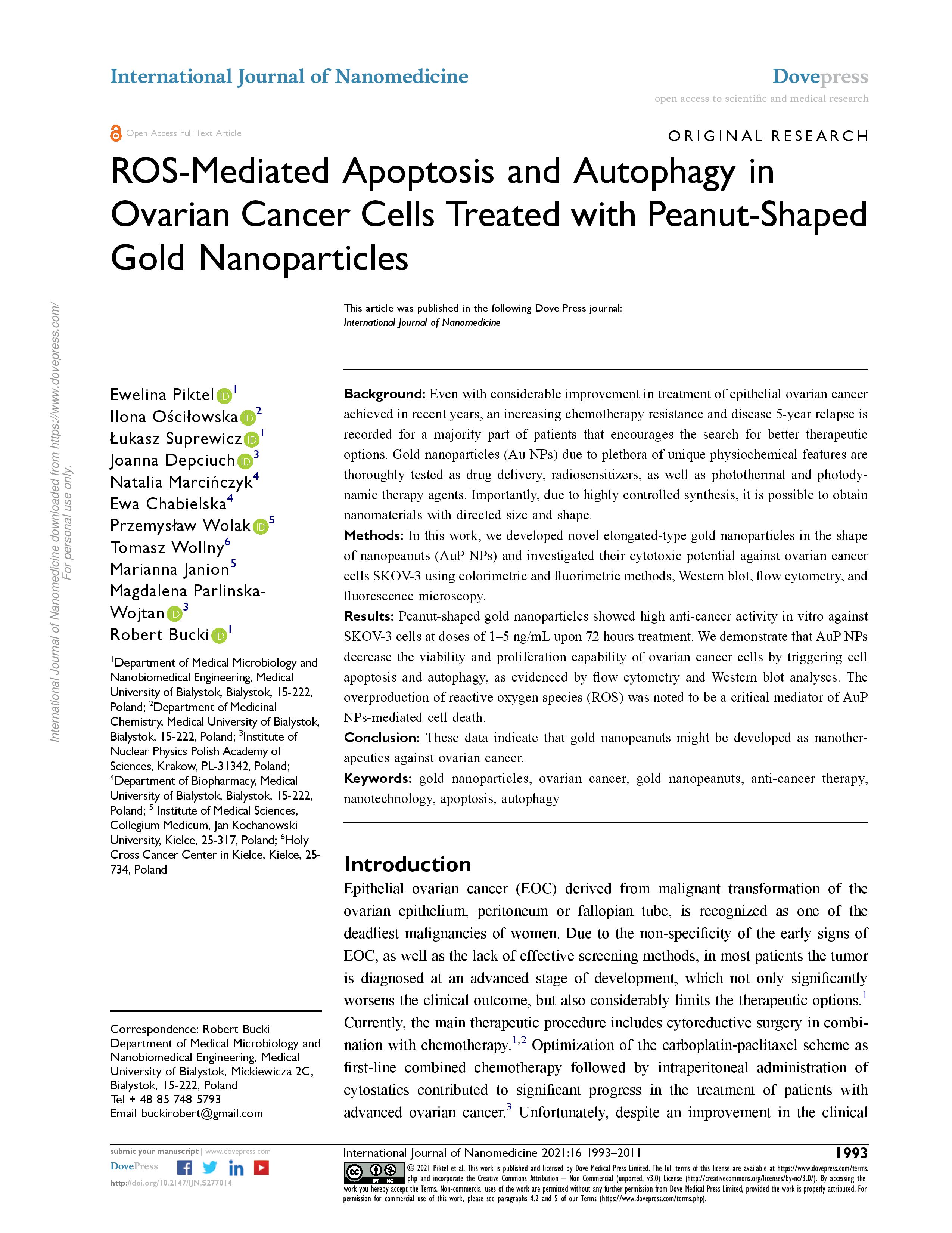 Ewelina Piktel, Katarzyna Niemirowicz, Marzena Wątek, Tomasz Wollny, Piotr Deptuła, Robert Bucki. Recent insights in nanotechnology-based drugs and formulations designed for effective anti-cancer therapy. Journal of Nanobiotechnology; 2016 : 14, 1, 23 pp. IF=4.239