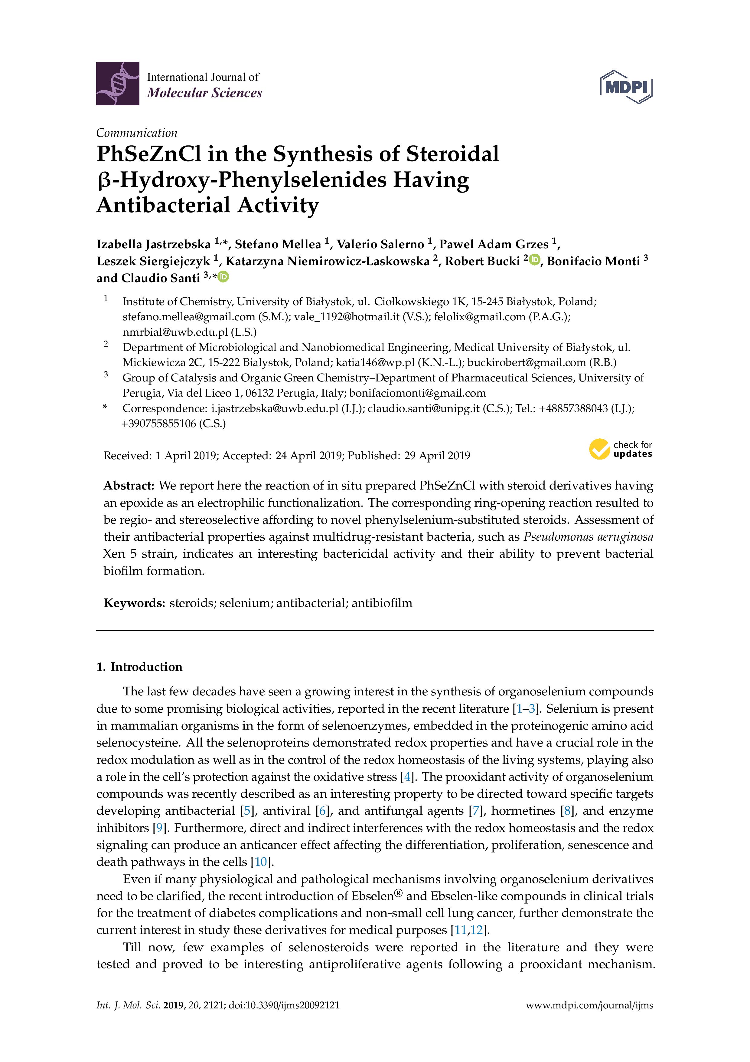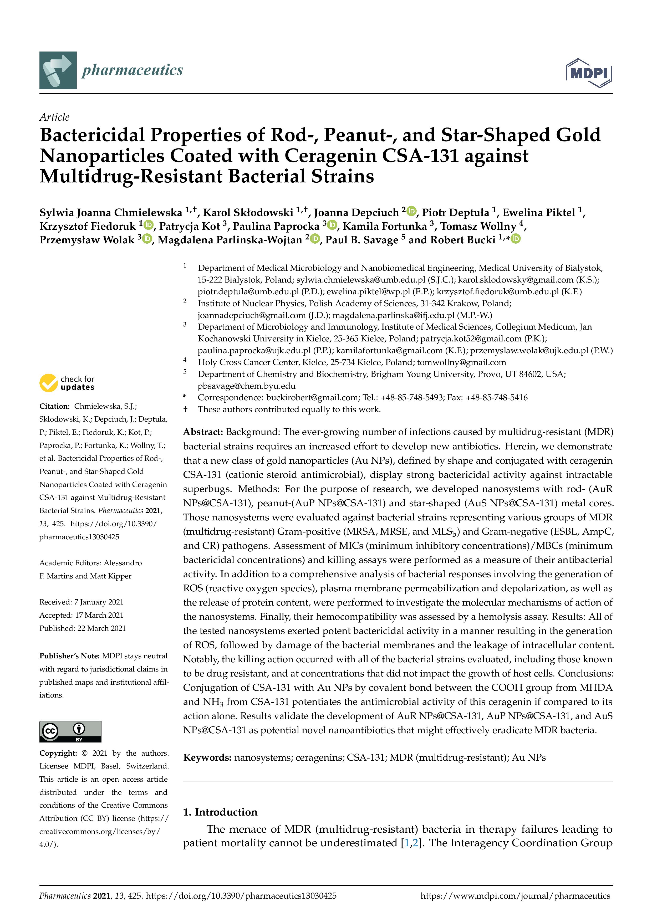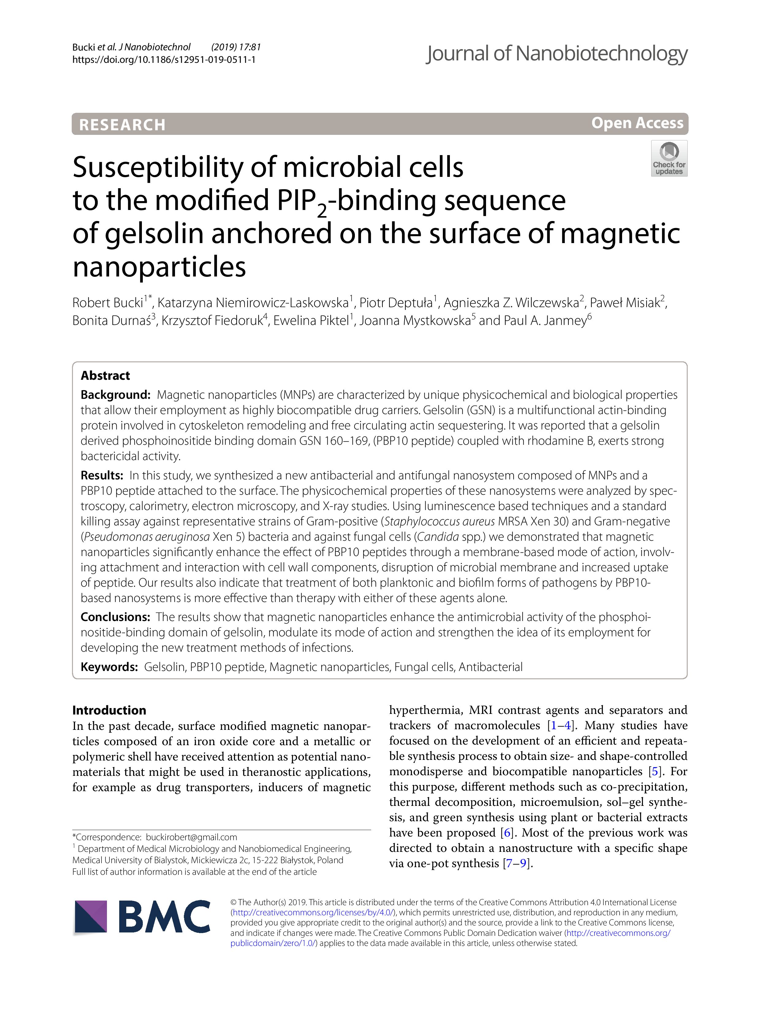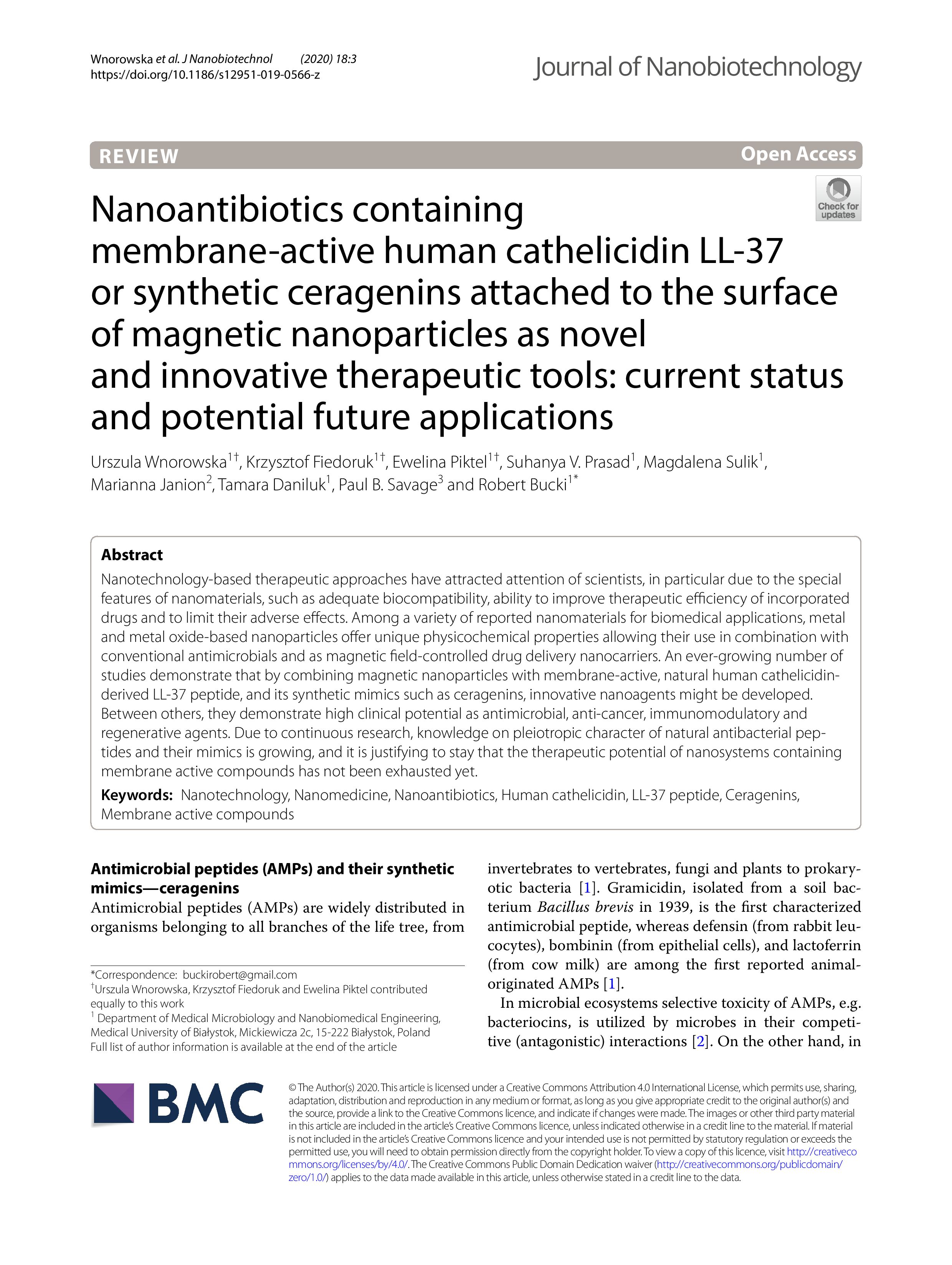 Katarzyna Niemirowicz, Urszula Surel, Agnieszka Z. Wilczewska, Joanna Mystkowska, Ewelina Piktel, Xiaobo Gu, Zbigniew Namiot, Alina Kułakowska, Paul B. Savage, Robert Bucki. Bactericidal activity and biocompatibility of ceragenin-coated magnetic nanoparticles. Journal of Nanobiotechnology; 2015 : 13, art. no. 32, 11 pp. IF=4.239