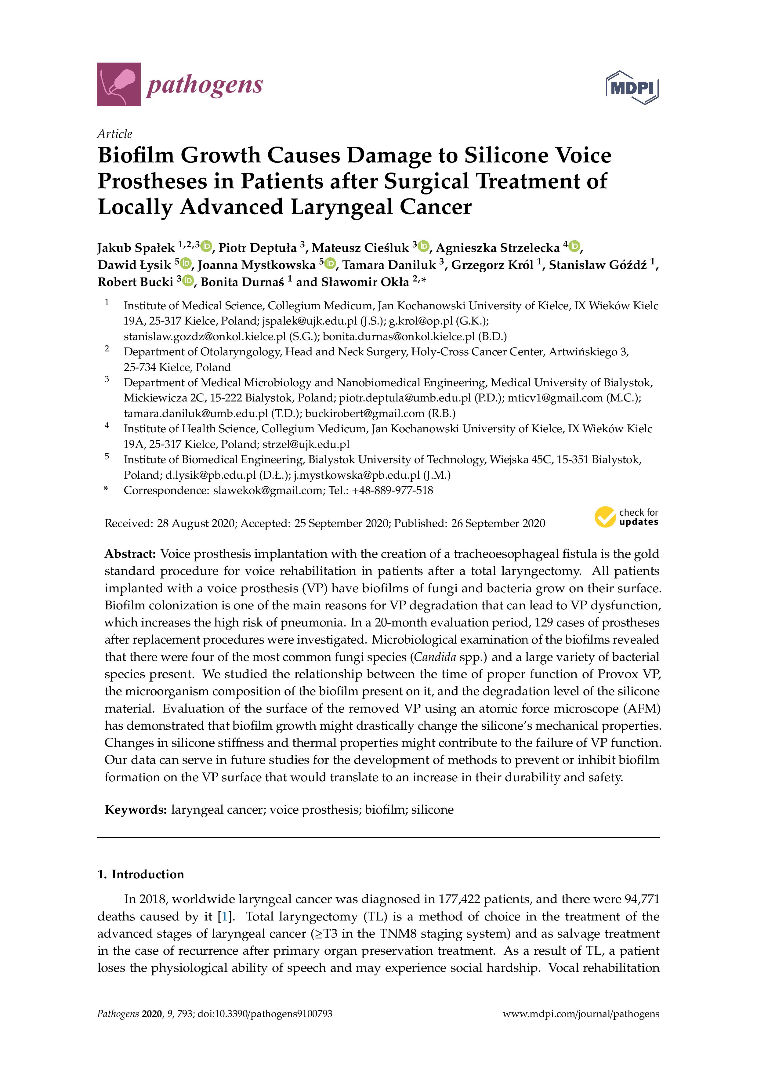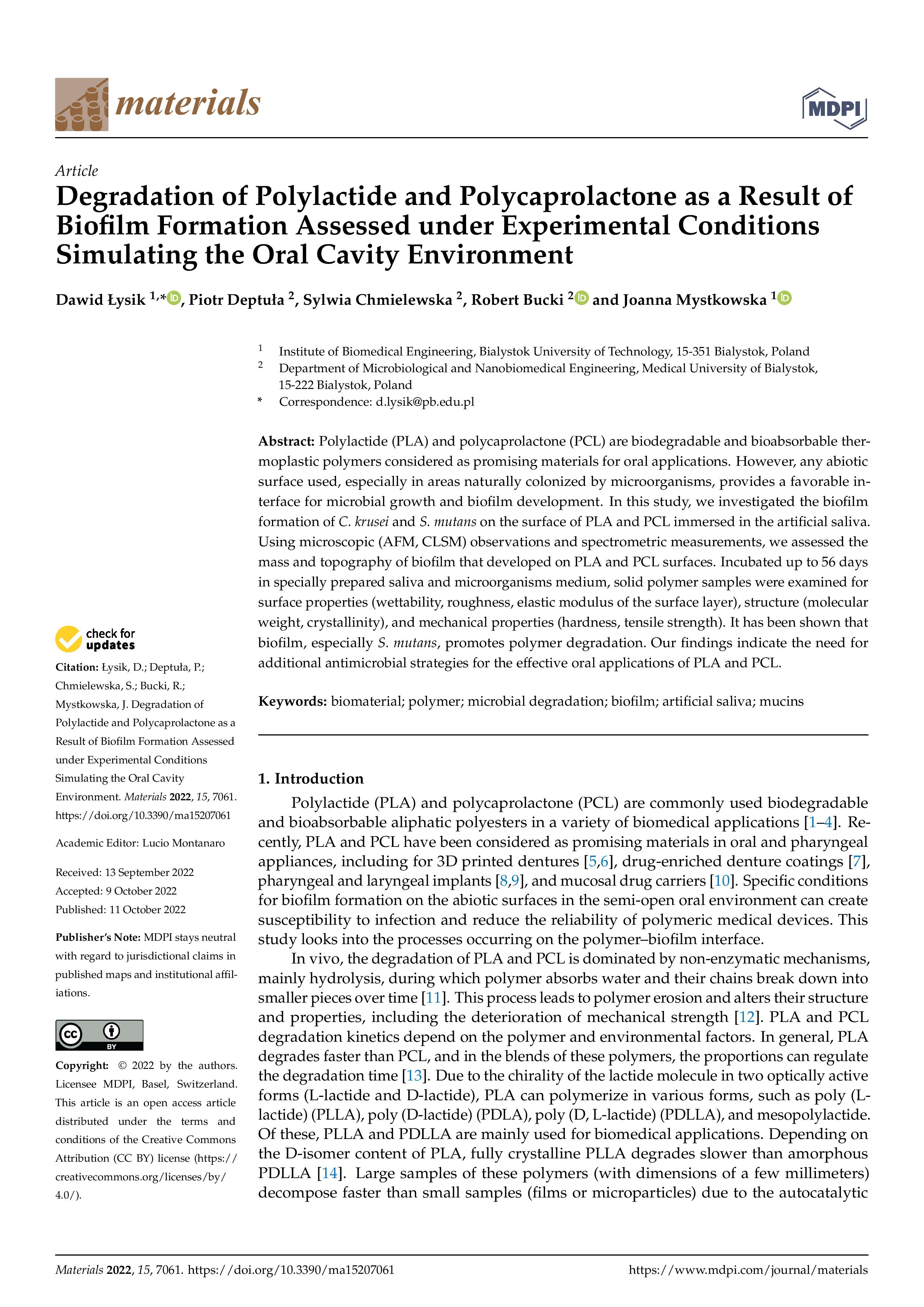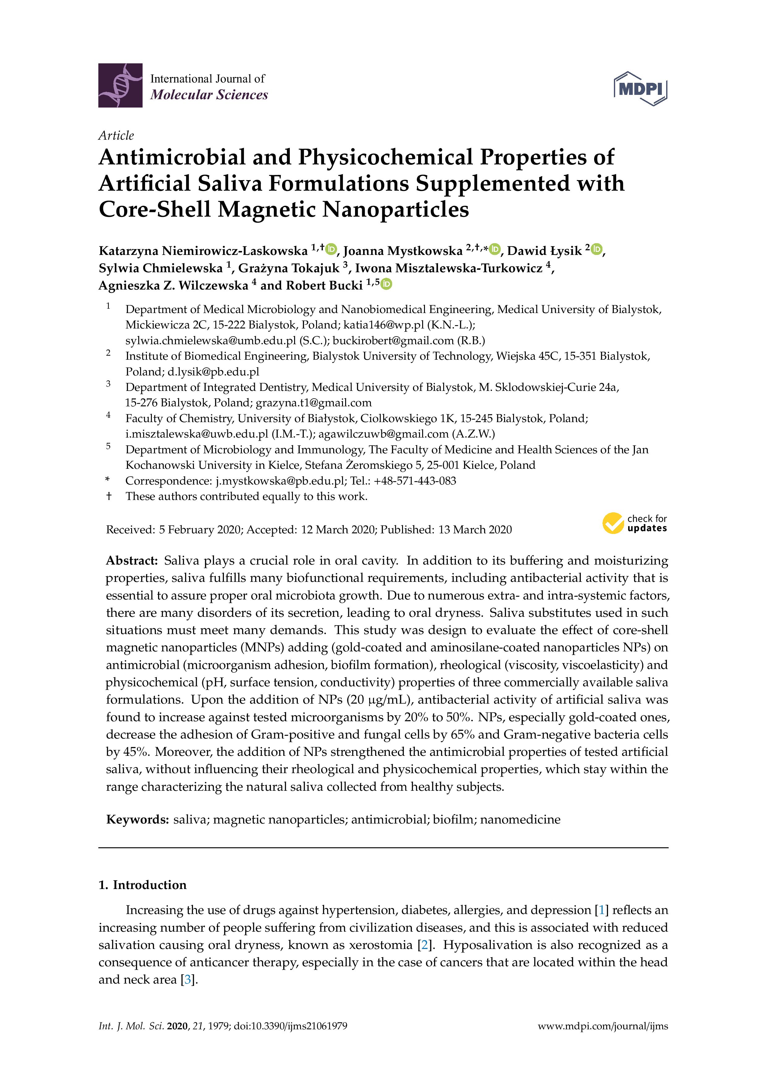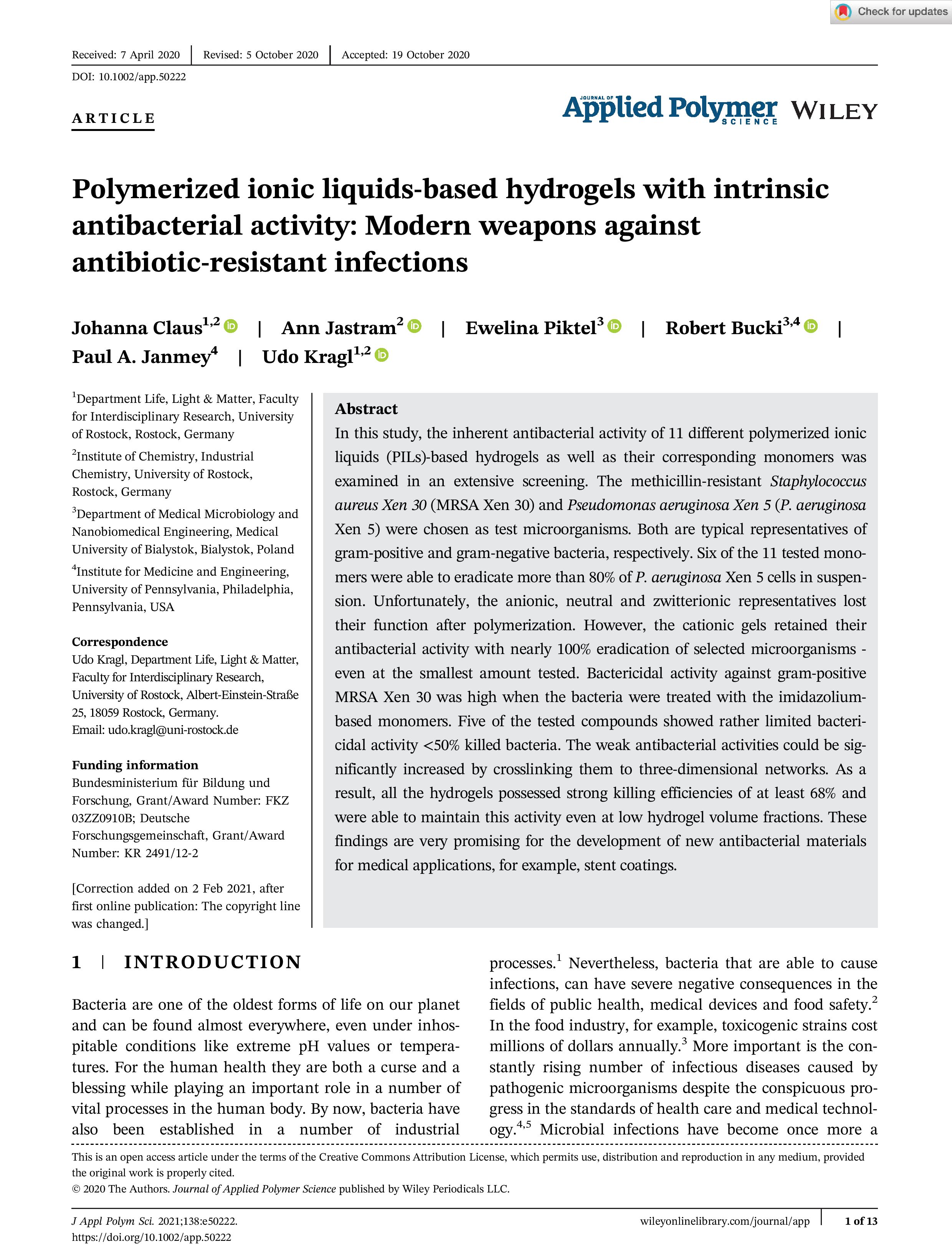 Robert Bucki, Katarzyna Niemirowicz, Urszula Wnorowska, Marzena Wątek, Fitzroy J. Byfield, Katrina Cruz, Marta Wróblewska, Paul A. Janmey. Polyelectrolyte-mediated increase of biofilm mass formation. BMC Microbiology; 2015 : 15, art. no. 117, 10 pp. IF=2.581