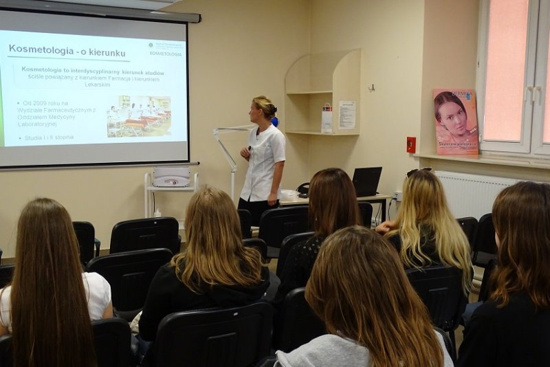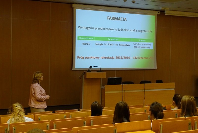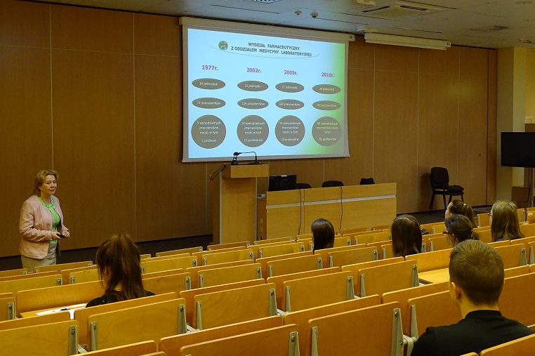 Podczas prezentacji Wydziału  przez prof. dr hab Elżbietę Skrzydlewską-Dziekana Wydziału Farmaceutycznego w Oddziałem Medycyny Laboratoryjnej uczniowie mogli zapoznać się kierunkami studiów prowadzonymi na Wydziale, zasadami rekrutacji, płaszczyznami  współpracy Wydziału ze Szkołami.