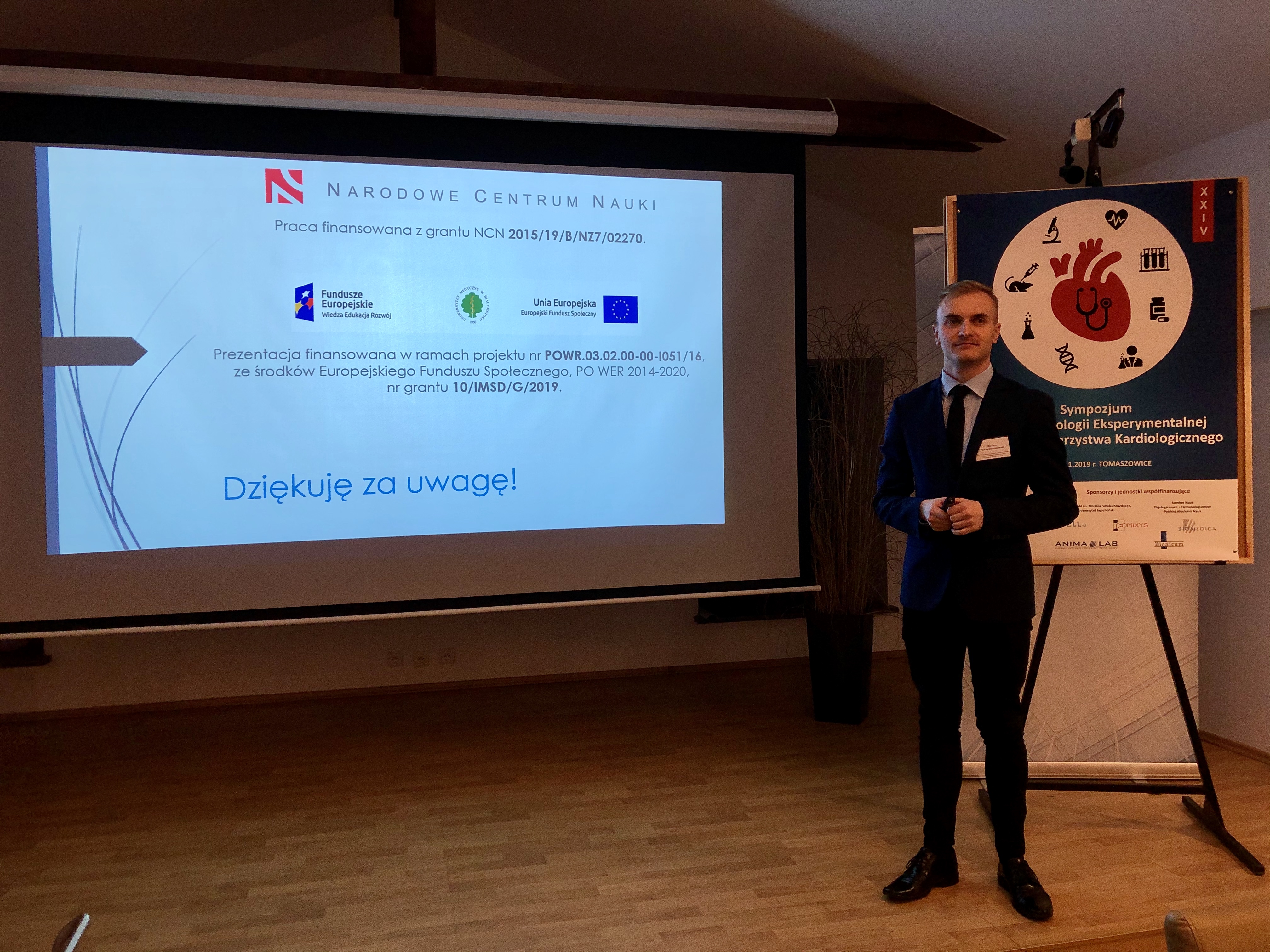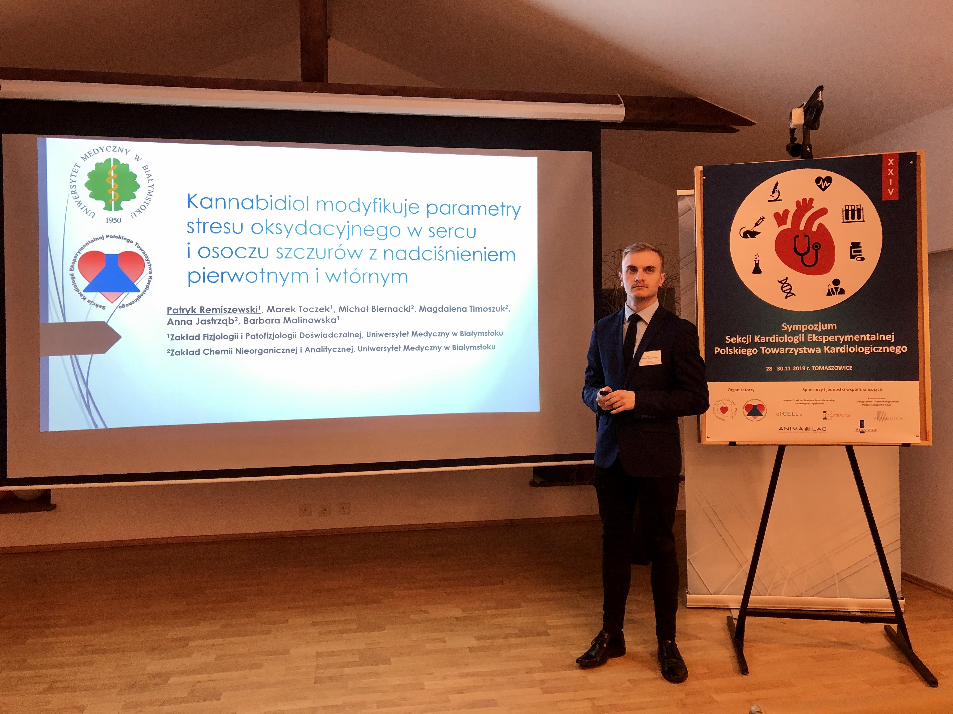 Pan Patryk Remiszewski, doktorant Międzynarodowych studiów doktoranckich w dziedzinie nauk medycznych i nauk farmaceutycznych w dniach 28-30.11.2019 r. brał czynny udział w XXIV Sympozjum Sekcji Kardiologii Eksperymentalnej Polskiego Towarzystwa Kardiologicznego w Tomaszowicach k/Krakowa. Sympozjum odbyło się pod patronatem Komitetu Nauk Fizjologicznych i Farmakologicznych PAN. W sympozjum wzięli udział przede wszystkim młodzi, ale także doświadczeni badacze z obszaru kardiologii, fizjologii, molekularnej biologii, biofizyki i biologii komórkowej. Pan P. Remiszewski przedstawił prezentację pt. "Kannabidiol modyfikuje parametry stresu oksydacyjnego w sercu i osoczu szczurów z nadciśnieniem pierwotnym i wtórnym".