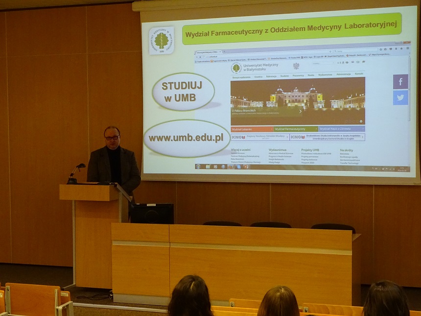 - W dniu 16 listopada br. w kolejnej edycji akcji "Studiuj w UMB" uczestniczyli uczniowie z klas pierwszych z I Liceum Ogólnokształcącego im. A. Mickiewicza w Białymstoku. Młodzież miala okazję uczestniczyć w spotkaniu z Prodziekanem Wydziału Farmaceutycznego ds. Rozwoju dr hab. Katarzyną Socha oraz przedstawicielami Studentów. Młodziez brała też udział w warsztatach prowadzonych przez poniższe Zakłady: