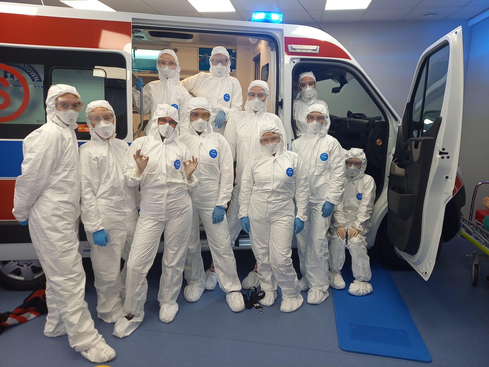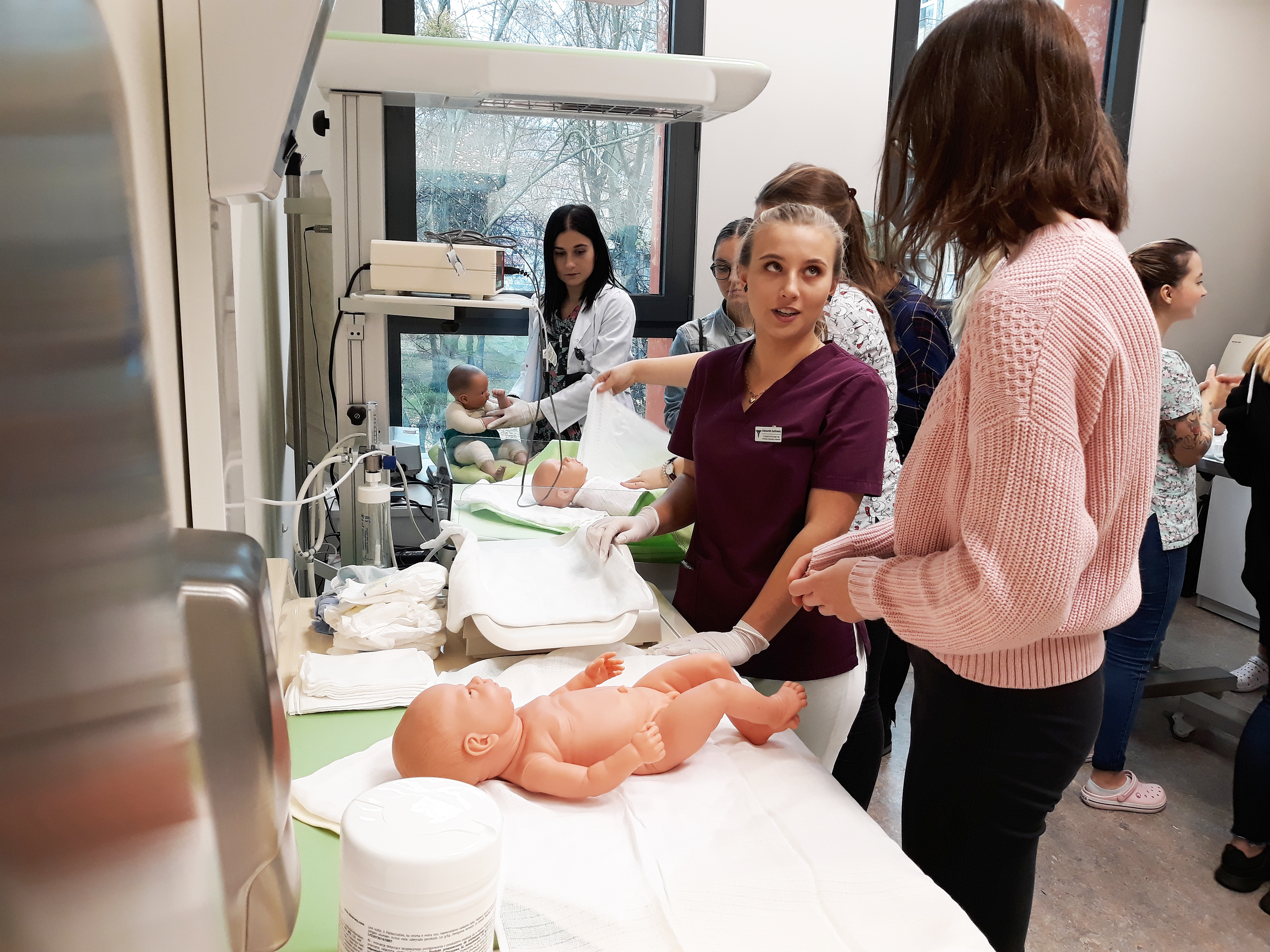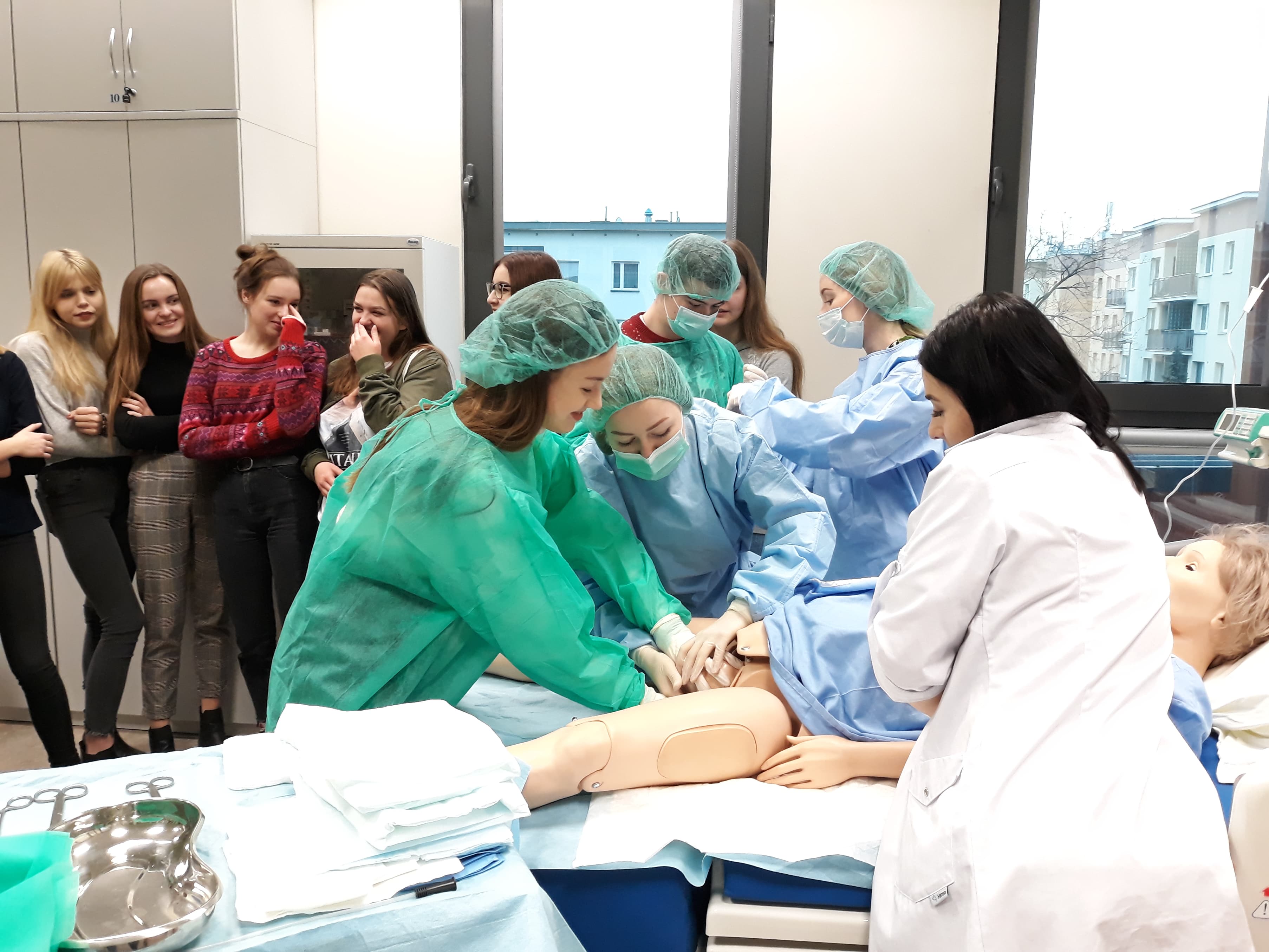 W dniu 13.12.2019r. w przedświątecznym klimacie, gościliśmy uczniów I Liceum Ogólnokształcącego z Białej Podlaskiej. Zaskoczyliśmy ich trwającym w toku porodem, w którym to, z niewielką pomocą studentek II i III roku położnictwa musieli wykazać się umiejętnym przyjęciem porodu. Następnie czekała na Nich sala noworodkowa, w której dzielni uczniowie uczyli się umiejętności prawidłowego przewijania noworodka, mogli także zobaczyć jak mierzy się i waży nowonarodzone dziecko, a także przyjrzeć się w jaki sposób wykonuje się zabieg Credégo. Na sam koniec przygody z położnictwem  na uczniów czekała sala ginekologiczna, w której mogli nauczyć się jak prawidłowo wykonać samobadanie piersi i jak wygląda oraz w jakim celu wykonuje się  badanie cytologiczne. W ostatniej sali uczniowie mogli także spróbować określić położenie i ustawienie płodu za pomocą chwytów Leopolda. Bogatsi o nową wiedzę uczniowie liceum zdawali się być bardzo zadowoleni i szczęśliwi. Mamy nadzieję, że z niektórymi z Nich spotkamy się niebawem w murach Naszej uczelni.