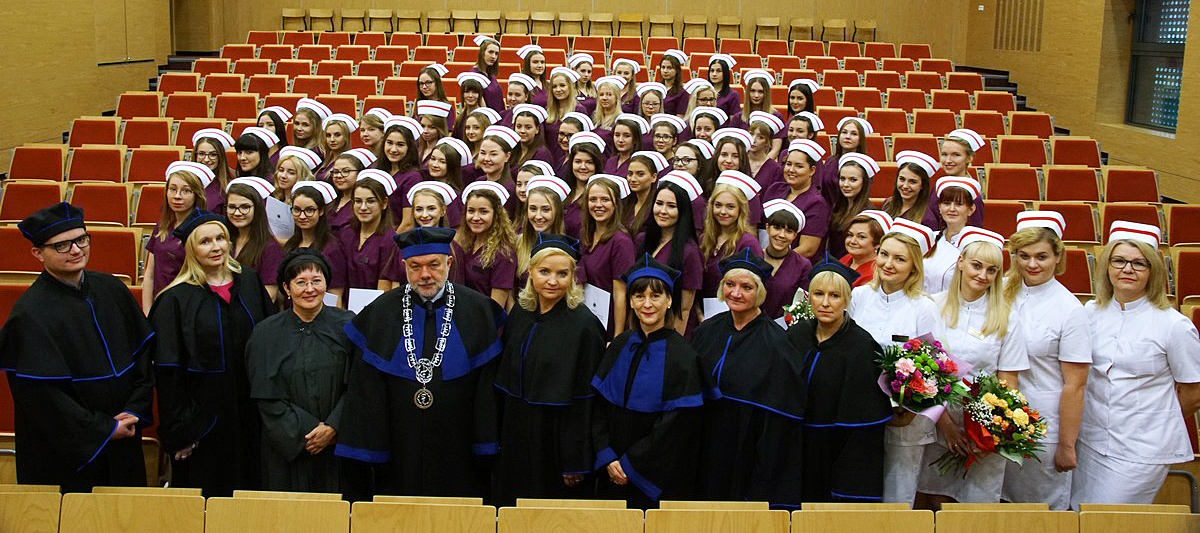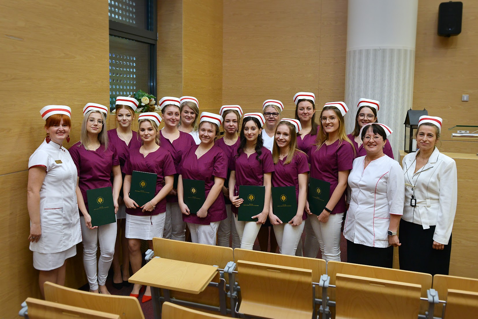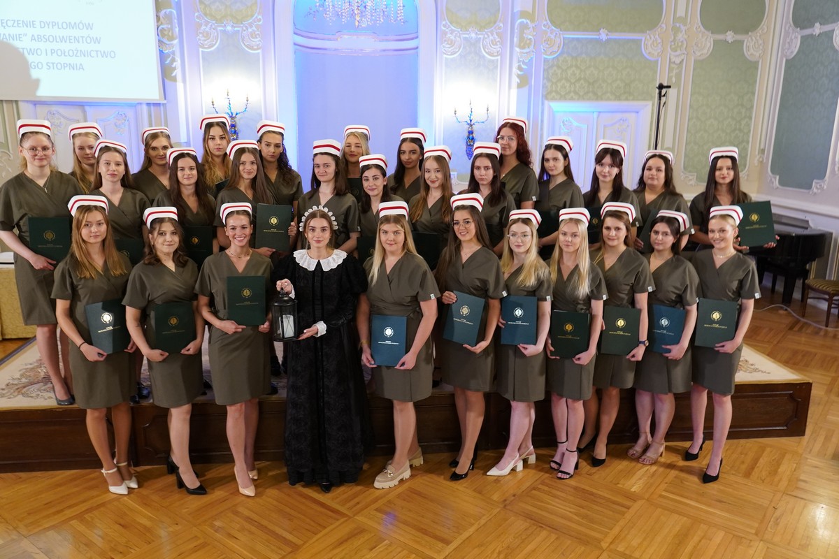 Serdecznie gratulujemy absolwentkom studiów kierunku Położnictwo I i II stopnia, otrzymały  dyplomy ukończenia studiów. Świeżo upieczone położne zostały uhonorowane białymi czepkami z czerwonym paskiem symbolizującym zawód położnej.