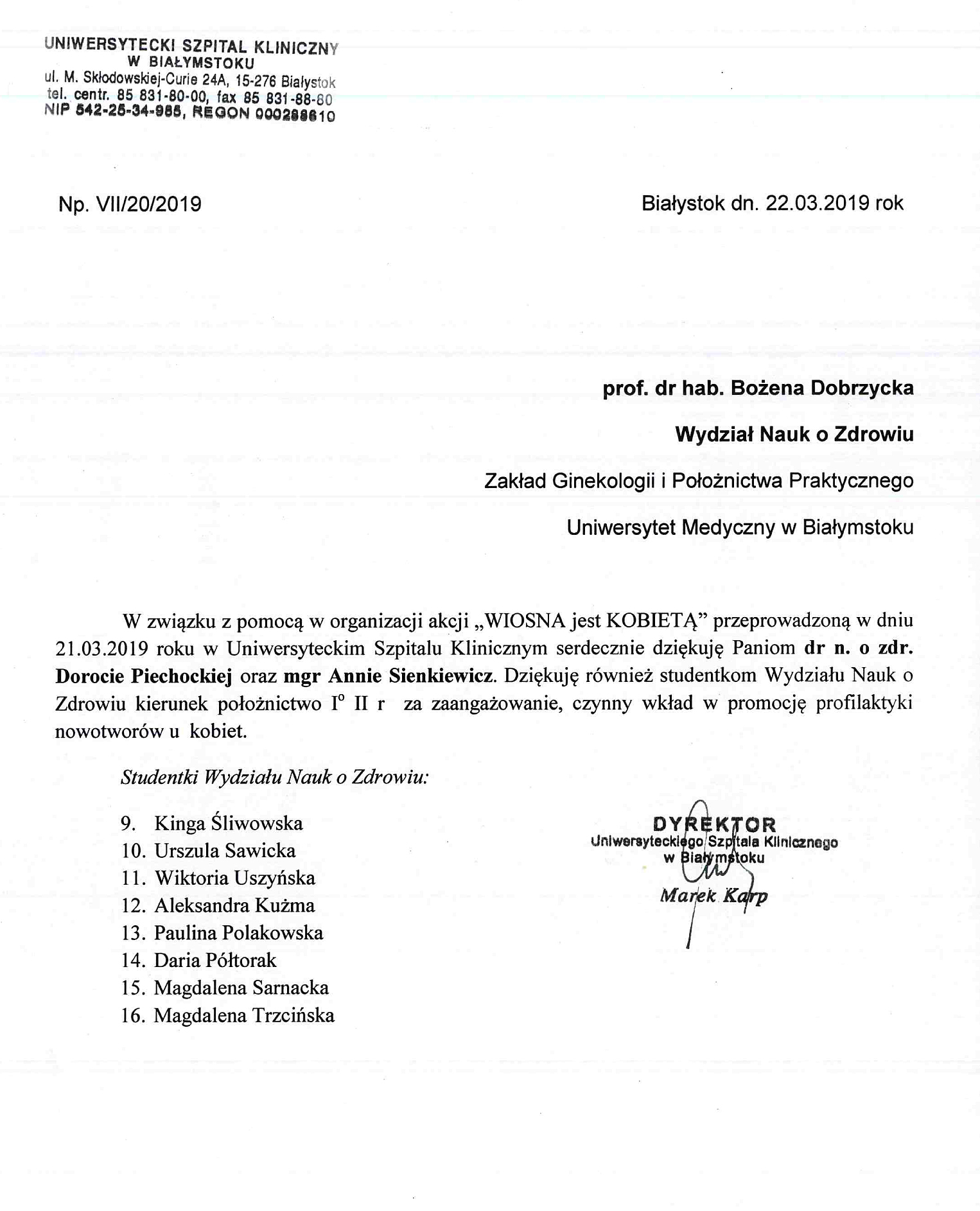 W pierwszy dzień wiosny Pododdział Ginekologii Onkologicznej i Chemioterapii USK w Białymstoku(który od tygodnia nosi nazwę Uniwersyteckie Centrum Onkologiczne) dla pań przygotował akcję profilaktyczną. Można było zrobić cytologię, badania piersi (a w razie potrzeby od razu USG), były porady dietetyczne (Magda Radzi), studentki położnictwa i pielęgniarstwa uczyły badać piersi (Wydział Nauk o Zdrowiu UMB), studentki kosmetologii pokazywały jak zadbać o skórę w chorobach onkologicznych (Wyższa Szkoła Medyczna w Białymstoku). Oczywiście we wszystkim udział wzięło Stowarzyszenie Eurydyki w Białymstoku, które wspiera panie po zabiegach onkologicznych.