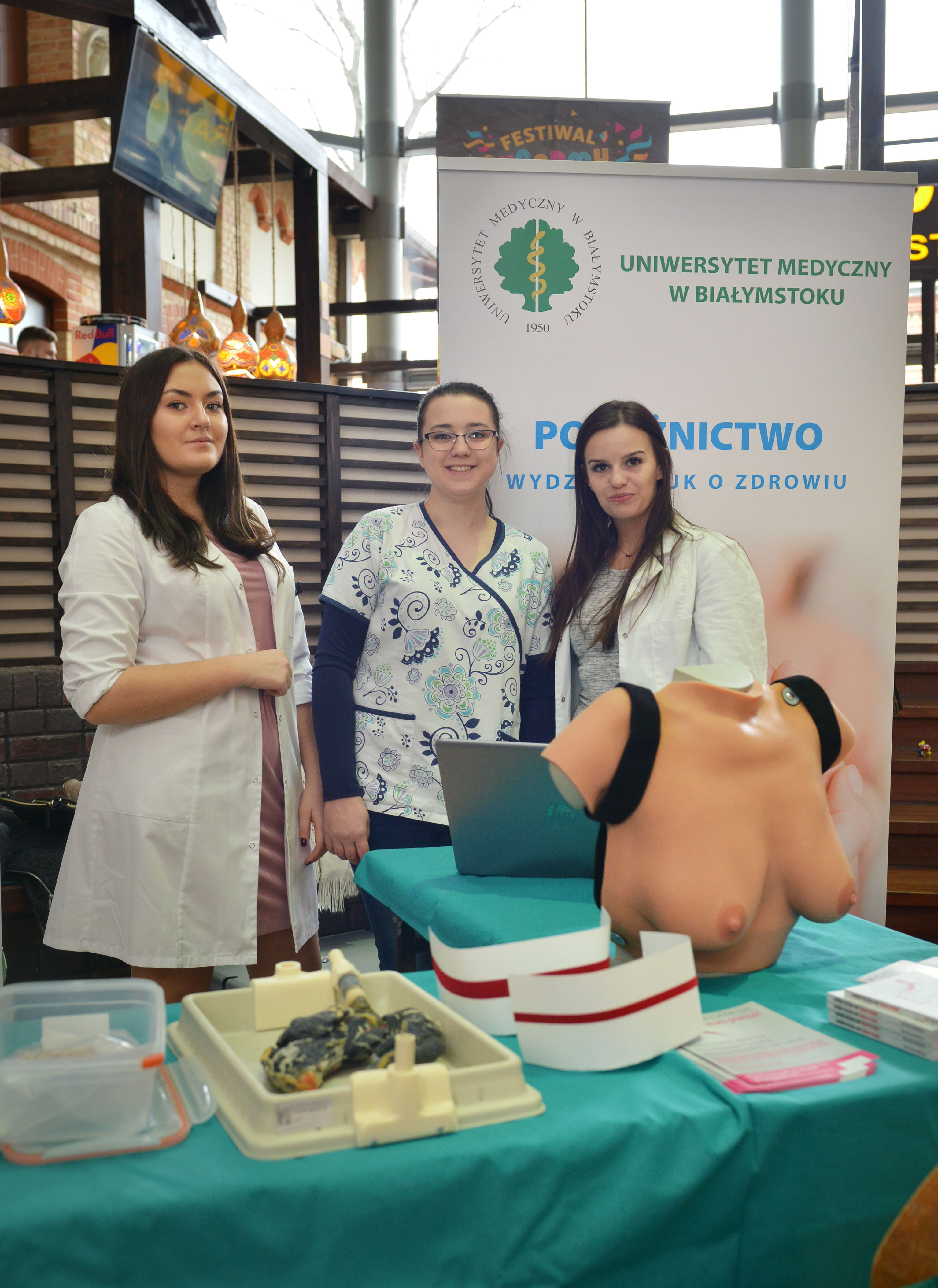 Położnictwo było obecne na dziedzińcu Pałacu Branickich i w Centrum Symulacji Medycznych Warsztaty w warunkach sali porodowej przybliżały i uczyły opieki nad rodzącą i noworodkiem. Pokazywały jak wiele wiedzy, kwalifikacji,  a także pracy trzeba podjąć by stać się profesjonalistą z zakresu położnictwa.