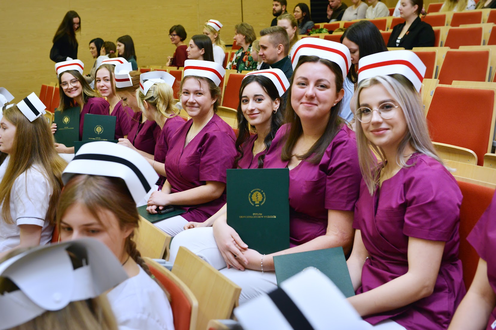 We wtorkowe południe (21 października 2025r.), w Aula Magna Pałacu Branickich, odbyło się uroczyste dyplomatorium studentów I stopnia studiów na kierunku pielęgniarstwo i położnictwo, połączone z czepkowaniem. 128 nowych pielęgniarek i pielęgniarzy oraz 31 położnych odebrało swoje dokumenty poświadczające nabyte kwalifikacje.