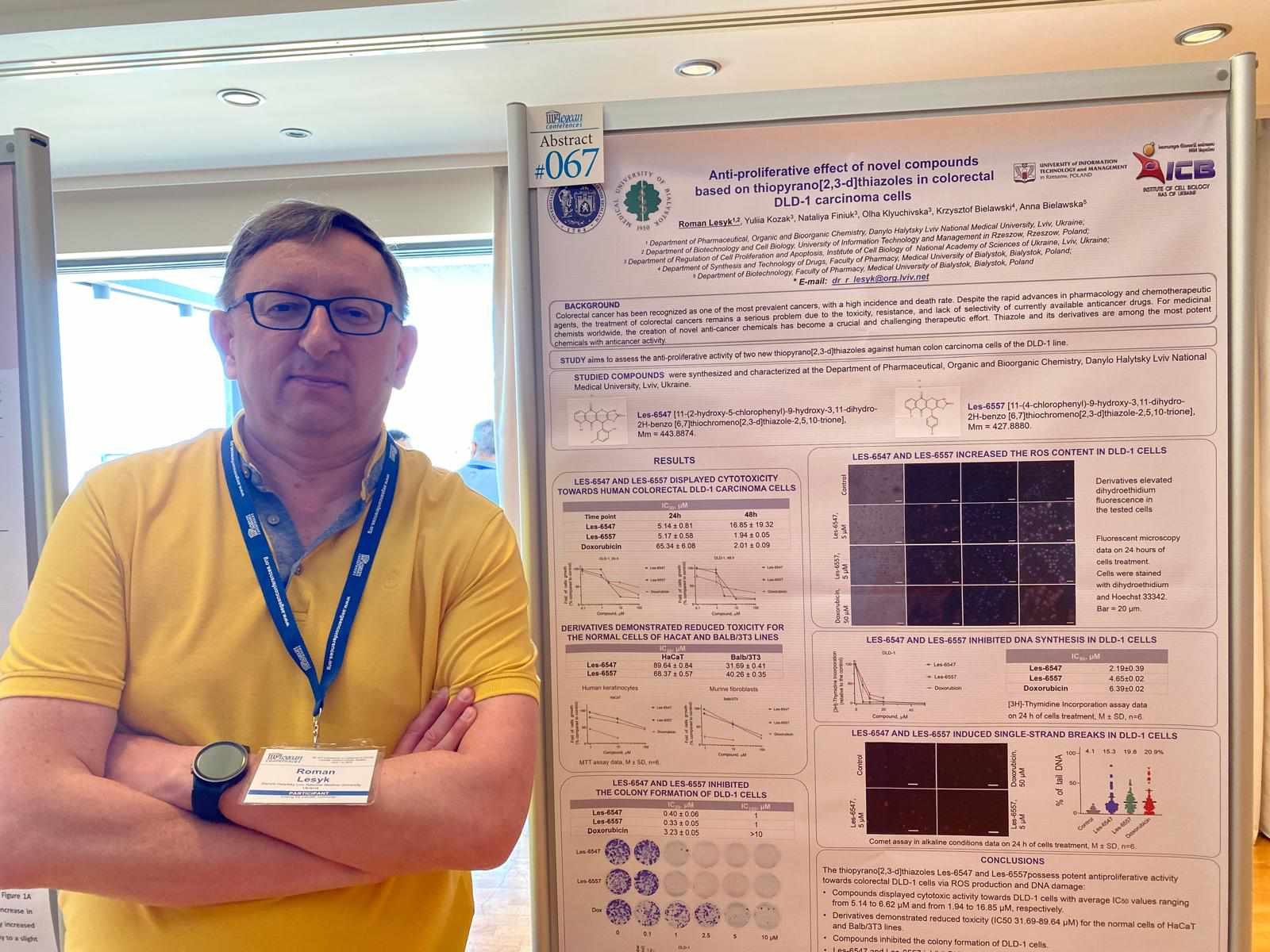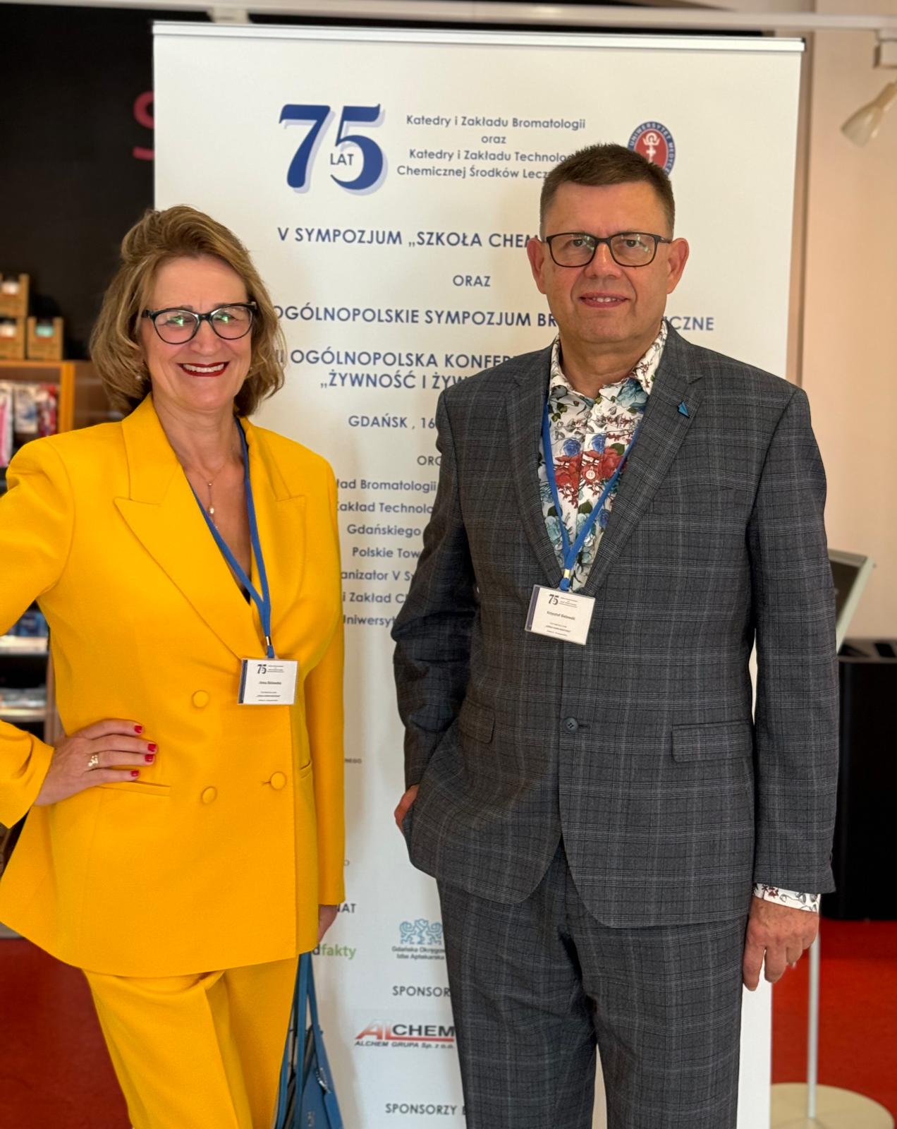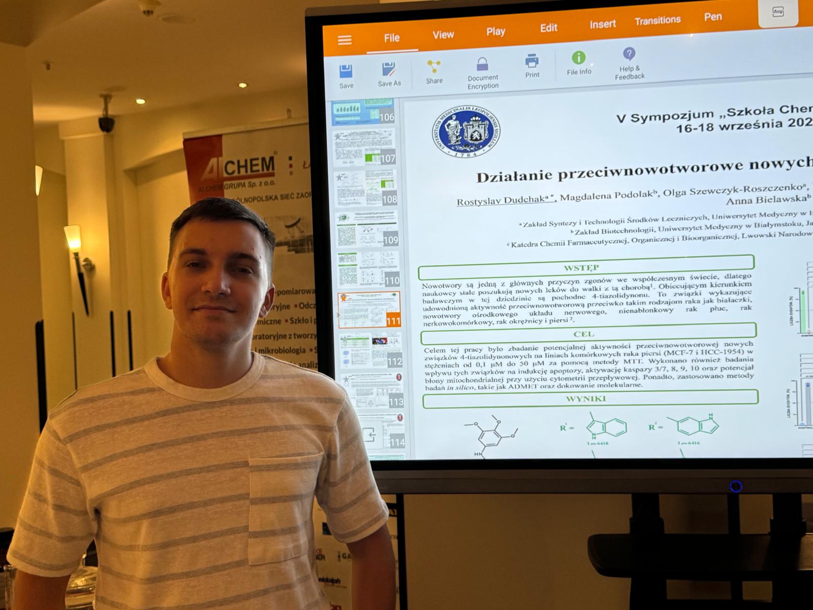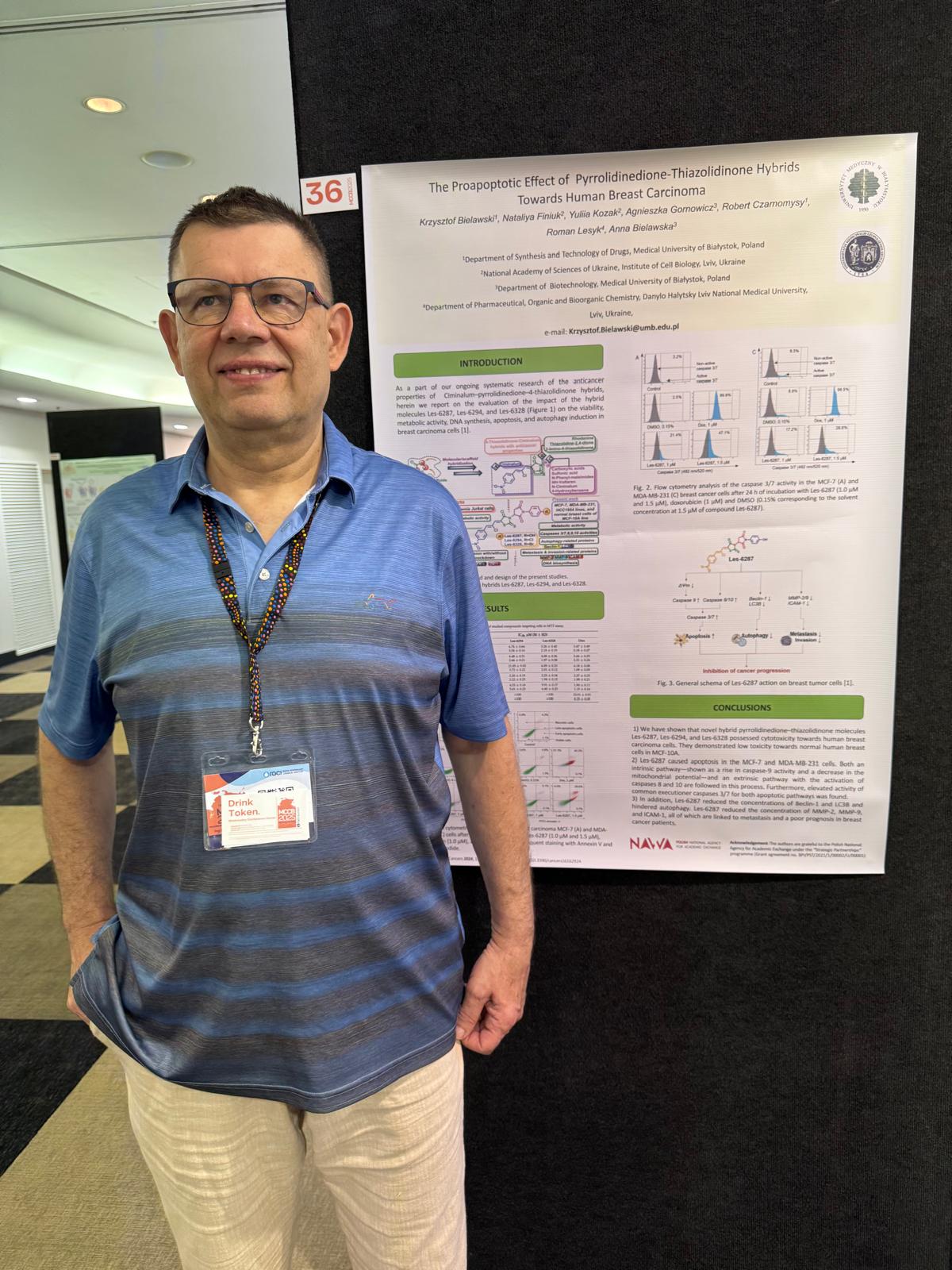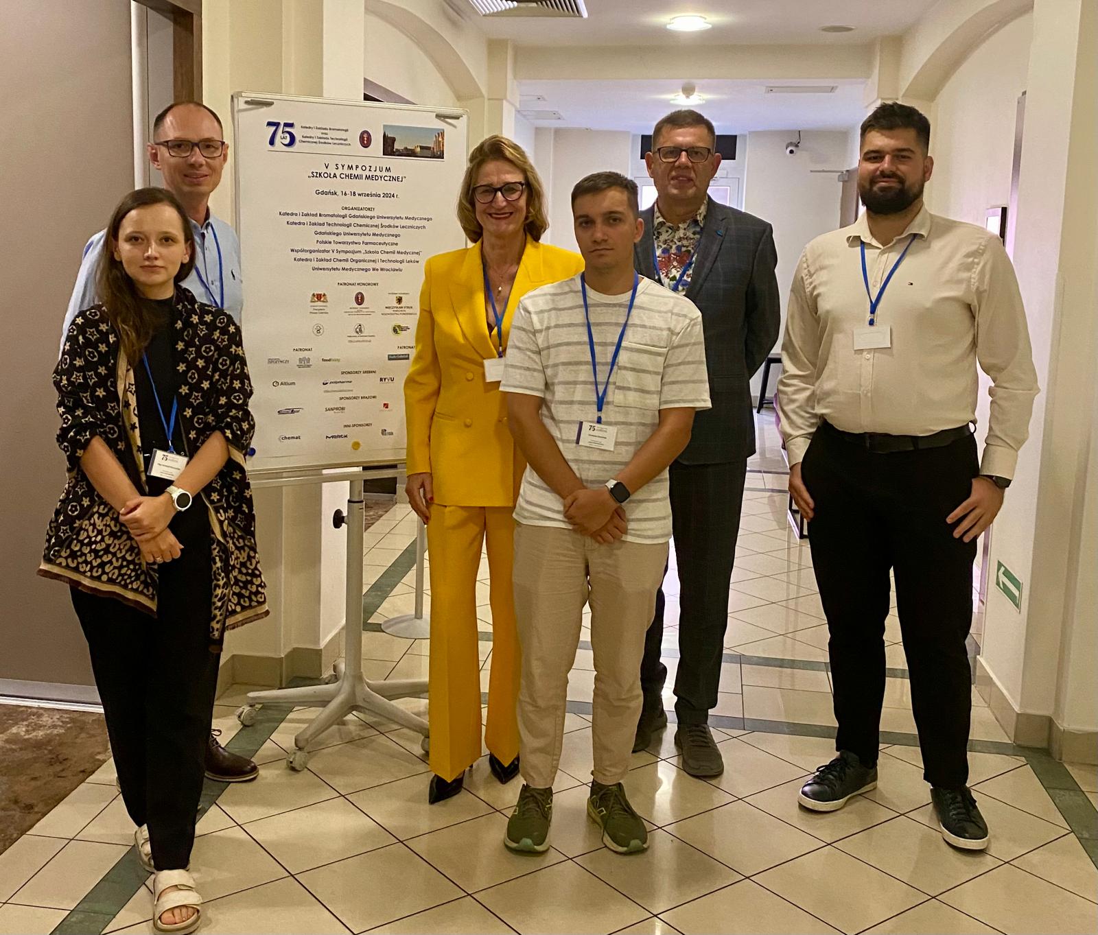 W dniach 16-18 września nasi pracownicy oraz doktoranci uczestniczyli w V edycji sympozjum Szkoła Chemii Medycznej w Gdańsku. Nasi reprezentanci przedstawili swoje plakaty naukowe, dzieląc się wynikami najnowszych badań. Wyróżnienie za najlepszy plakat zdobył doktorant II roku, Rostyslav Dudchak, zajmując I miejsce w sesji plakatowej za pracę pt. „Działanie przeciwnowotworowe nowych pochodnych 4-tiazolidynonu”.