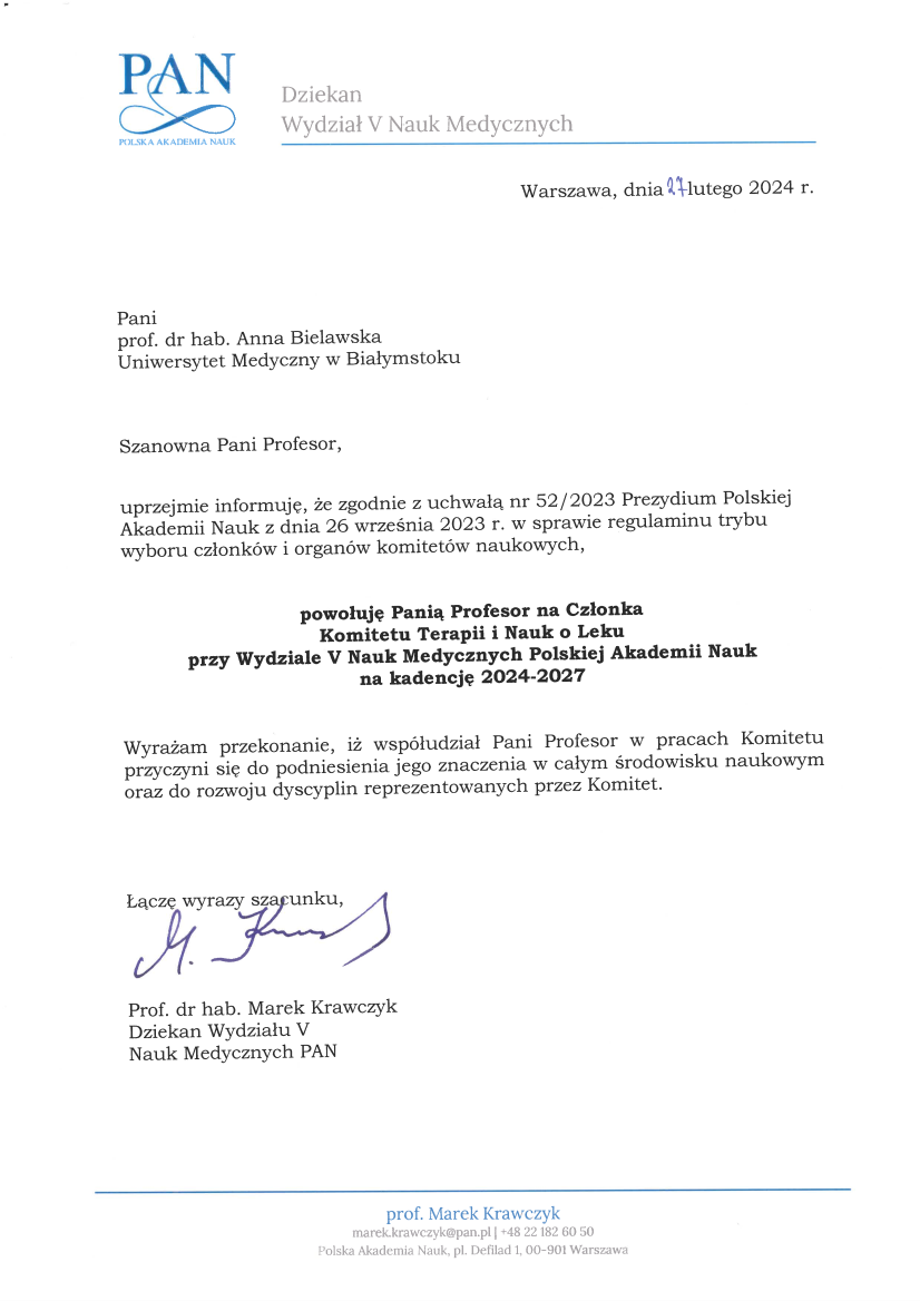 Dnia 27 lutego 2024 roku, zgodnie z uchwałą nr 52/2023 Prezydium Polskiej Akademii Nauk Pani Prof dr hab. Anna Bielawska została oficjalnie powołana na członka Komitetu Terapii i Nauk o Leku przy Wydziale V Nauk Medycznych Polskiej Akademii Nauk na kadencję 2024-2027.