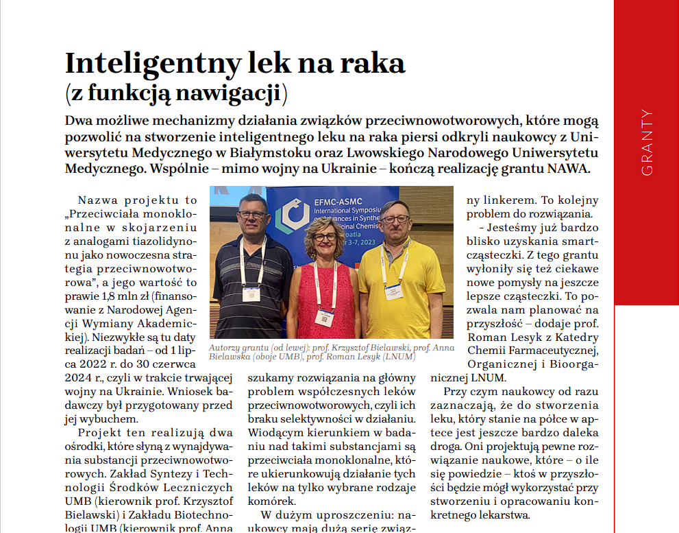 W 2024 roku profesorowie Anna i Krzysztof Bielawscy (UMB) wraz z prof. Lesykiem zakończyli realizację grantu z NAWA, dzięki któremu udało się zidentyfikować mechanizmy działania związków przeciwnowotworowych, które mogą pozwolić na stworzenie inteligentnego leku na raka piersi. W dużym uproszczeniu: naukowcy mają wybrane związki chemiczne, które są aktywne w stosunku do komórek nowotworowych, a są nieszkodliwe dla zdrowych komórek. Dodatkowo łączą je z przeciwciałami monoklonalnymi, które potrafią się poruszać po ciele człowieka jakby miały nawigację GPS. Trafiają tylko do konkretnych obszarów (np. miejsc z nowotworem).