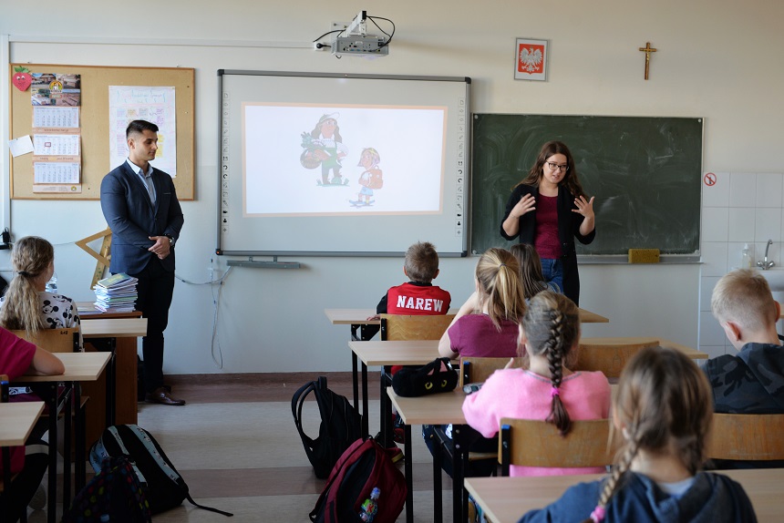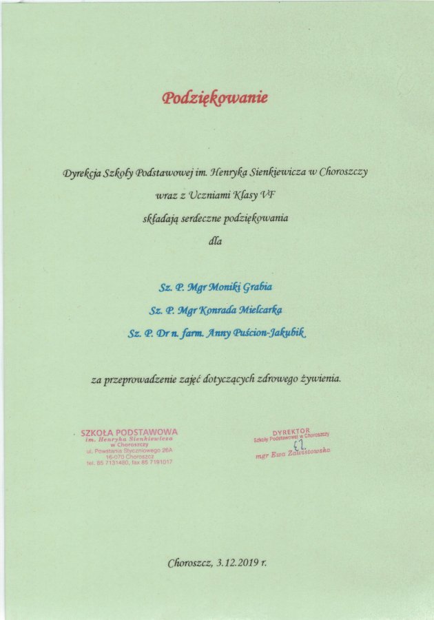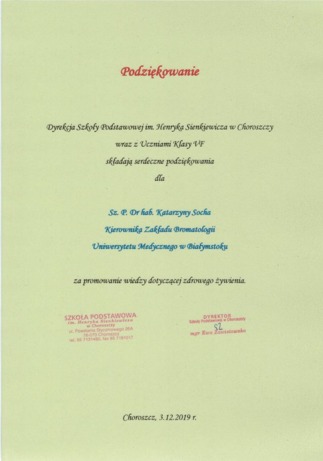 Dnia 3 grudnia 2019 r. Pracownicy i Doktoranci z Zakładu Bromatologii (mgr Monika Grabia, mgr Konrad Mielcarek, dr n. farm. Anna Puścion-Jakubik), na zaproszenie Wychowawczyni i Dyrekcji, odwiedzili klasę VF Szkoły Podstawowej im. Henryka Sienkiewicza w Choroszczy. Uczniowie klasy sportowej z ogromnym zainteresowaniem wysłuchali prezentacji dotyczącej zasad zdrowego żywienia, brali aktywny udział w zadaniach mających na celu utrwalenie wiedzy oraz wzięli udział w badaniu składu ciała. Zajęcia te uatrakcyjniły program dydaktyczny oraz pozwolą w przyszłości podejmować właściwe decyzje dotyczące kupowania i spożywania dobrej jakości produktów.