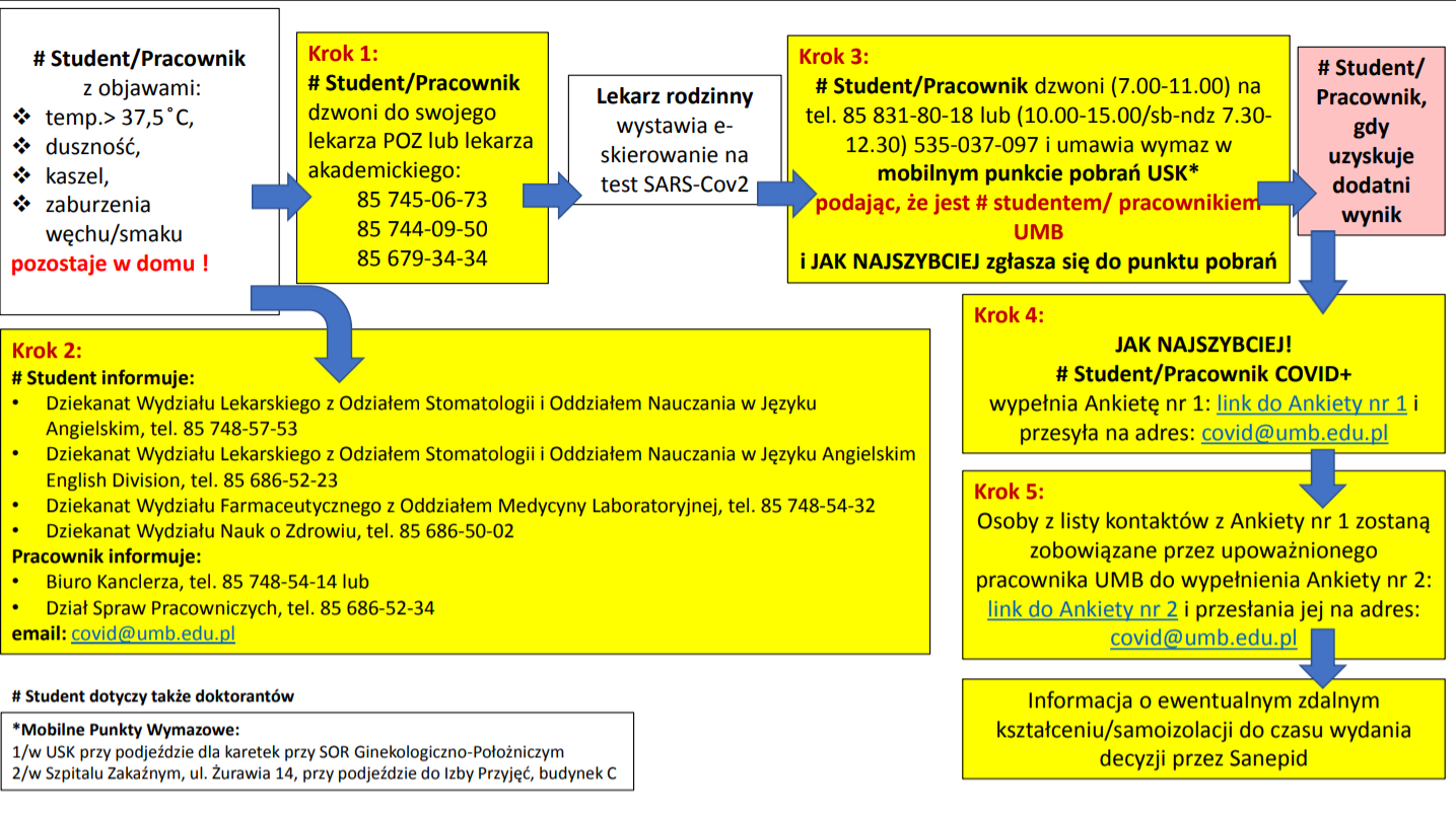 Schemat Postępowania w przypadku wystąpienia objaów zakażenia Sars-CoV2, potwierdzenia zakażenia i kontaktu z osobą zakażoną