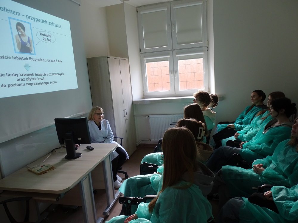 - w Zakładzie Farmakodynamiki i Zakładzie Farmakoterapii Monitorowanej zapoznawali się z "Rolą farmaceuty w terapii pacjenta" oraz "Jak skutecznie leczyć, aby wyleczyć, czyli jak działają leki." Uczniów przywitał oraz oprowadził Pan prof dr hab. Dariusz Pawlak. Dalszą część zajęć przeprowadziły mgr Aleksandra Frąckiewicz i mgr Justyna Świętoń, doktorantki w Zakładzie Farmakodynamiki.