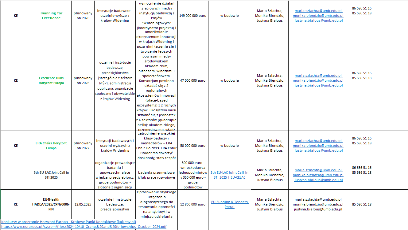 | ERA Chairs Horizon Europe | planowany na 2027 | EU Funding & Tenders Portal | Justyna Białous tel. 85 686 51 18