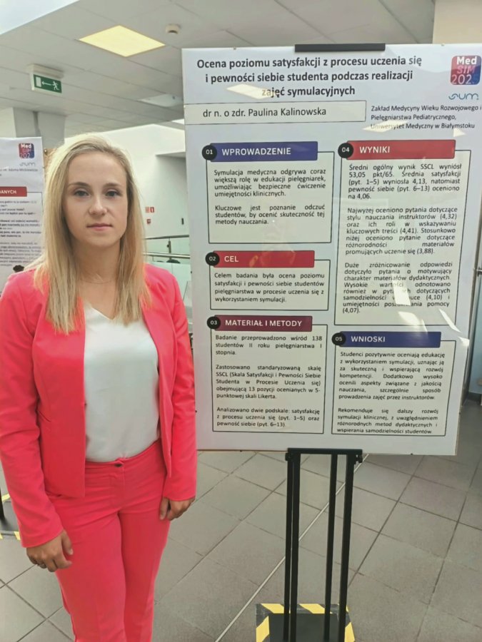 - Paulina Kalinowska zaprezentowała temat: Ocena poziomu satysfakcji z procesu uczenia się i pewności siebie studenta podczas realizacji zajęć symulacyjnych.