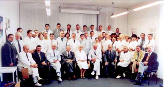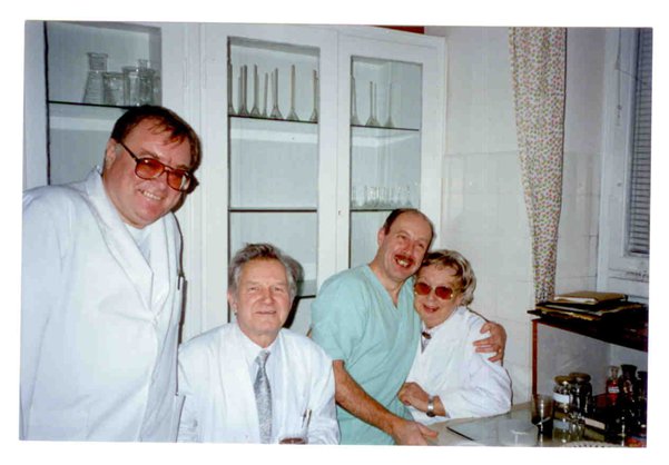 ( 6 a) Wszystkie dobre pomysły naukowe powstawały podczas spotkań w pracowniach Kliniki ( od lewej dr med. P. Knapp, dr med. J. Goszczyński – wieloletni dyrektor szpitala, dr med. J. Poznański – ordynator oddz. ginekologii septycznej, prof. W. Kazanowska – Kierownik Zakładu Profilaktyki Chorób Nowotworowych Narządu Rodnego IMiDz 1996 r.