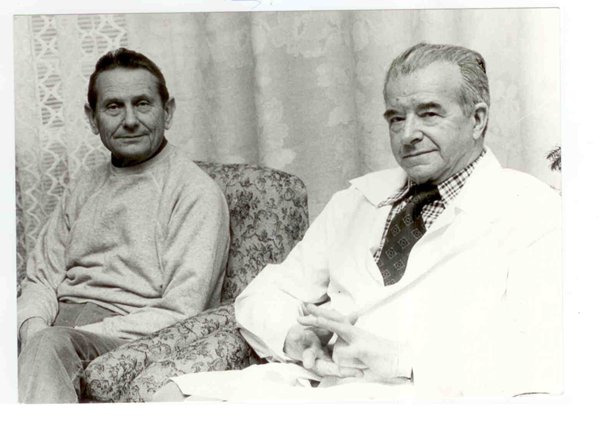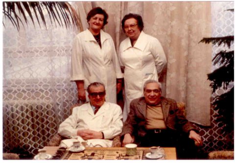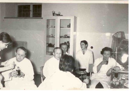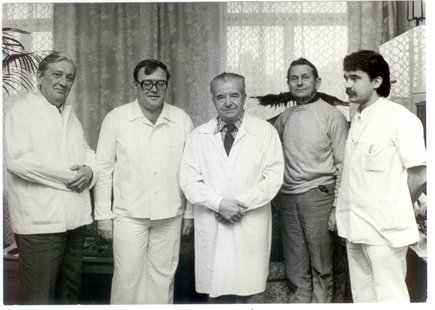 ( 4a ) Młodzi pracownicy mieli zawsze możliwość kontaktu ze swoimi kierownikami i nauczycielami – Prof. S. Soszka w środku, Prof. A. Krawczuk pierwszy z lewej, Prof. J. Musiatowicz z prawej, lek. med. P. Knapp drugi z lewej, lek. med. K. Olszewski pierwszy z prawej 1980 .
