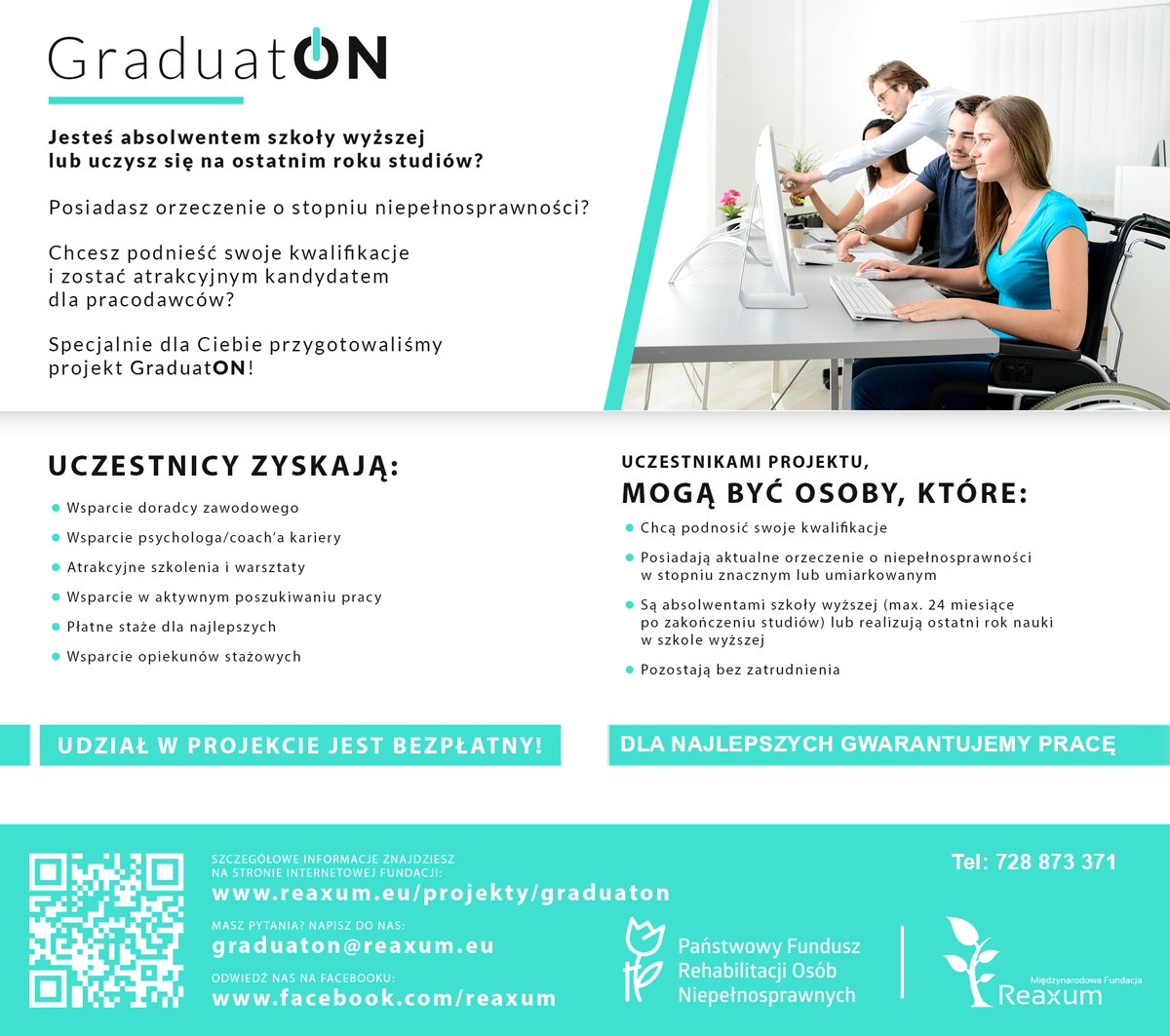 chciałabym zachęcić studentów ostatniego roku studiów oraz absolwentów (do 24 miesięcy od ukończenia studiów) Państwa Uczelni, posiadających orzeczenie o niepełnosprawności w stopniu znacznym lub umiarkowanym, do udziału w projekcie realizowanym ze środków Państwowego Funduszu Rehabilitacji Osób Niepełnosprawnych pn. "GraduatON".