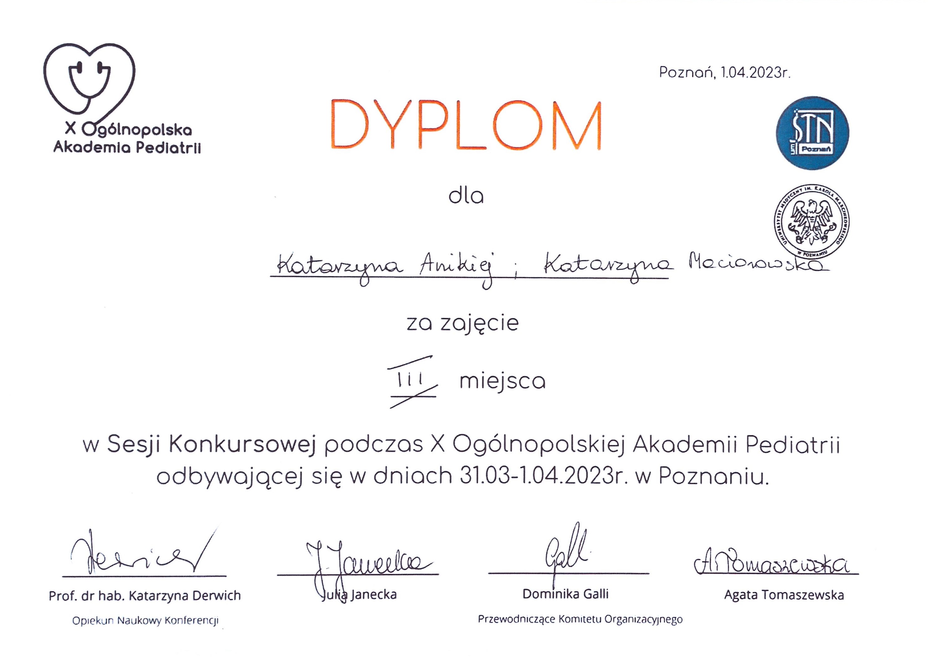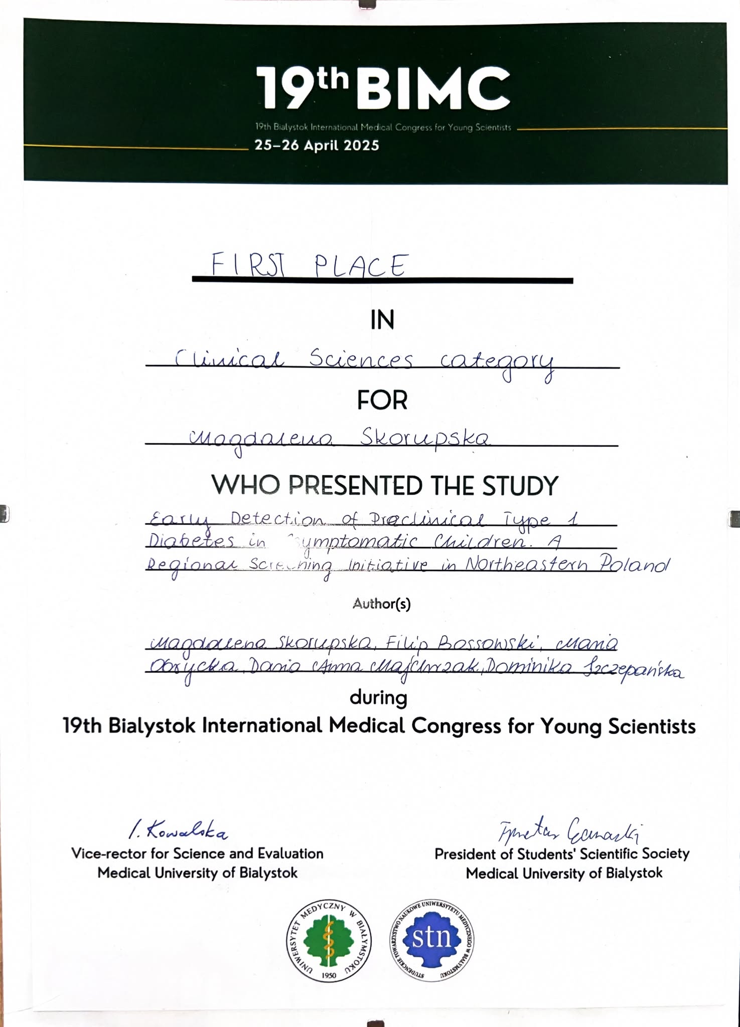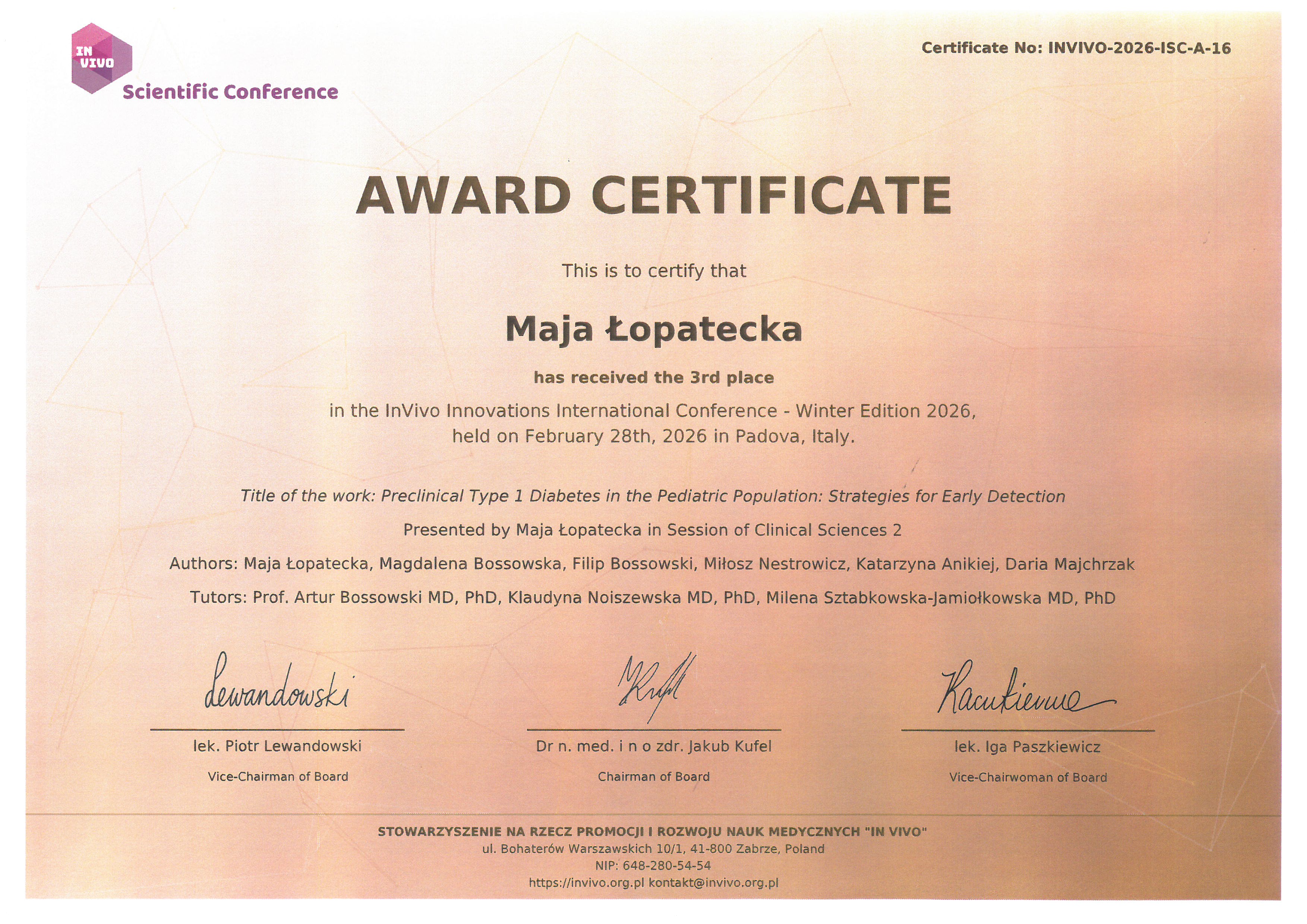 - Clinical Sciences III — Special Distinction - Filip Bossowski "Evaluation of miR-21-5p and miR-26b-5p as Emerging Biomarkers in Pediatric Cardiology "