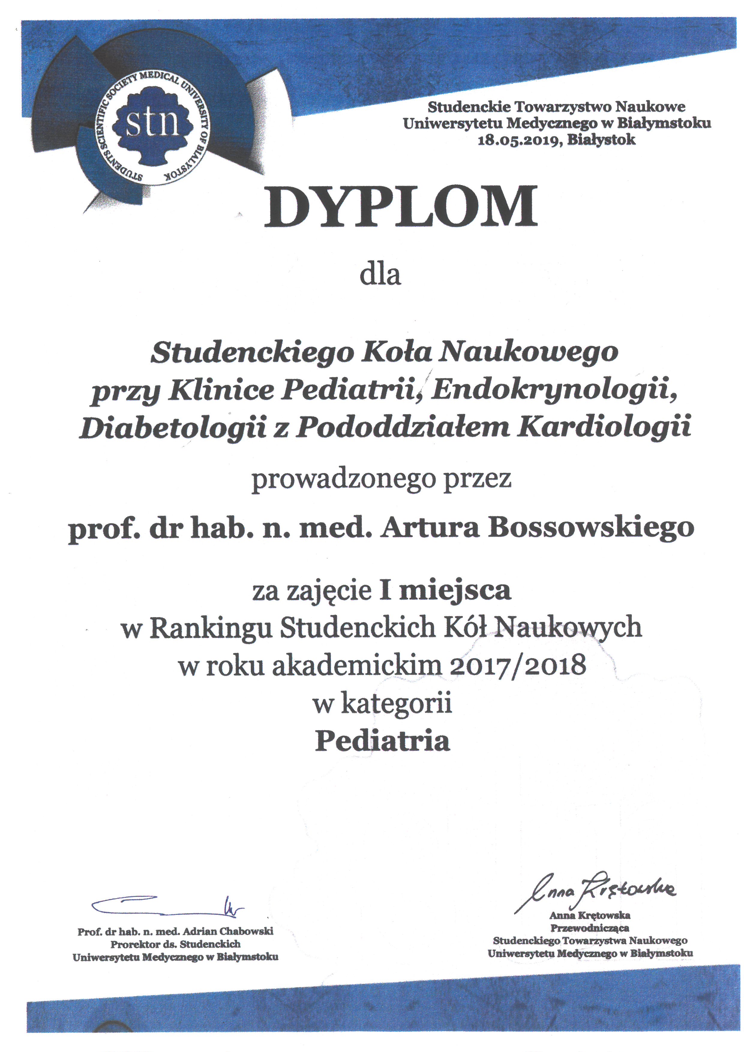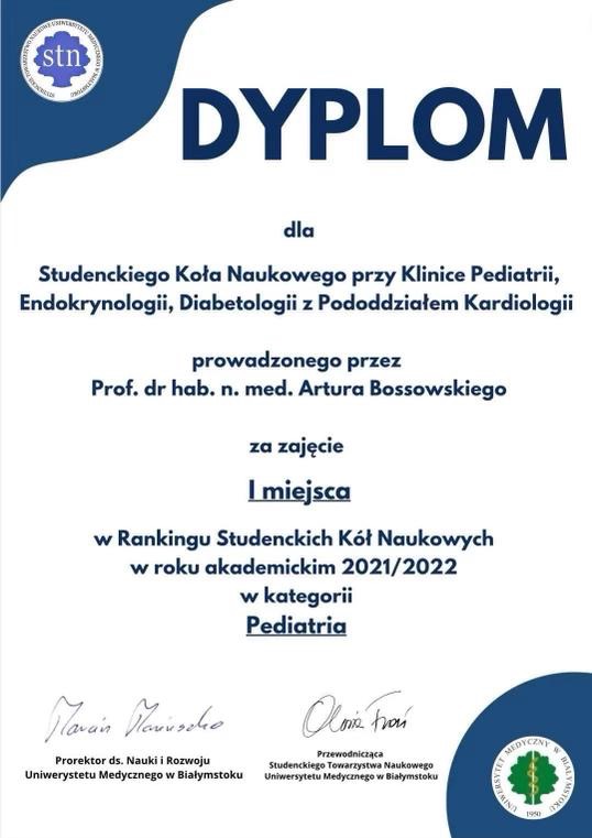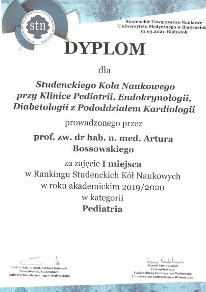 - Prof. zw. dr hab. n. med. Artur Tadeusz Bossowski – Kierownik Kliniki Pediatrii, Endokrynologii, Diabetologii z Pododdziałem Kardiologii UDSK im. L. Zamenhofa w Białymstoku