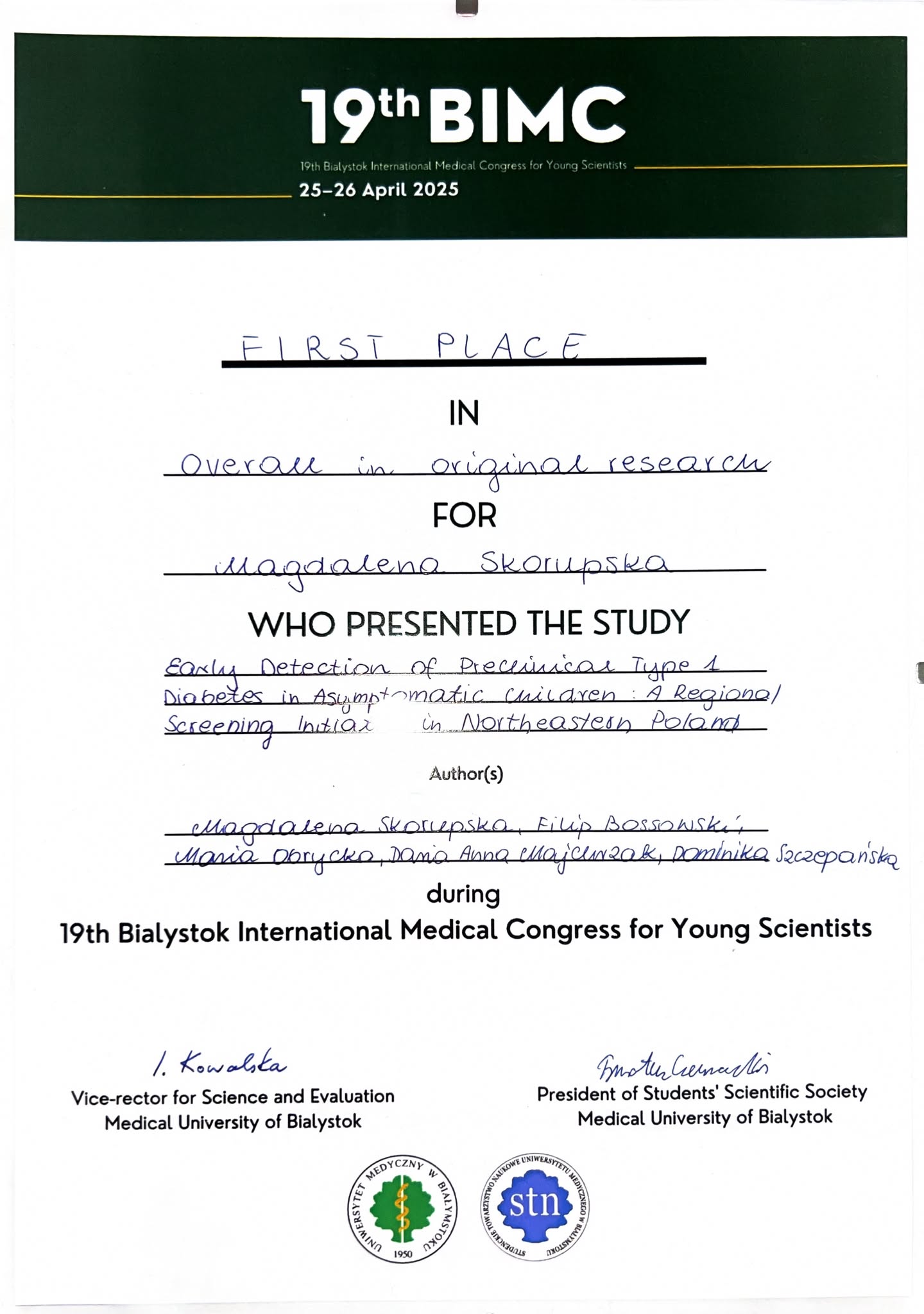 - Orginal Overall Award- Magdalena Bossowska ,,Early Detection of Preclinical Type 1 Diabetes in Asymptomatic Children: A Regional Screening Initiative in Northeastern Poland"