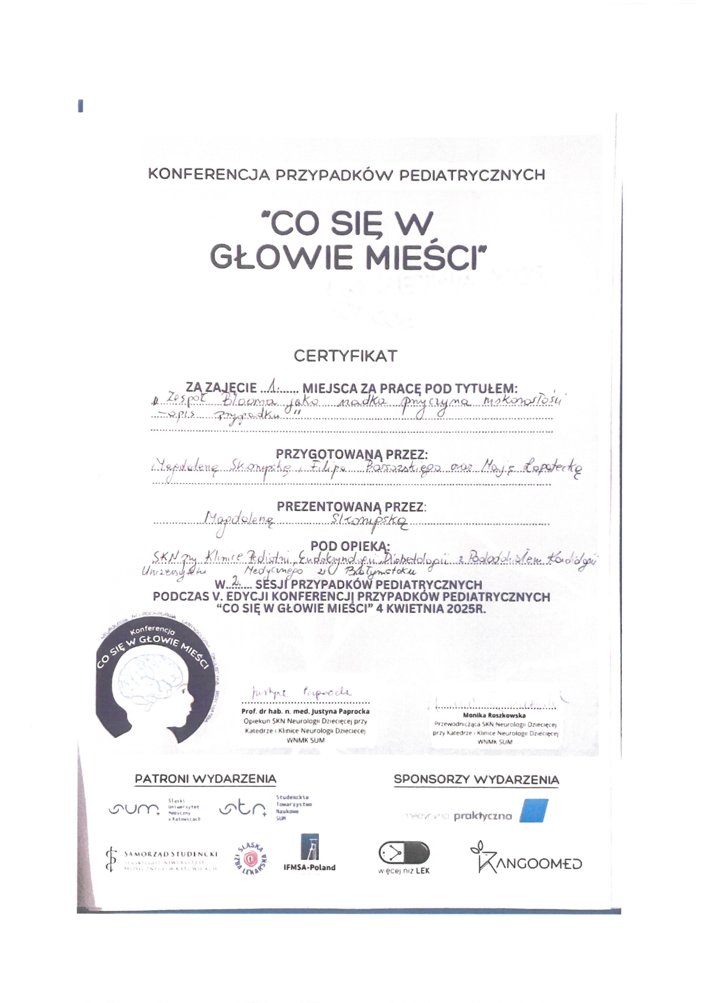 - Pierwsze miejsce- Magdalena Bossowska Zespół Blooma jako rzadka przyczyna niskorosłości - opis przypadku