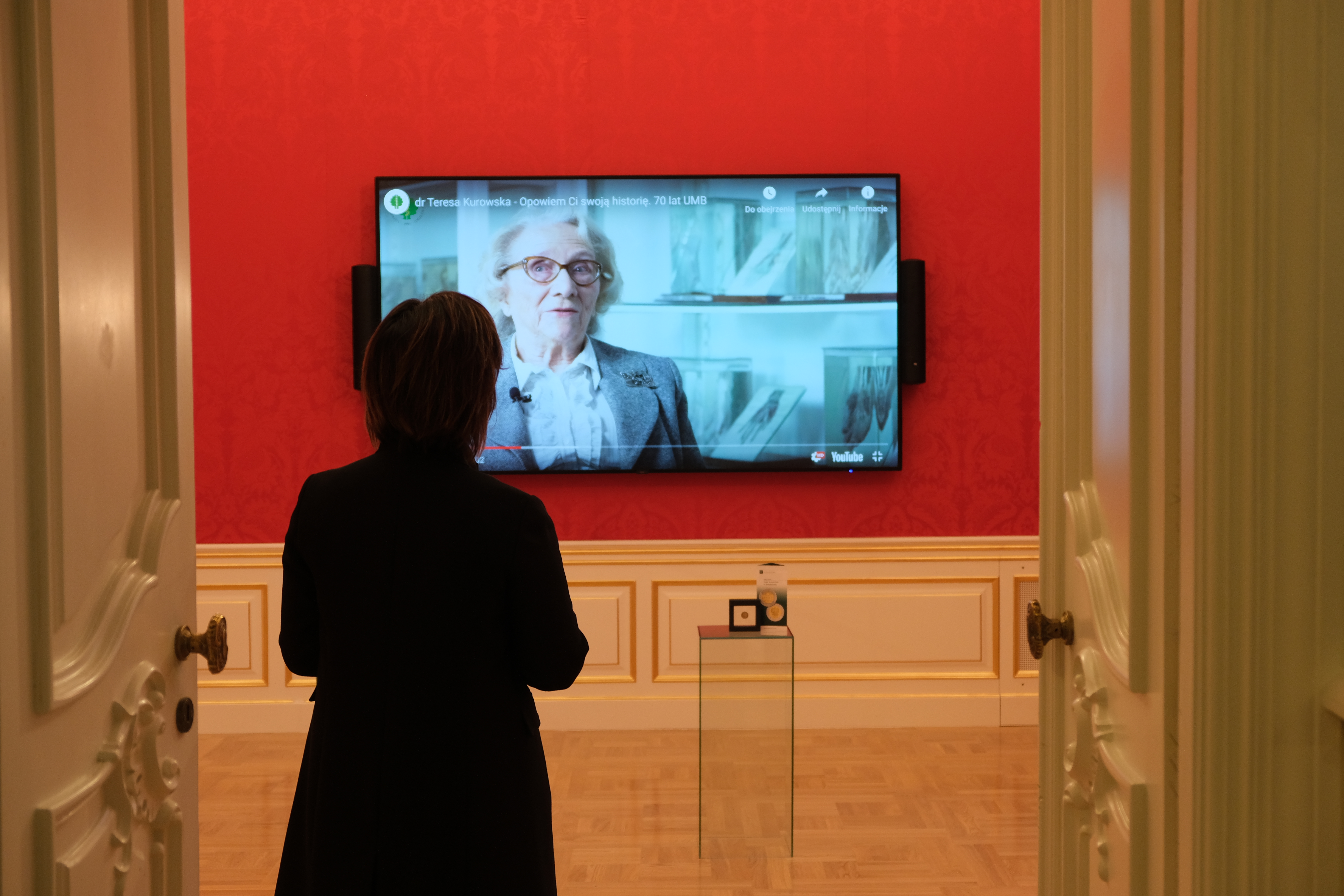 Aula Nobilium: skarbiec historii UMBPiękna i karmazynowa. Niegdyś to była sypialnia królewska, teraz będzie skarbcem historii naszych absolwentów | Galeria absolwentów AMB/UMBPałac Branickich to metafora wiedzy, wąż to Eskulap - znak medycyny, ciemne chmury to zmaganie się chorych z bólem. | ||