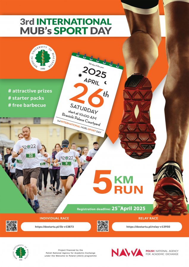 Uniwersytet Medyczny w Białymstoku serdecznie zaprasza wszystkich pracowników, studentów, doktorantów oraz absolwentów na trzecią edycję międzynarodowego wydarzenia integracyjnego 3rd International MUB's Sport Day!