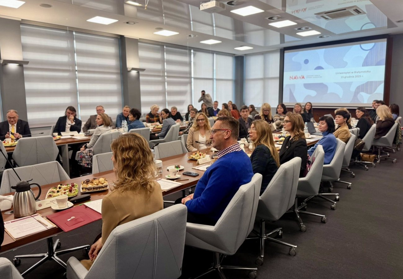 Przedstawiciele Działu Współpracy Międzynarodowej Uniwersytetu Medycznego w Białymstoku wzięli udział w spotkaniu rektorów uczelni oraz zespołów projektowych z przedstawicielami NAWA – Narodowej Agencji Wymiany Akademickiej, zorganizowanym przez Uniwersytet w Białymstoku w dniach 15-16.12.2025.