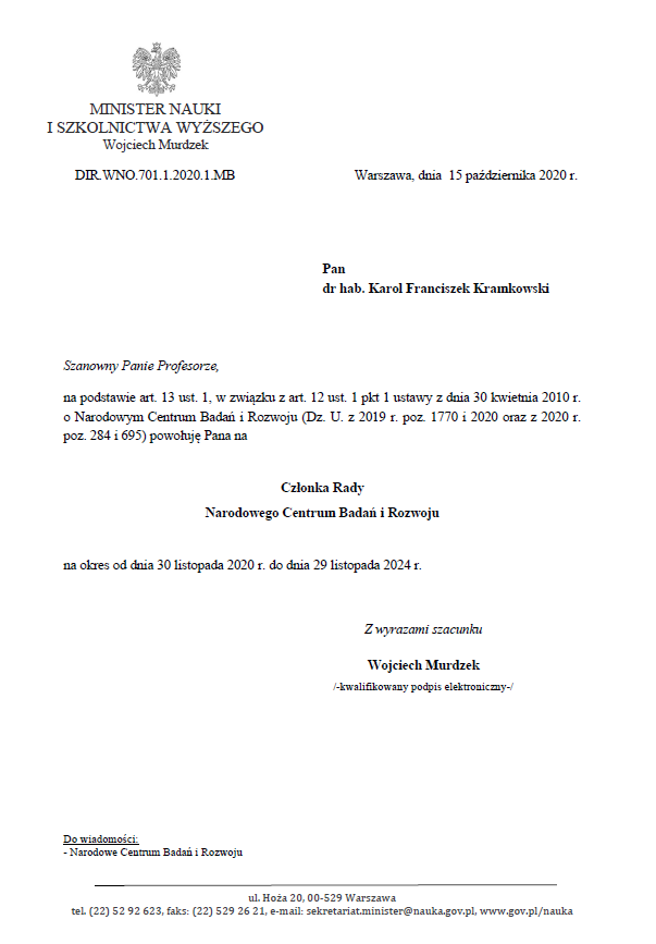 dr hab. Karol Kramkowski z Zakładu Chemii Fizycznej został powołany do Rady Narodowego Centrum Badań i Rozwoju na okres od dnia 30 listopada 2020 r. do dnia 29 listopada 2024r.