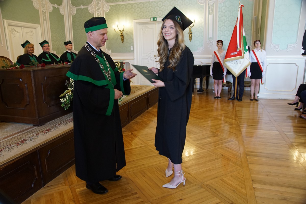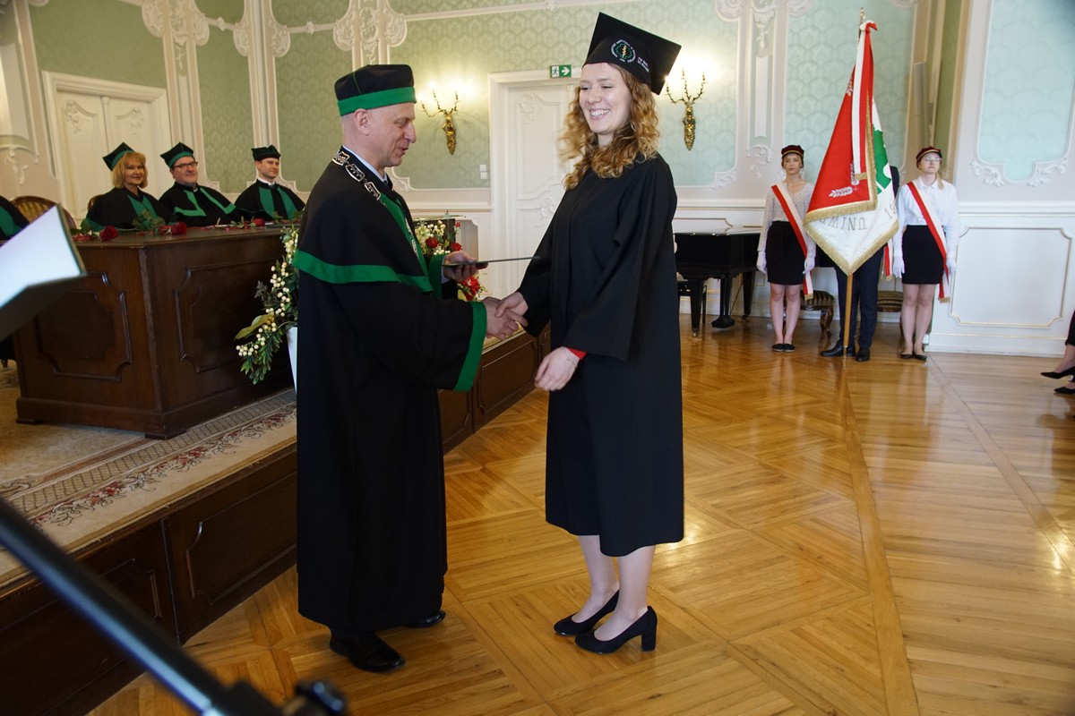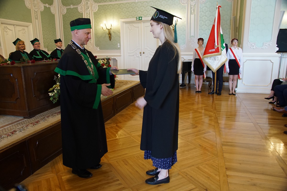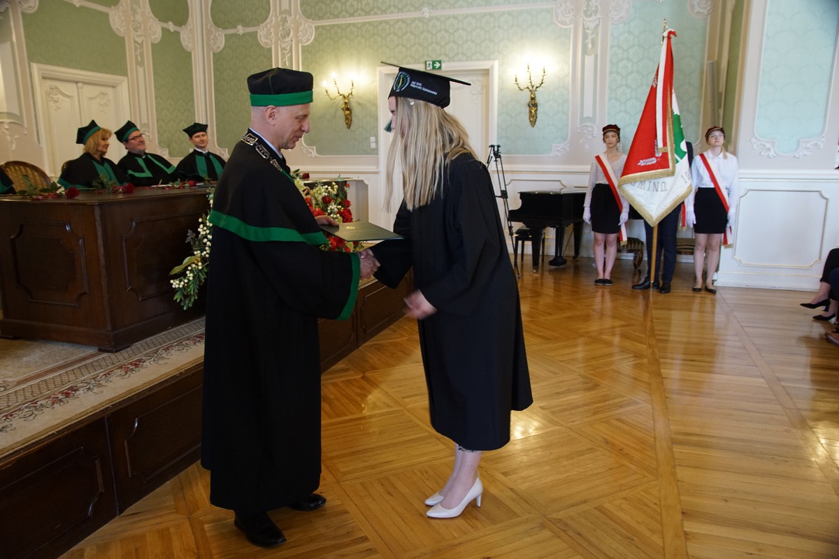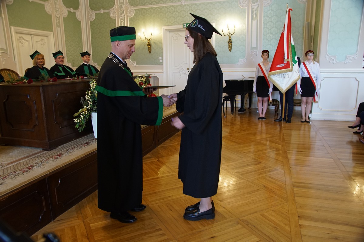Po przyrzeczeniu i wystąpieniu Chóru Dziekan, prof. dr hab. Wojciech Miltyk wraz z Prodziekan ds. Studenckich – dr hab. Anną Gromotowicz-Popławską imiennie gratulowali każdemu z wyczytywanych absolwentów i wręczyli dyplomy.