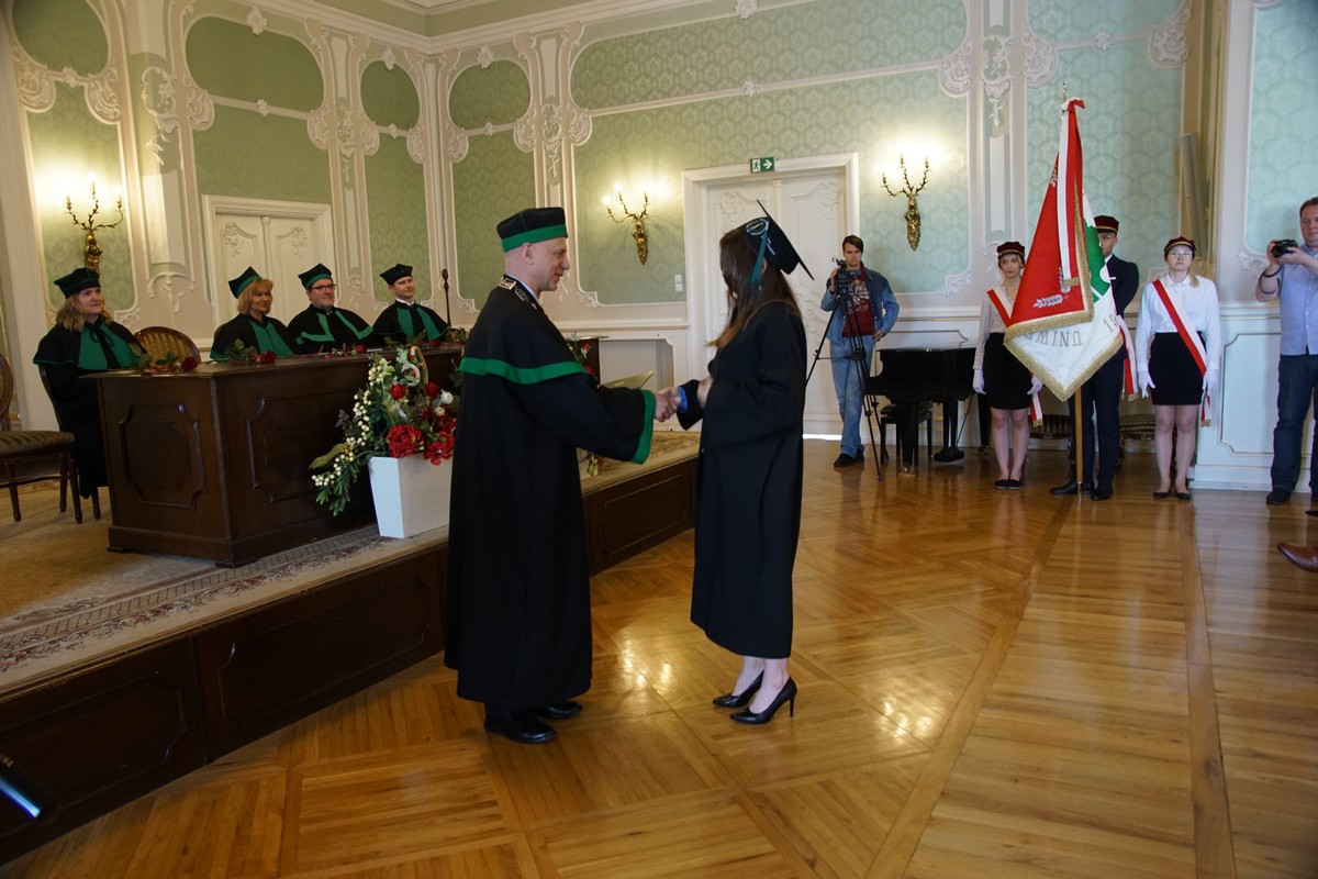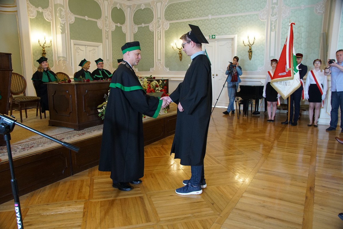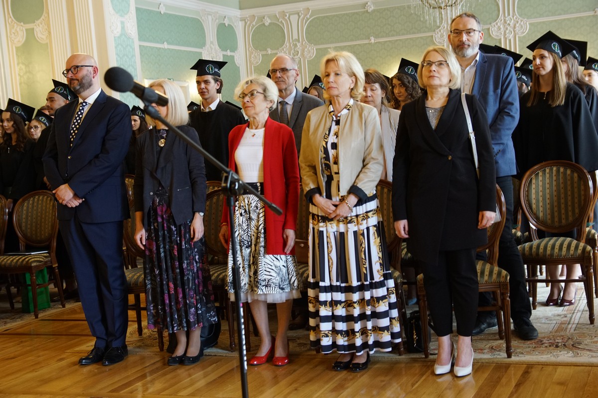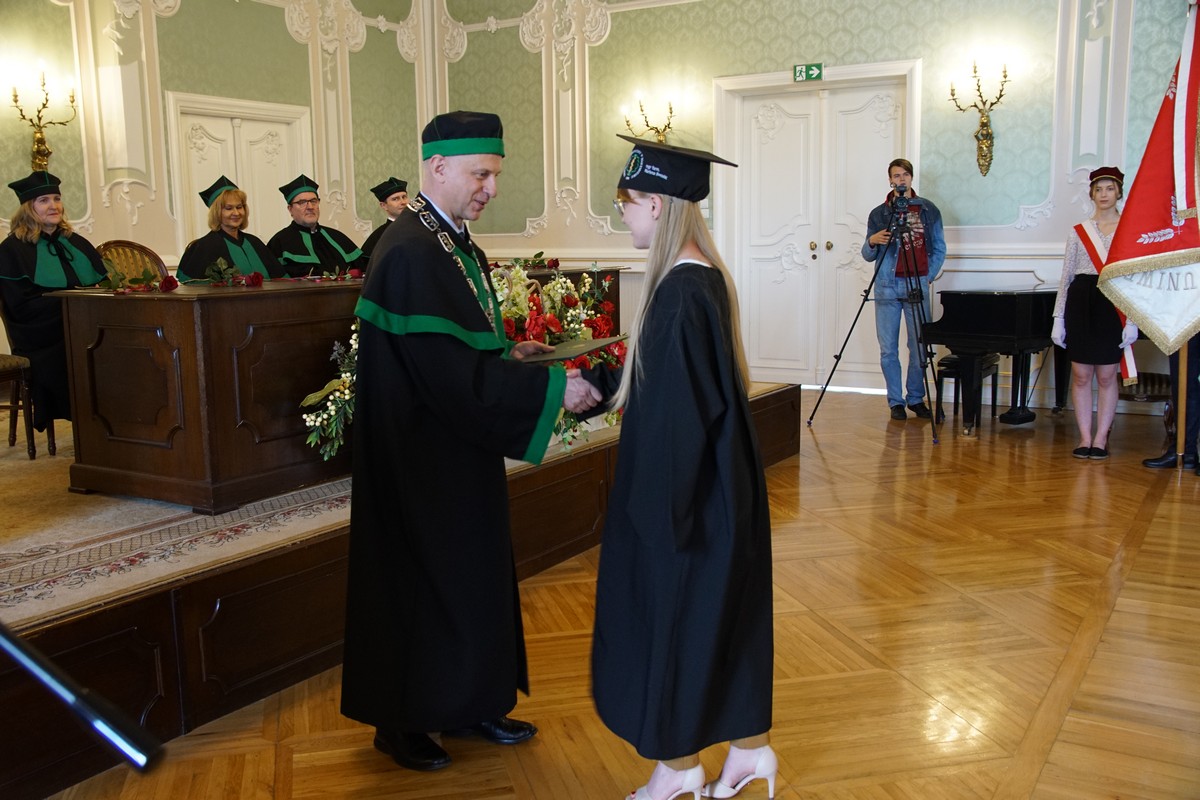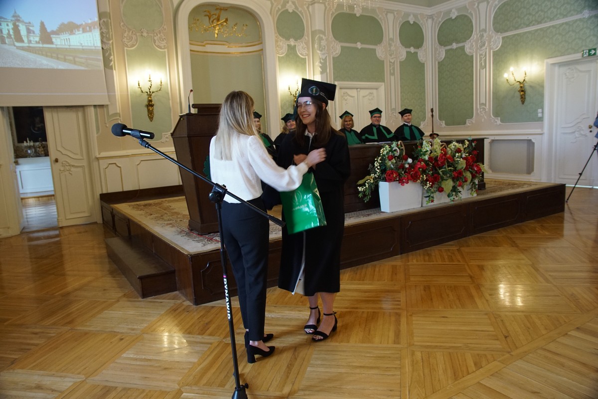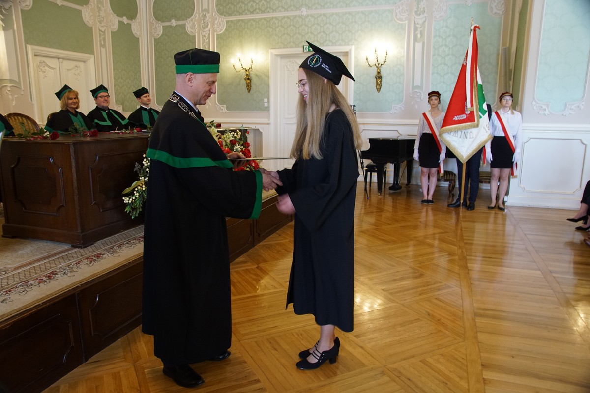 Po przyrzeczeniu i wystąpieniu Chóru Dziekan, prof. dr hab. Wojciech Miltyk wraz z Prodziekan ds. Studenckich – dr hab. Anną Gromotowicz-Popławską imiennie gratulowali każdemu z wyczytywanych absolwentów i wręczyli dyplomy.