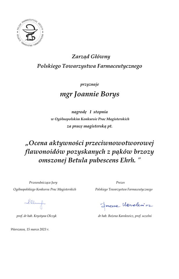 za pracę magisterską pt. "Ocena aktywności przeciwnowotworowej flawonoidów pozyskanych z pąków brzozy omszonej Betula pubescens Ehrh.".