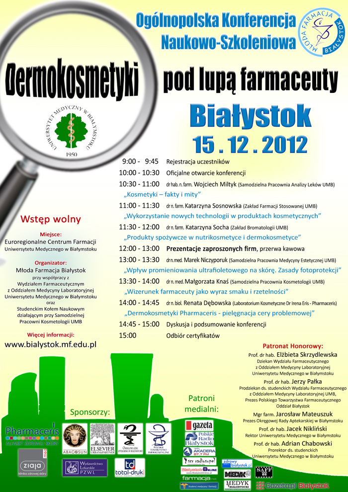 ul. Mickiewicza 2D 15-222 Białystok | Organizatorzy: Młoda Farmacja Białystok przy współpracy z Wydziałem Farmaceutycznym z Oddziałem Medycyny Laboratoryjnej i Studenckim Kołem Naukowym działającym przy Samodzielnej Pracowni Kosmetologii UMB