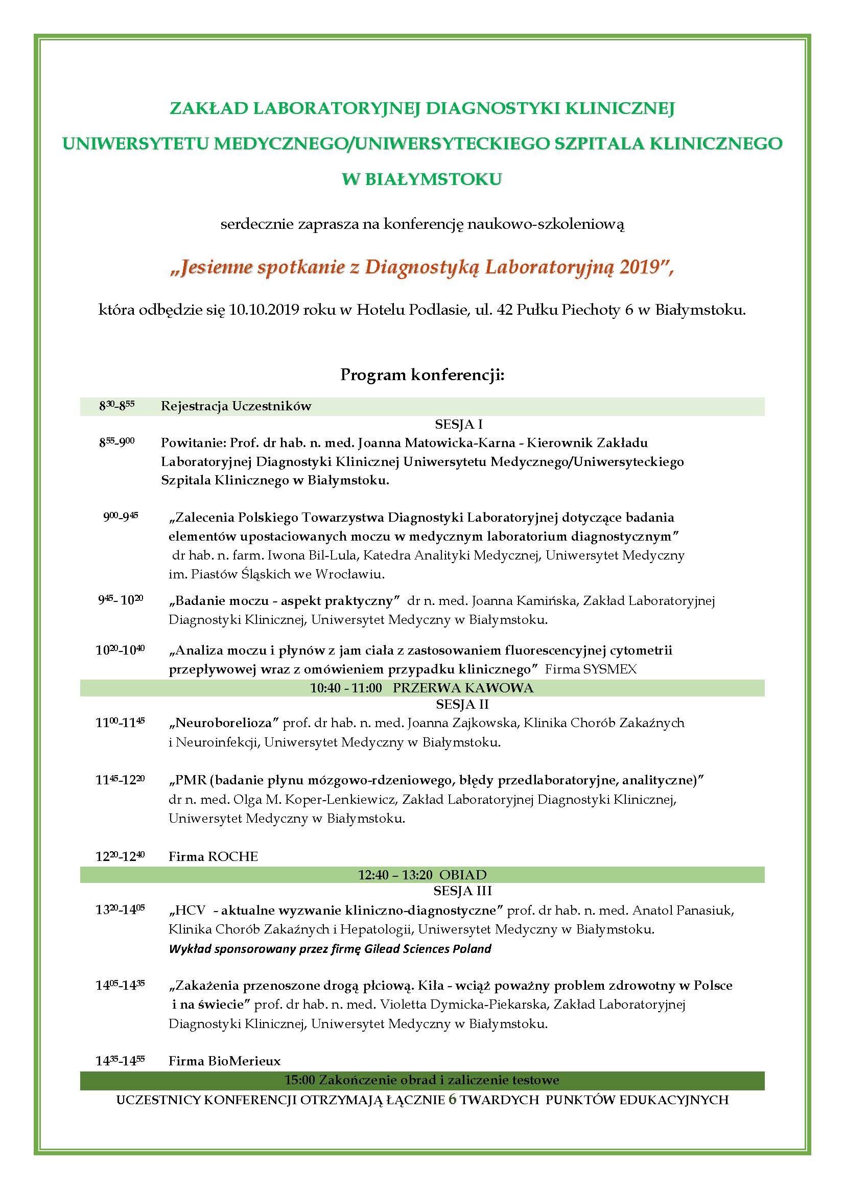 od godz. 08:30 | Konferencja „Jesienne spotkanie | Hotel Podlasie, ul. 42 Pułku Piechoty 6 Białymstoku | Organizatorzy: Zakład Laboratoryjnej Diagnostyki Klinicznej tel. 831 8584, e-mail: zldk@umb.edu.pl |